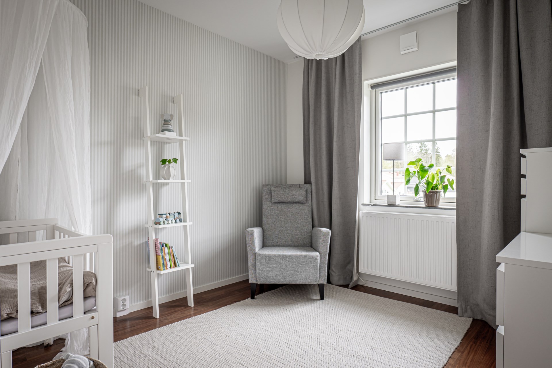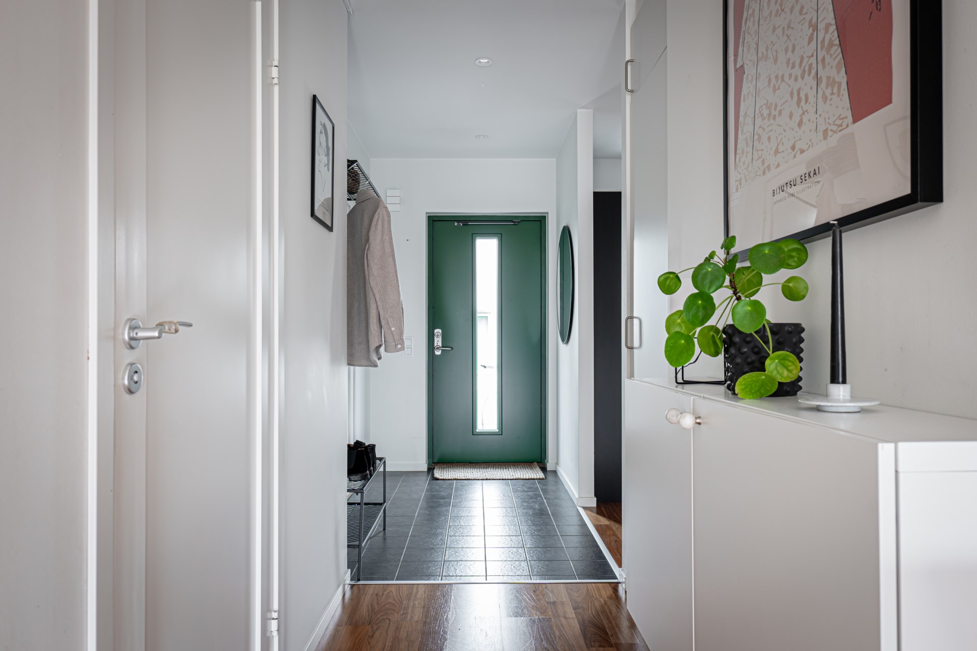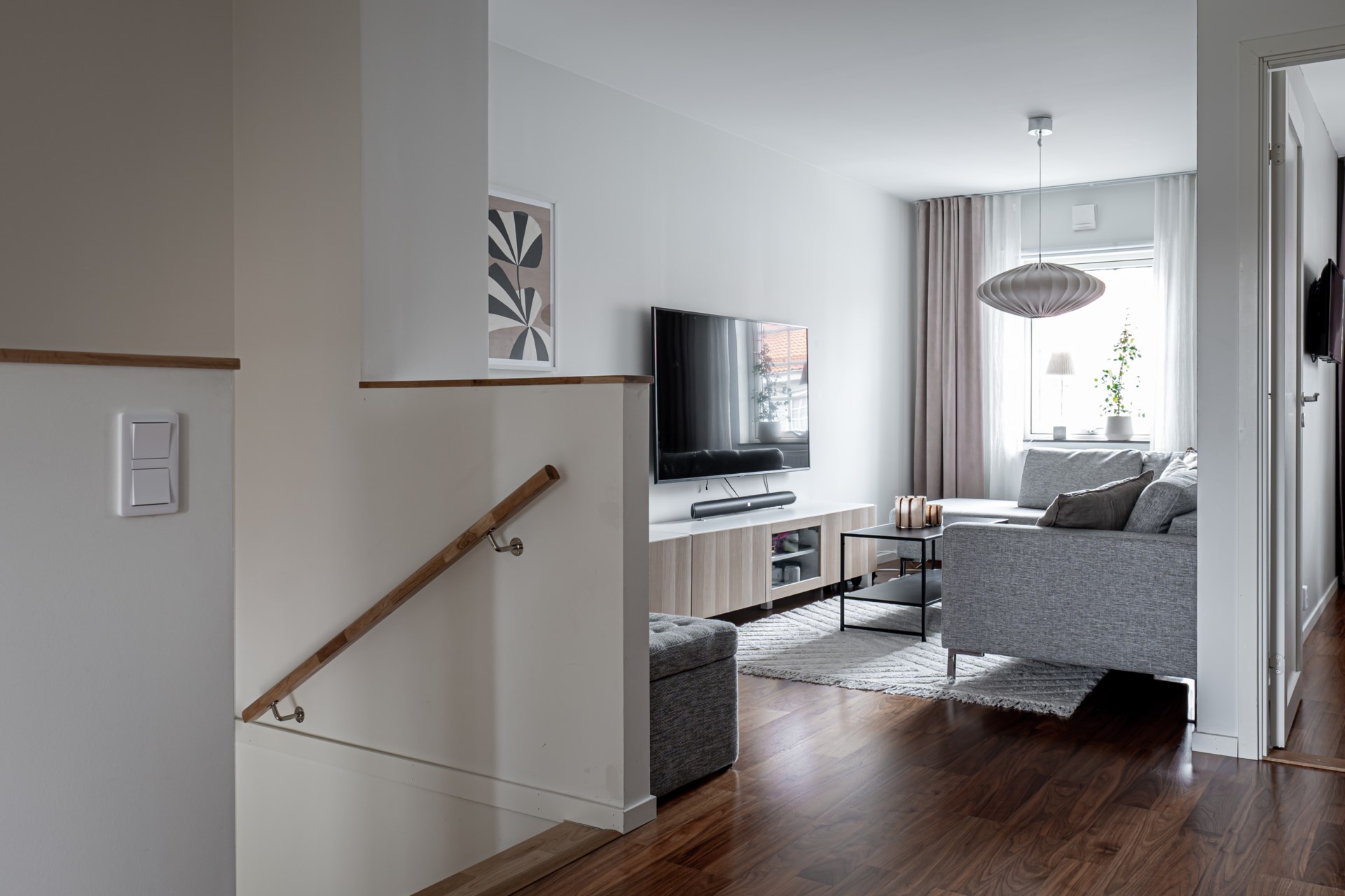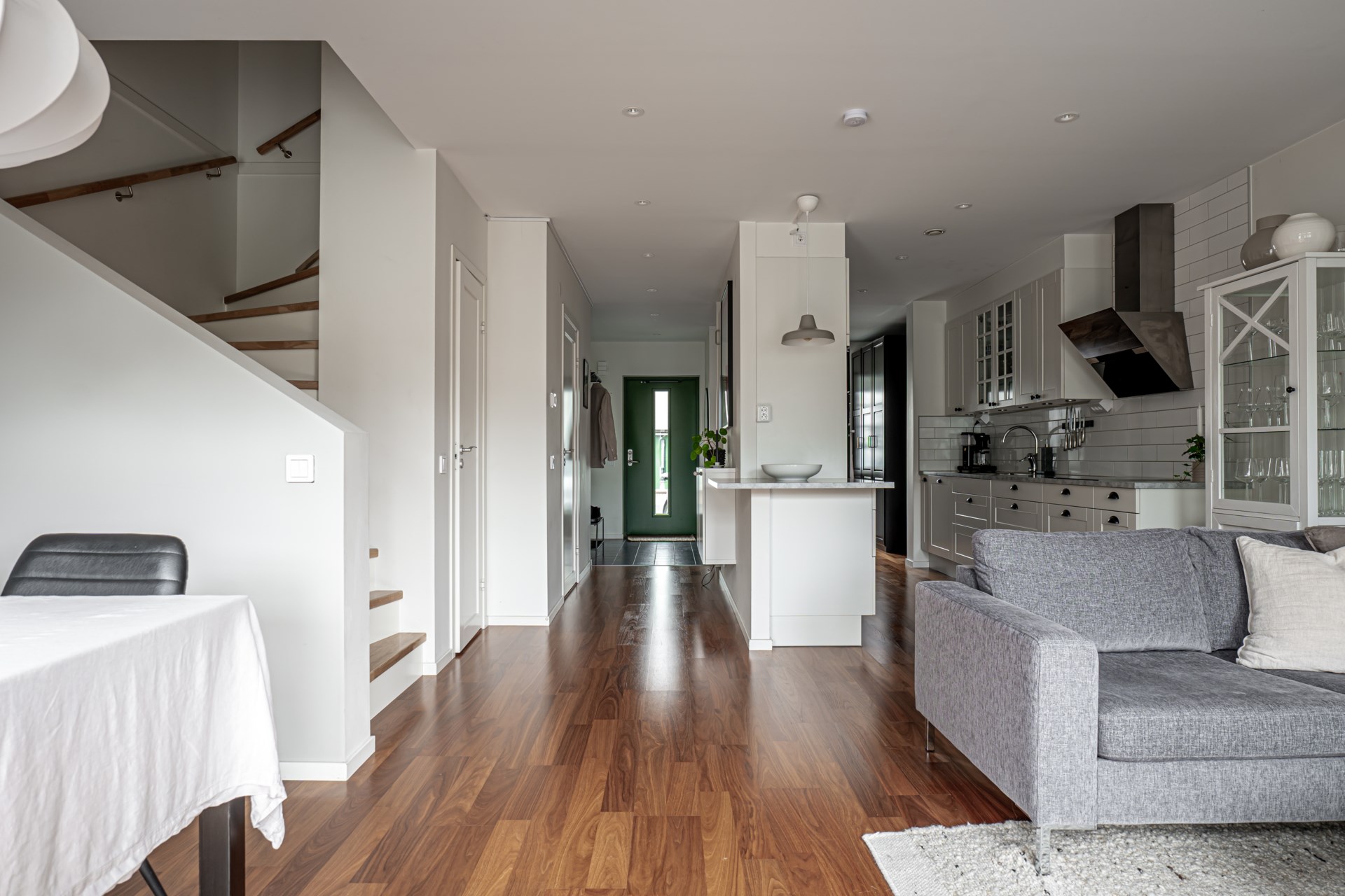 - Allmän beskrivning: Välkommen in i en praktisk hall med klinkergolv och ljusa väggar. Direkt till höger finner ni tvättstugan och sedan det första badrummet. Till vänster om hallen finner ni en matplats men som idag används som extra förvaringsplats med fem stycken garderober. Ni kommer sedan till det fina köket som öppnar upp sig mot vardagsrummet. Vardagsrummet har ett härligt ljusinsläpp genom de stora fönstren ut mot trädgården. I vardagsrummet finns det möjlighet att möblera med både soffgrupp och matgrupp. Från vardagsrummet kan ni öppna upp mot altanen och baksidan som vetter mot söder. Under trappan har ni ett förråd som ger er extra med förvaring. Tar ni sedan trappan upp till andra våningen har ni först ett mysigt allrum med plats för soffa och tv. Här uppe har ni sedan tre sovrum samlade. Det större sovrum har plats för en dubbelsäng, här inne finns även en skjutdörrsgarderob. På övre plan har ni även det andra badrummet och en klädkammare.