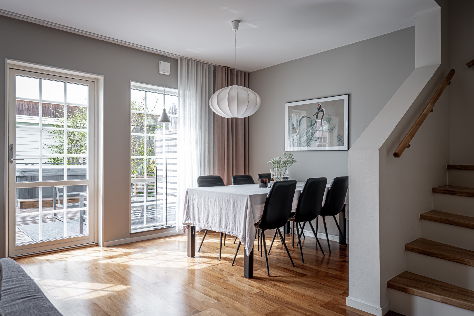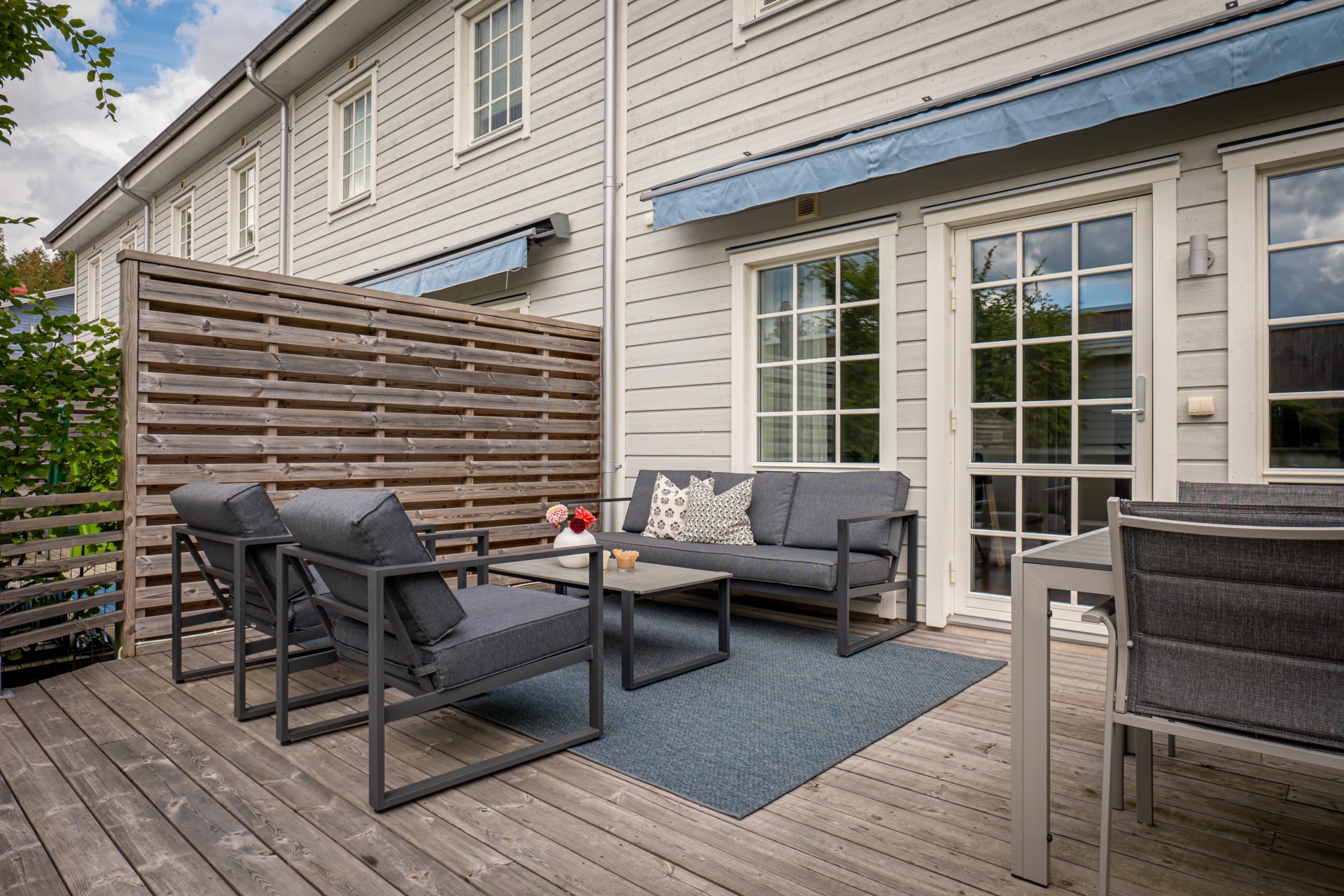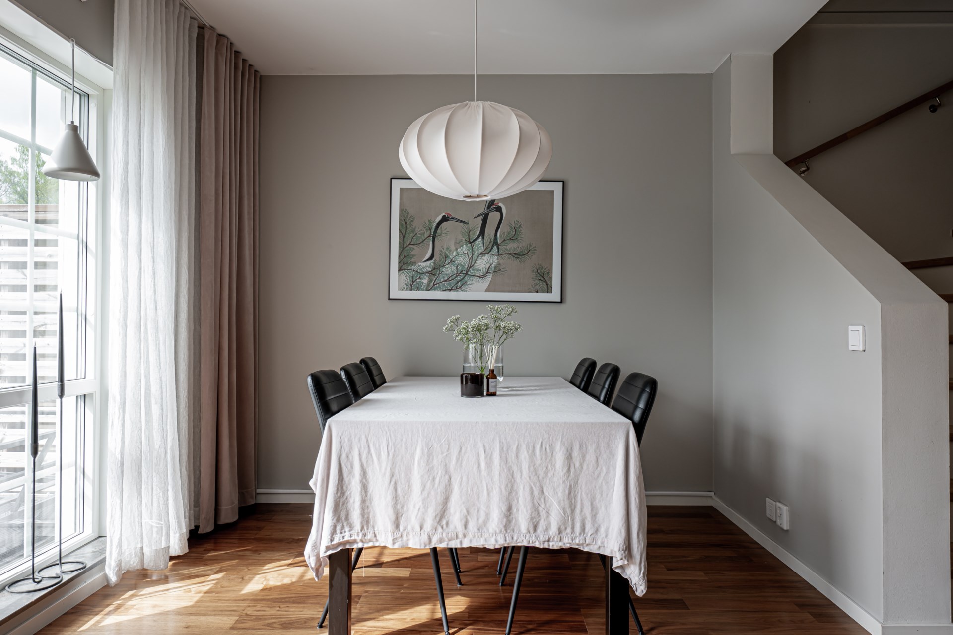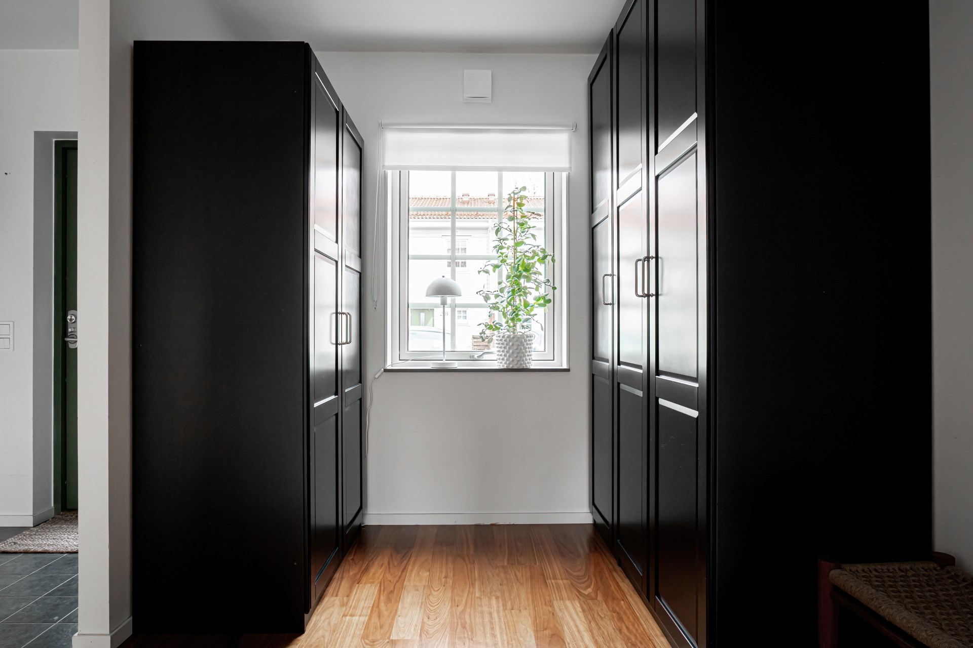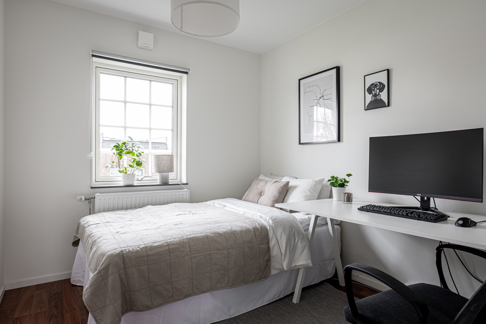 - Allmän beskrivning: Välkommen in i en praktisk hall med klinkergolv och ljusa väggar. Direkt till höger finner ni tvättstugan och sedan det första badrummet. Till vänster om hallen finner ni en matplats men som idag används som extra förvaringsplats med fem stycken garderober. Ni kommer sedan till det fina köket som öppnar upp sig mot vardagsrummet. Vardagsrummet har ett härligt ljusinsläpp genom de stora fönstren ut mot trädgården. I vardagsrummet finns det möjlighet att möblera med både soffgrupp och matgrupp. Från vardagsrummet kan ni öppna upp mot altanen och baksidan som vetter mot söder. Under trappan har ni ett förråd som ger er extra med förvaring. Tar ni sedan trappan upp till andra våningen har ni först ett mysigt allrum med plats för soffa och tv. Här uppe har ni sedan tre sovrum samlade. Det större sovrum har plats för en dubbelsäng, här inne finns även en skjutdörrsgarderob. På övre plan har ni även det andra badrummet och en klädkammare.