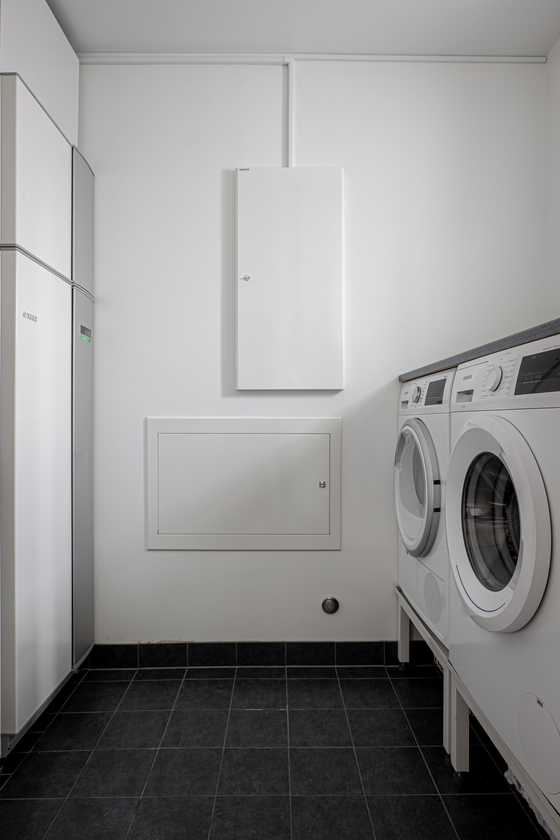 - Tvättstuga: Tvättstuga med klinkergolv och vitmålade väggar. Här inne finner ni värmepumpen, en tvättmaskin och en torktumlare.