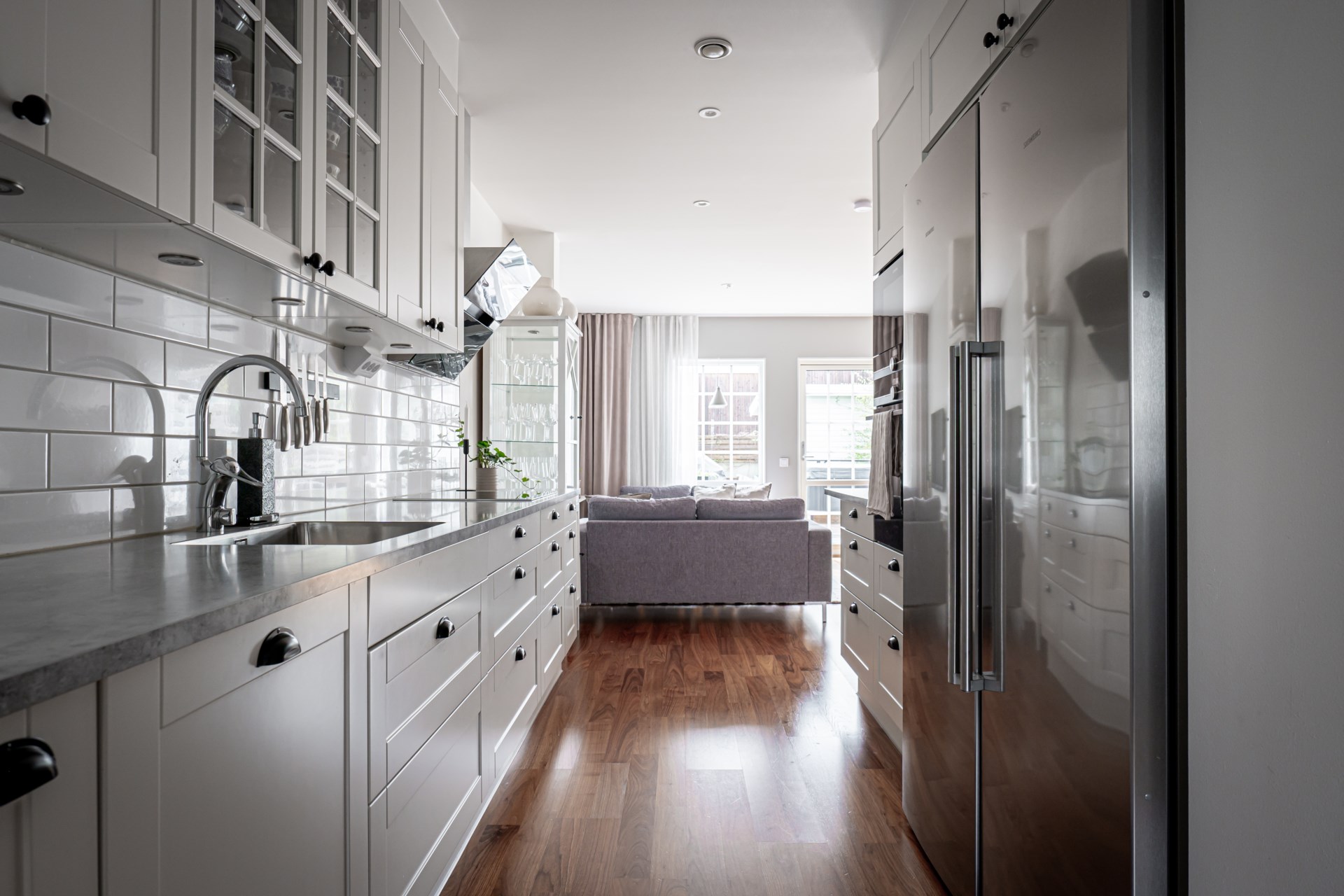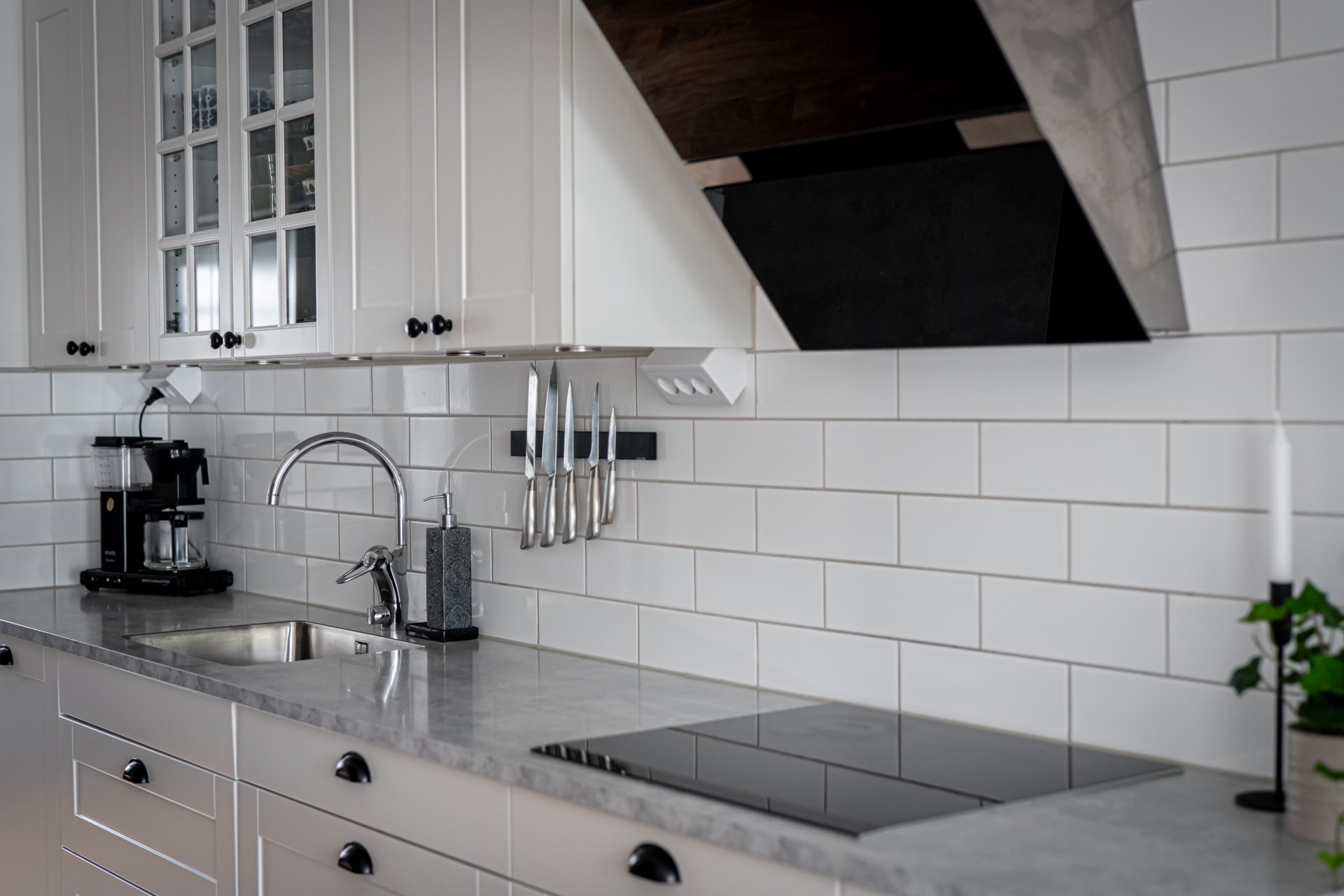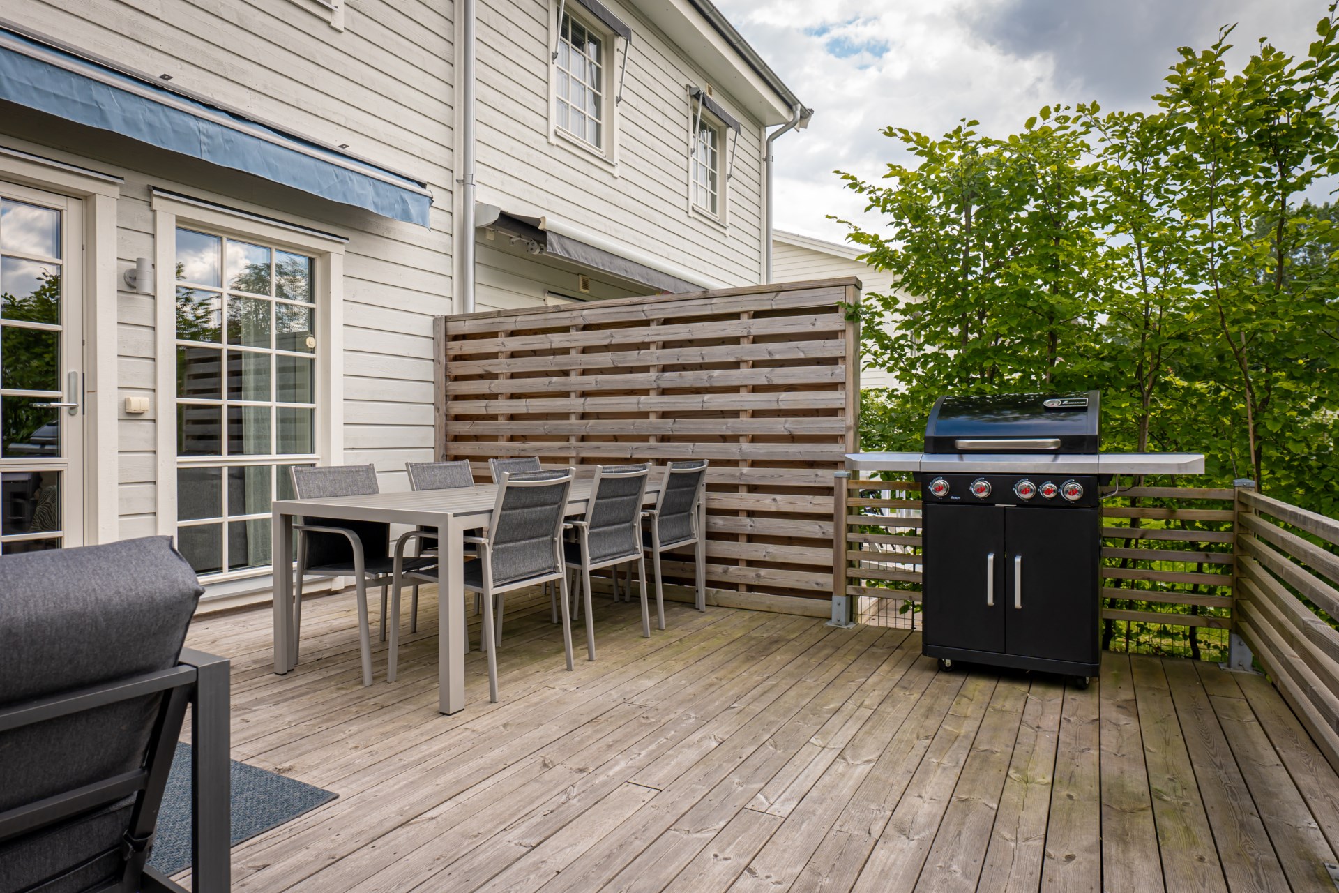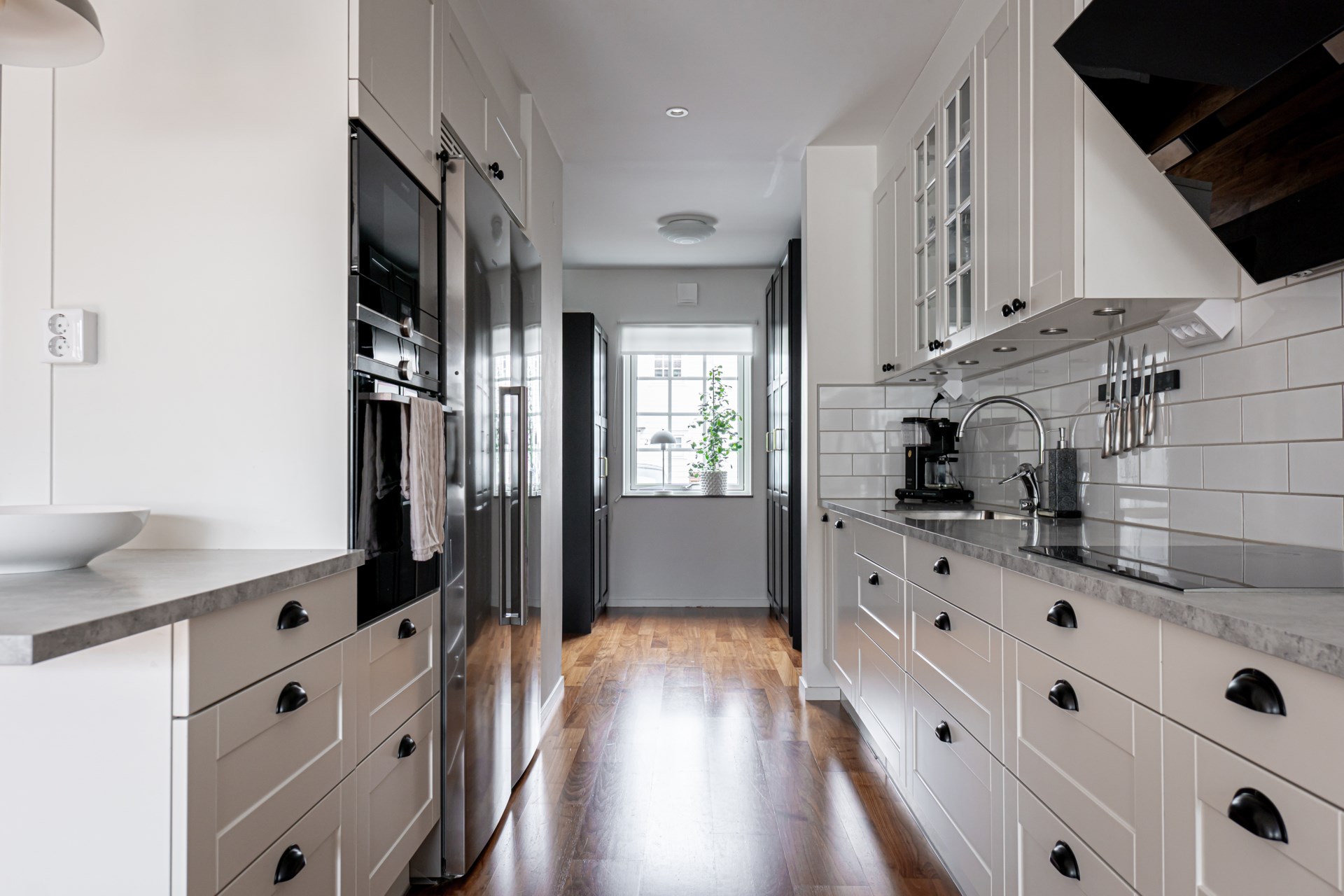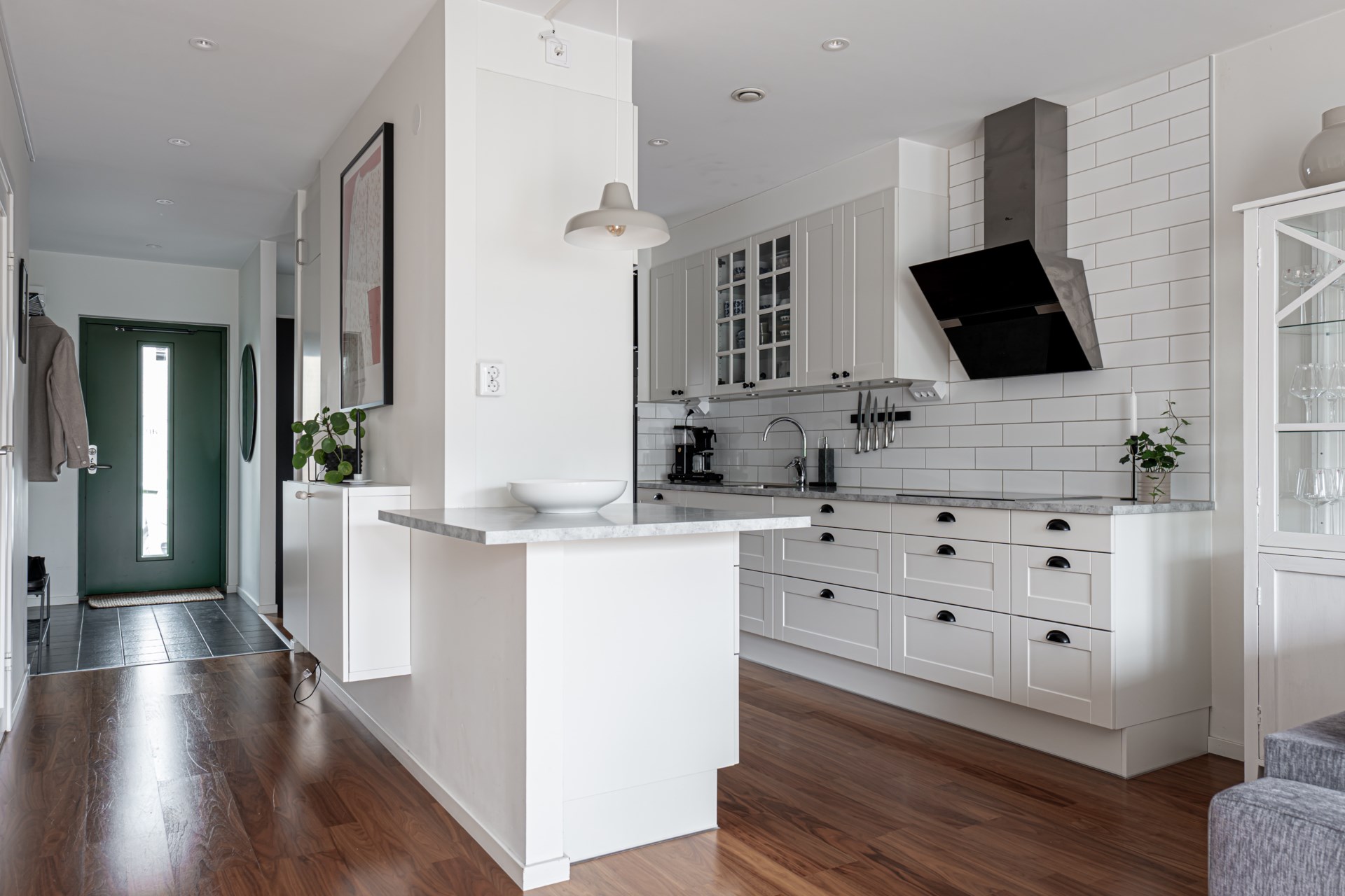 - Kök: Köket är genomtänkt och har bra bänkyta för helgens och vardagarnas maträtter. Köket har vitt skåpsinrede med en ljusgrå bänkskiva. Köket är utrustat med spishäll, fläkt, integrerad diskmaskin, inbyggd ugn och micro samt kyl och frys i fullhöjd.