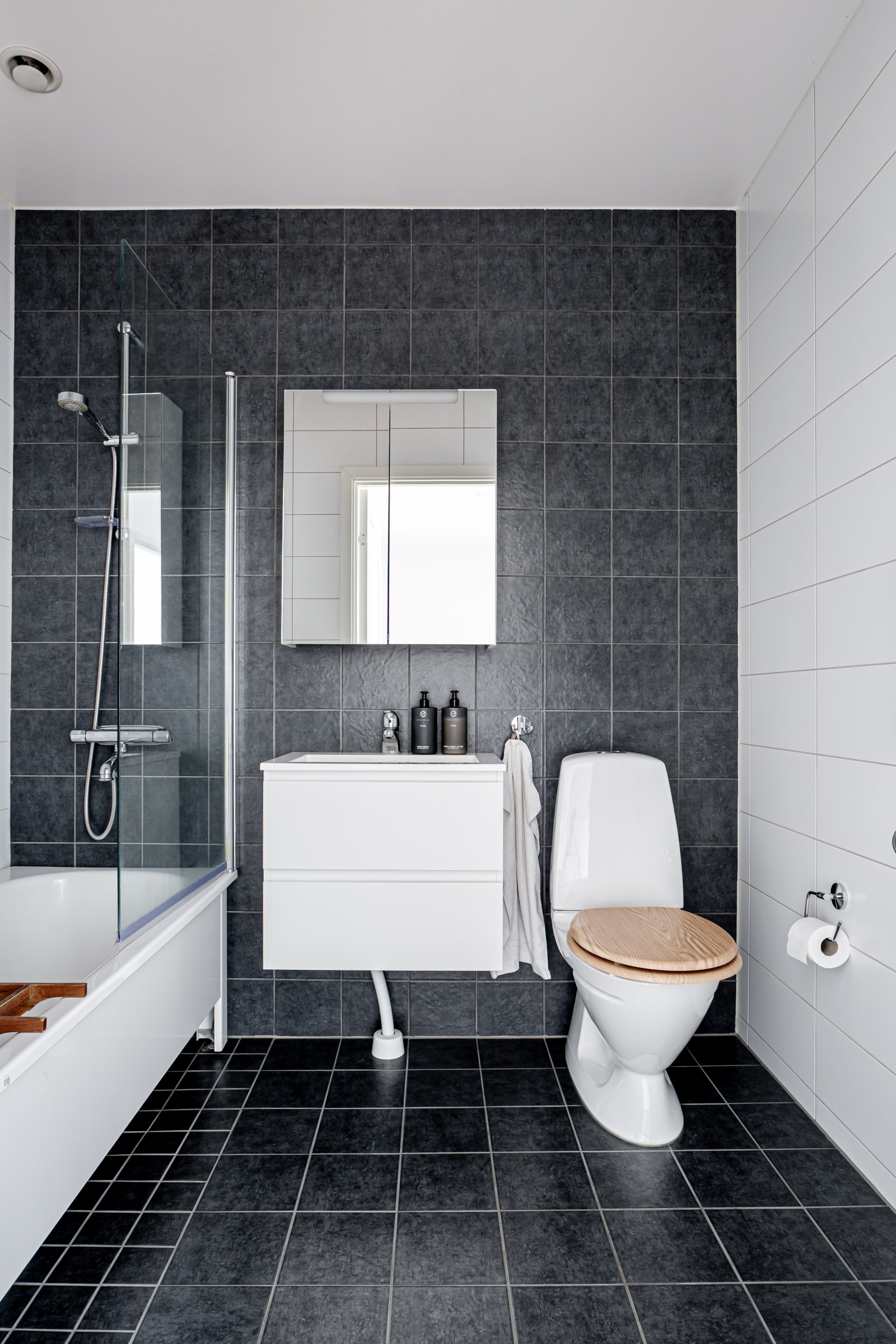 - Badrum: Även badrummet på övre plan är helkaklat med klinkergolv. I detta badrum har ni wc, kommod, spegelskåp och badkar.