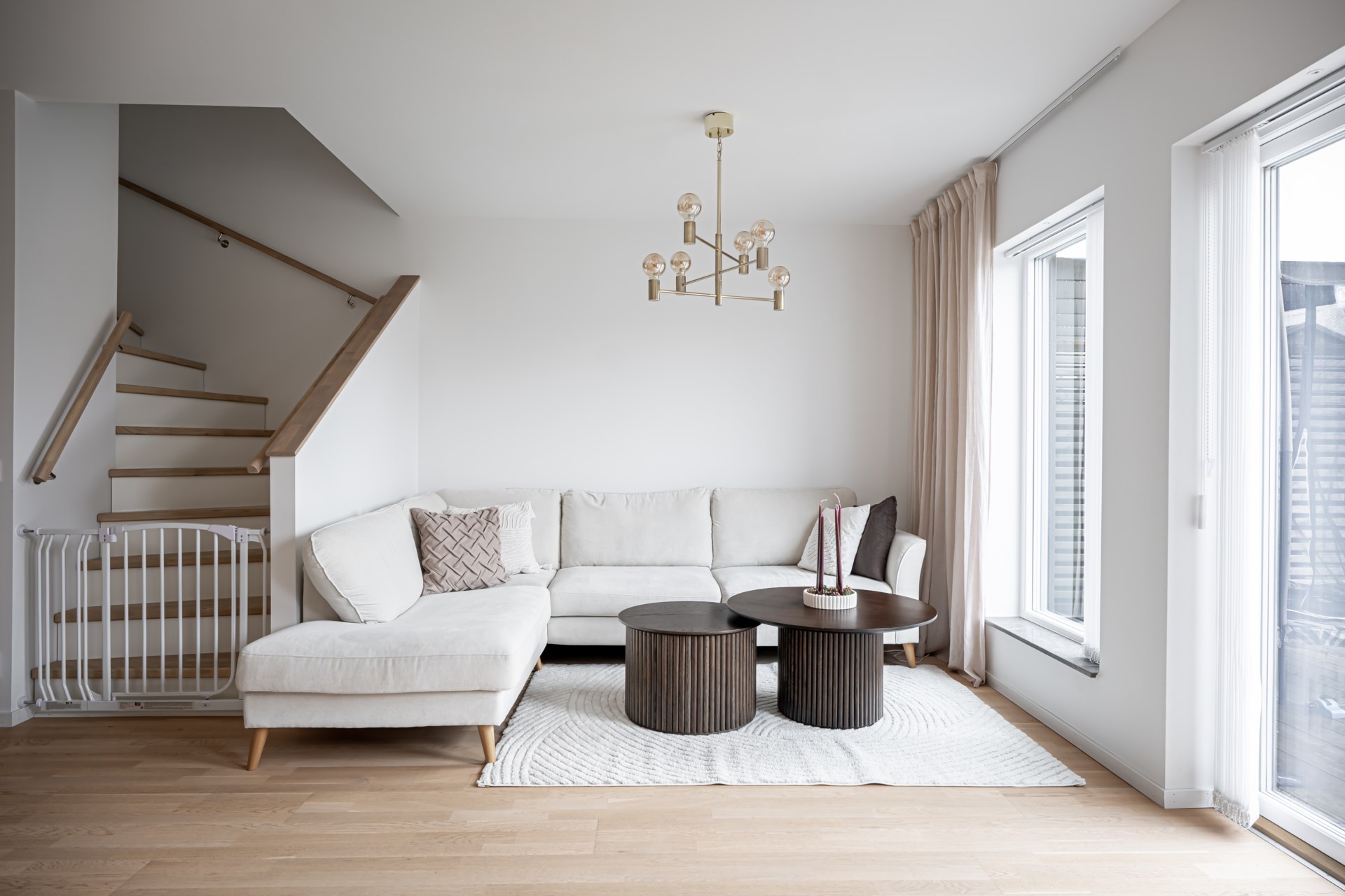 Vidare in öppnar huset upp sig med ett kök och vardagsrum i fin harmoni, en social planlösning som passar perfekt för både vardag och umgänge. De enhetliga golven och de ljusa väggarna skapar ett lugnt och sammanhållet uttryck. Vardagsrummet har ett generöst ljusinsläpp från stora fönster mot trädgården och ger gott om plats för både soffgrupp och matbord.