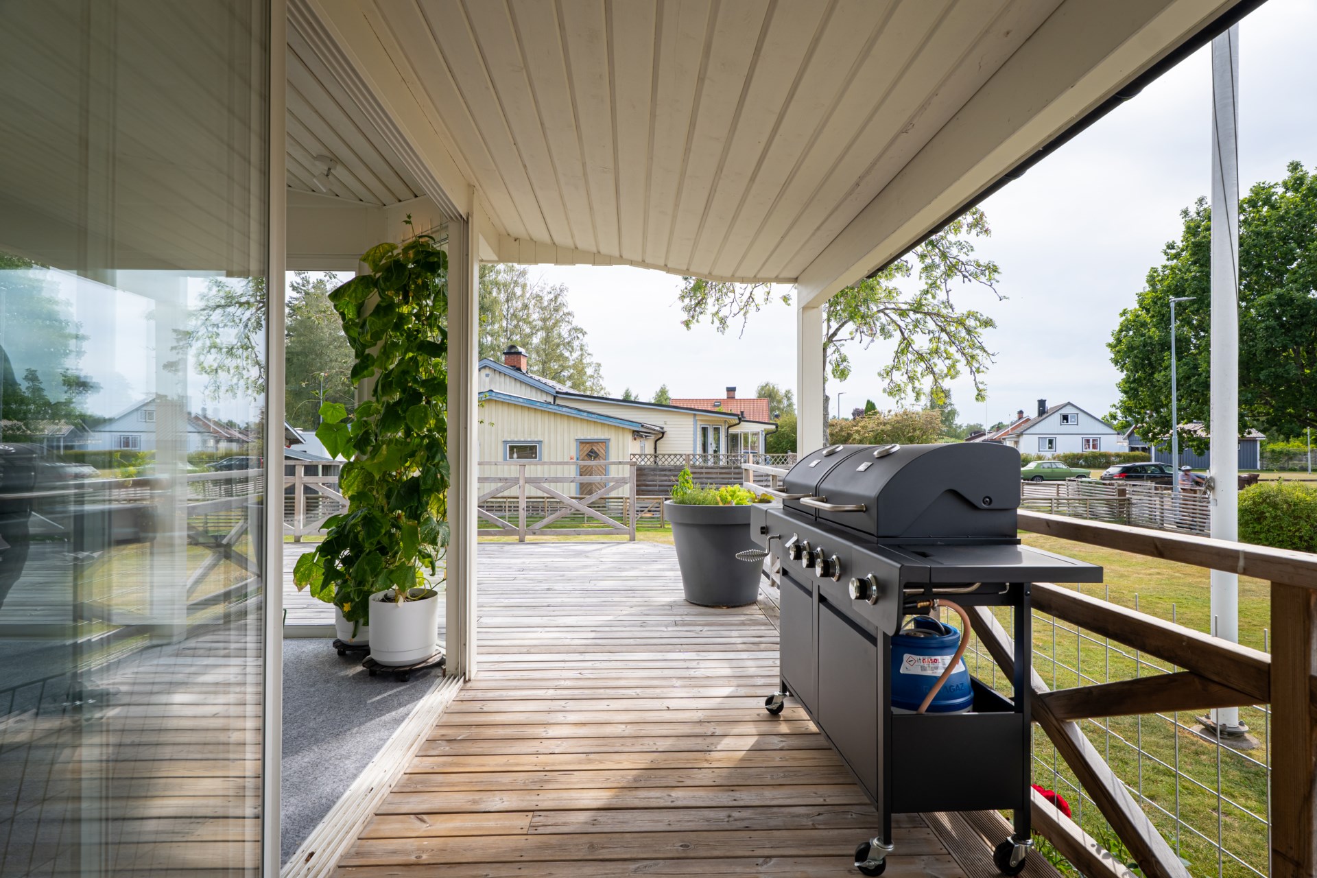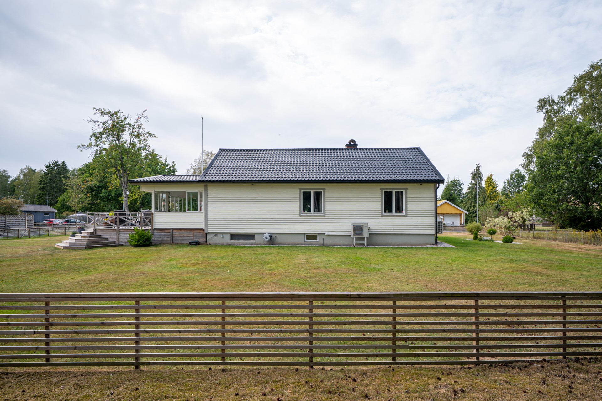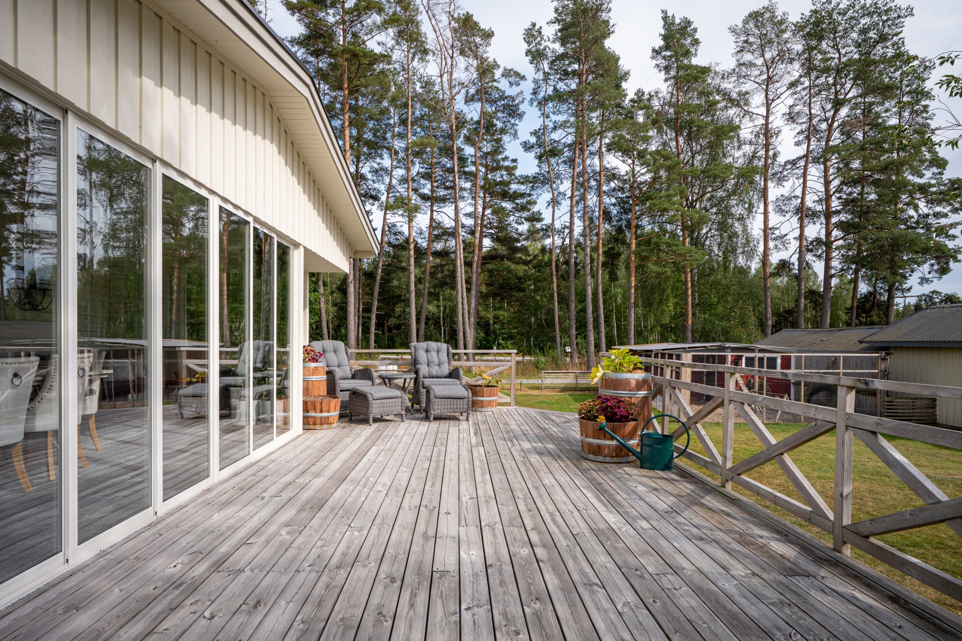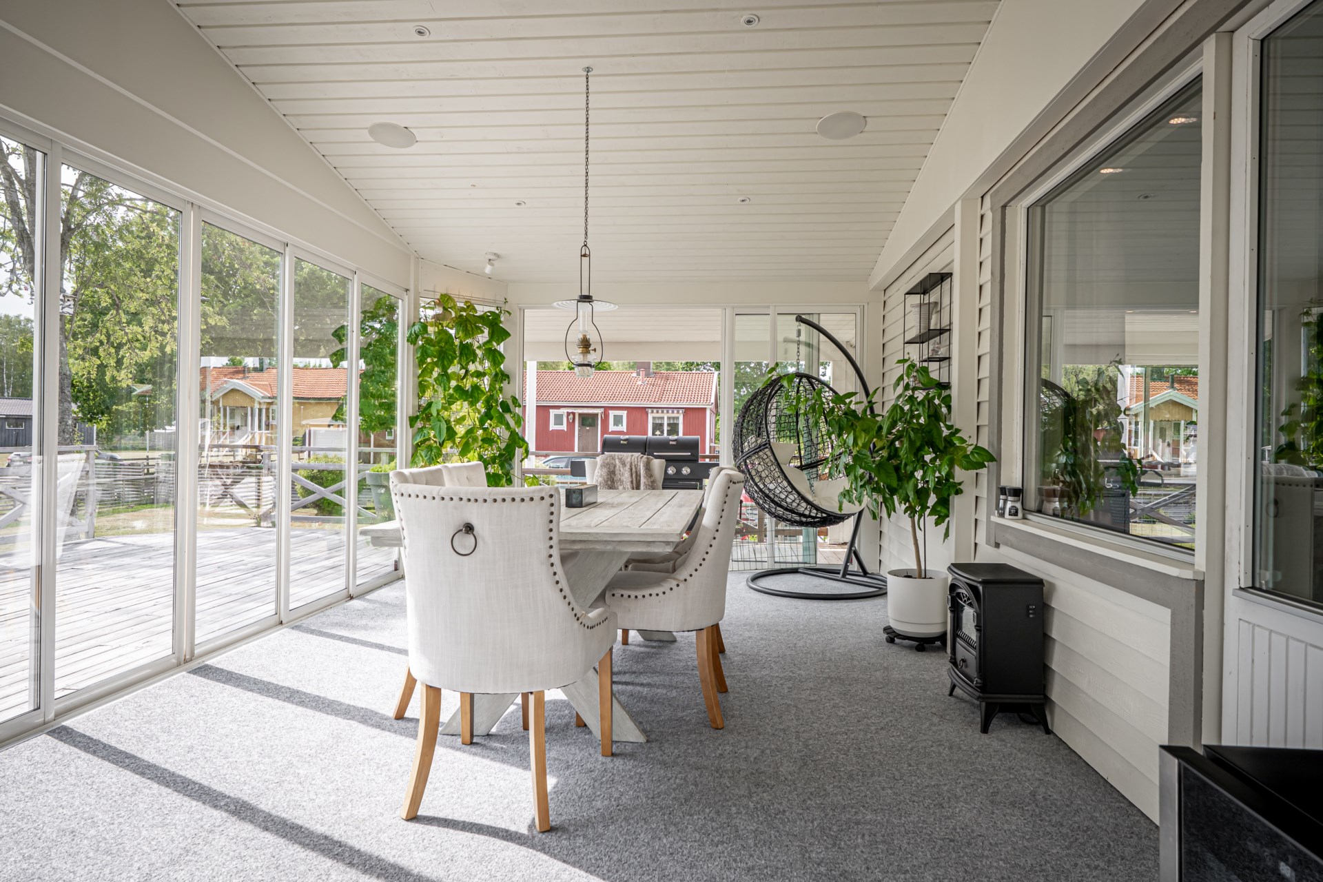 En av husets stora fördelar är det härliga uterummet som blir en naturlig förlängning av bostaden. Här kan du umgås med nära och kära, njuta av middagar under ljumma kvällar eller bara slå dig ner med en bok medan du blickar ut mot den grönskande trädgården.