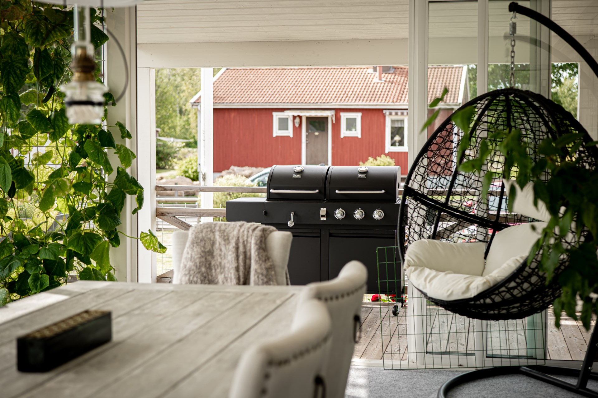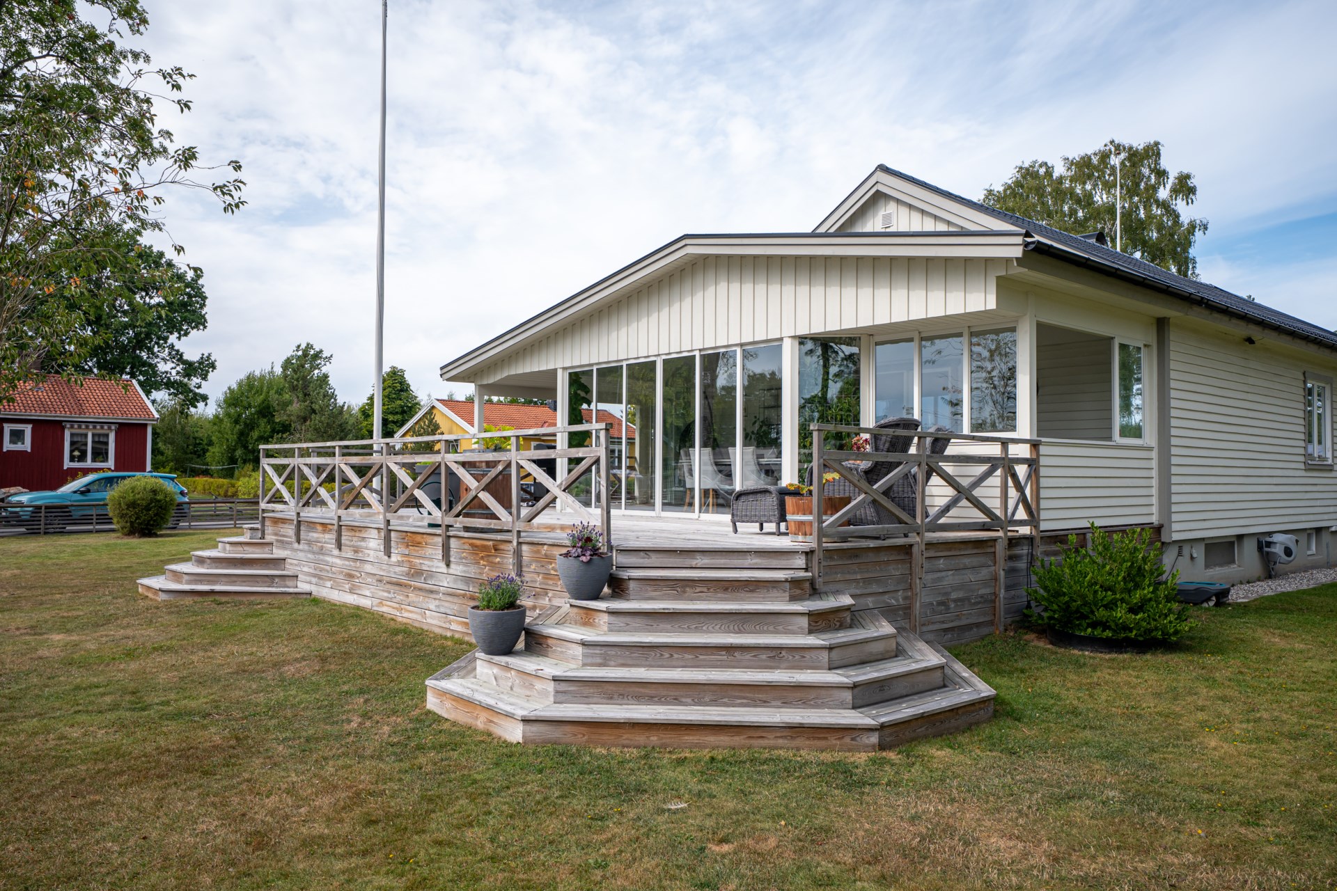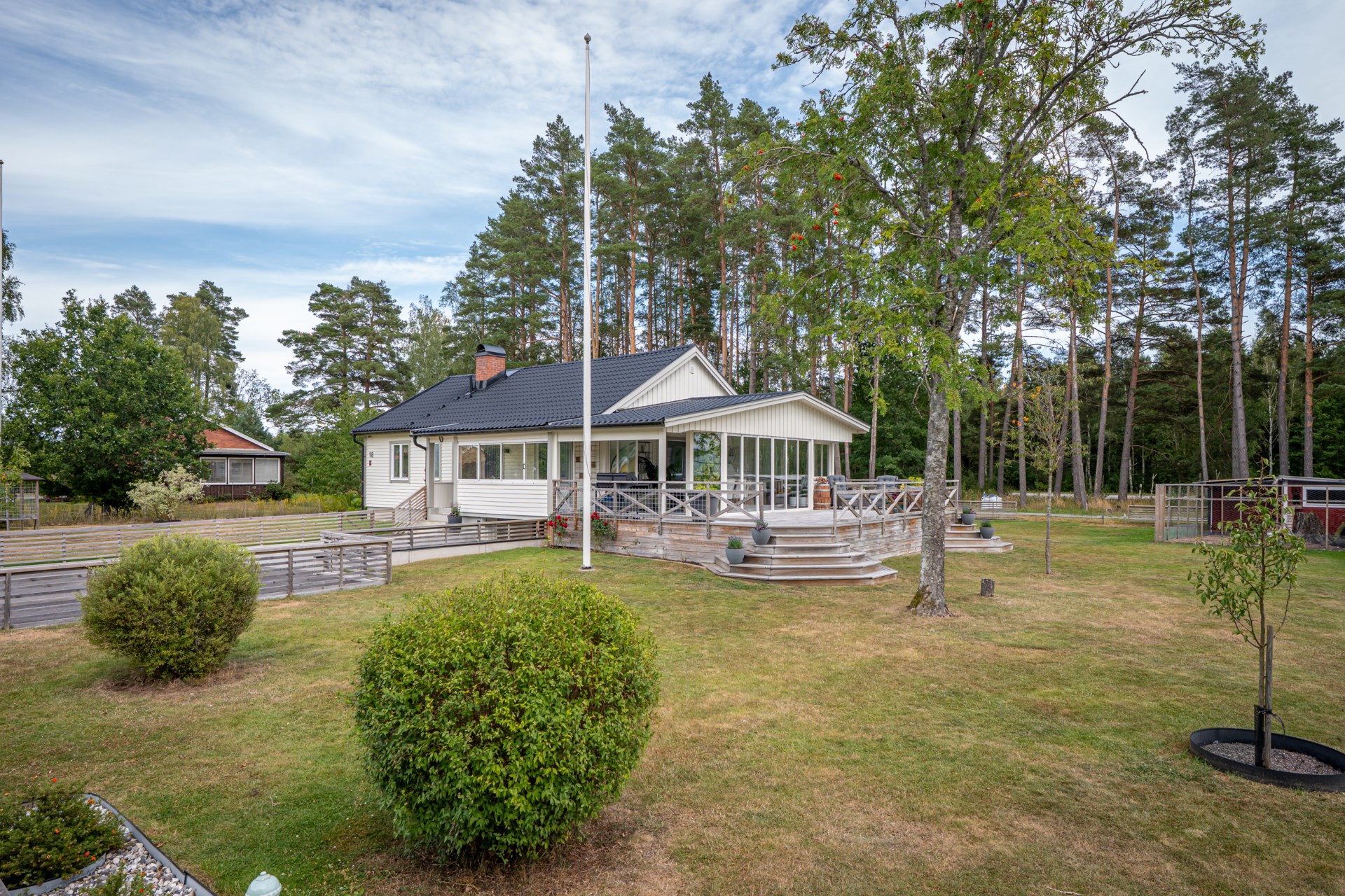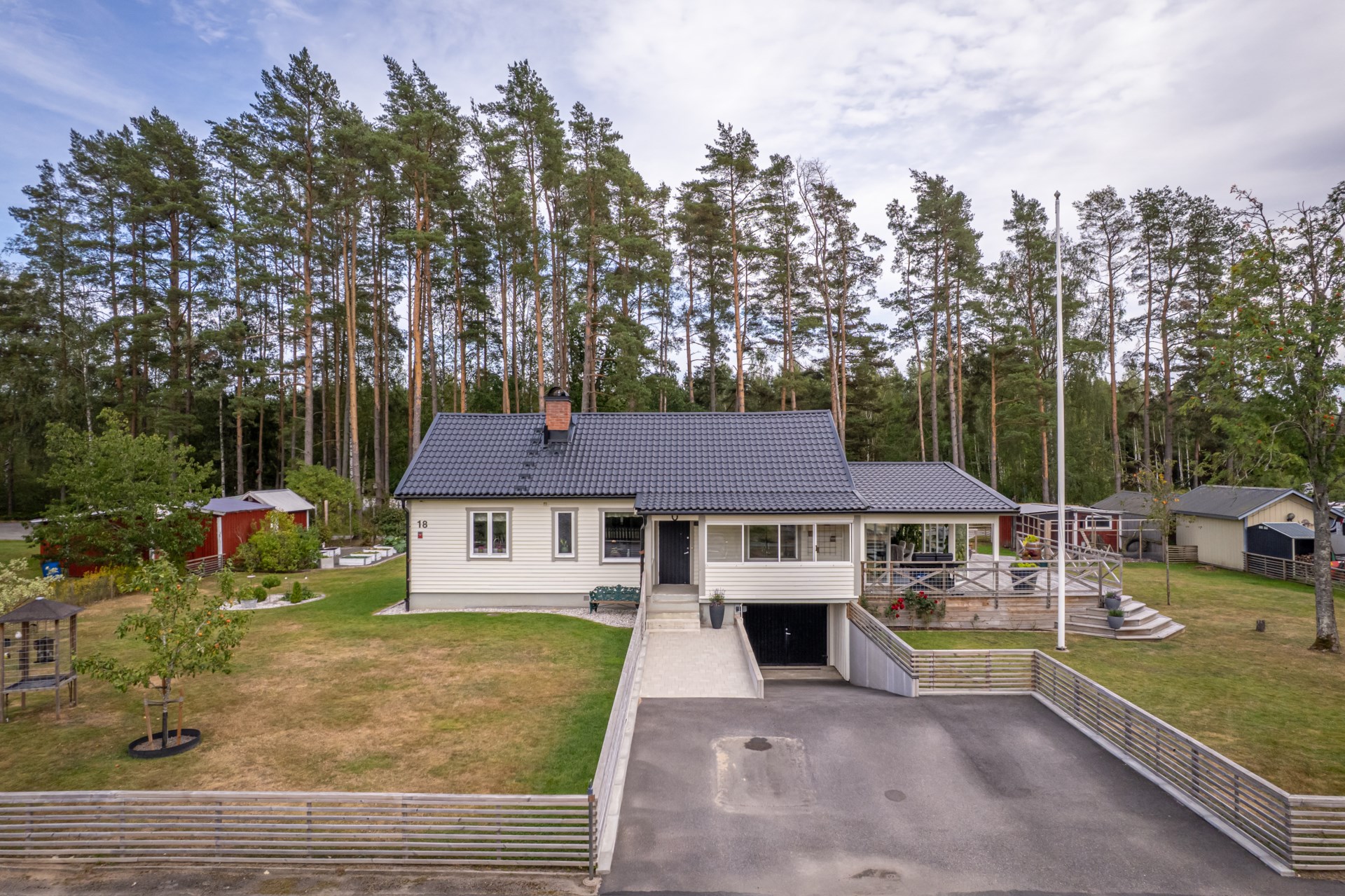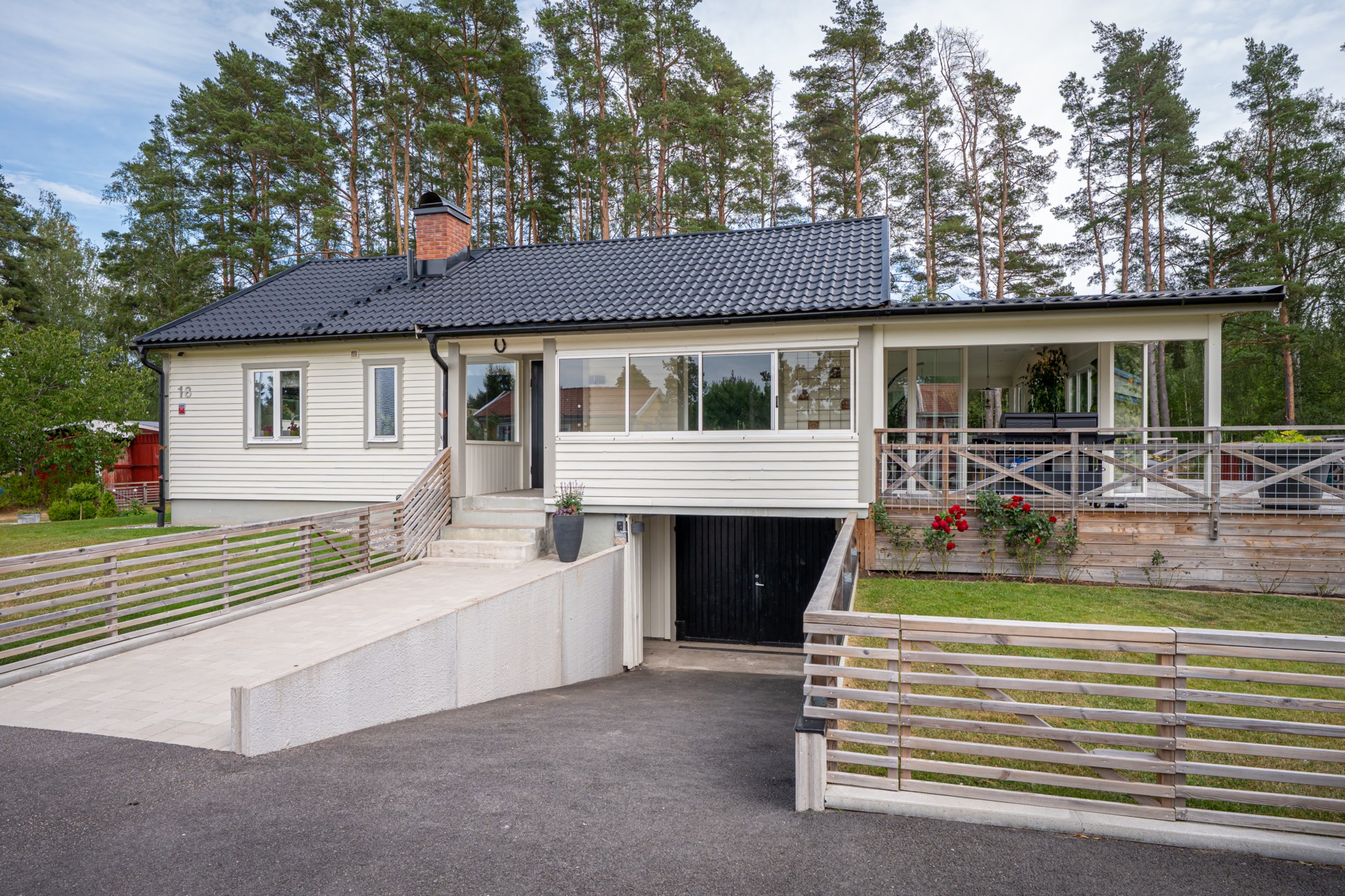 En av husets stora fördelar är det härliga uterummet som blir en naturlig förlängning av bostaden. Här kan du umgås med nära och kära, njuta av middagar under ljumma kvällar eller bara slå dig ner med en bok medan du blickar ut mot den grönskande trädgården.
