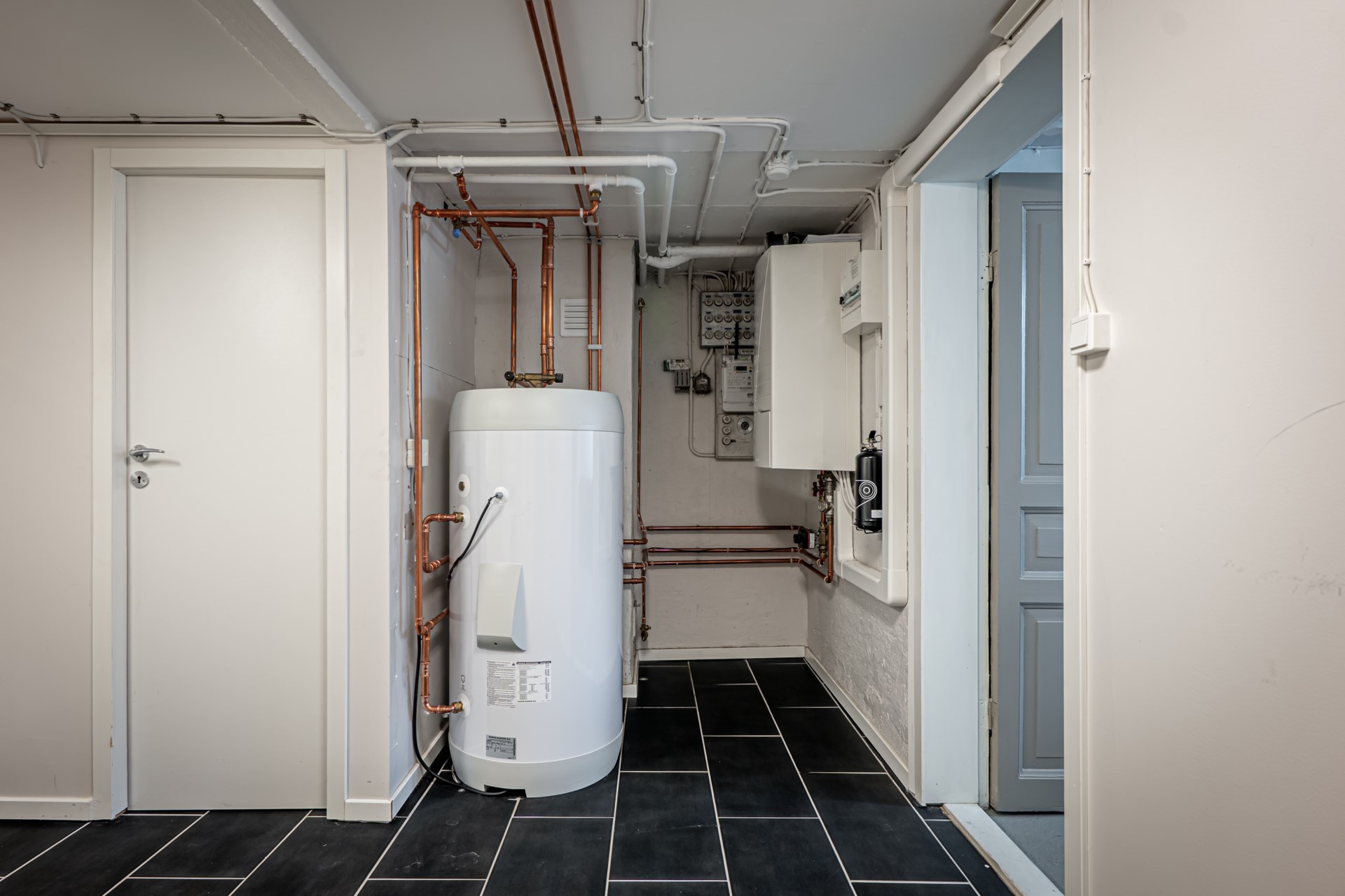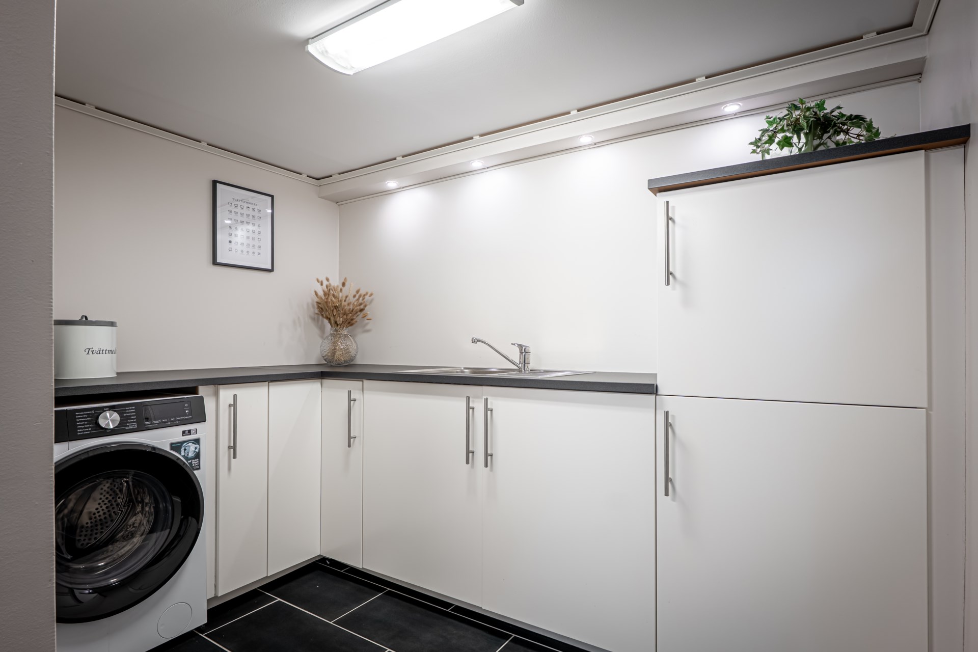 - Tvättstuga: Tvättstugan är belägen i källaren och har en tvättmaskin och tvättho.