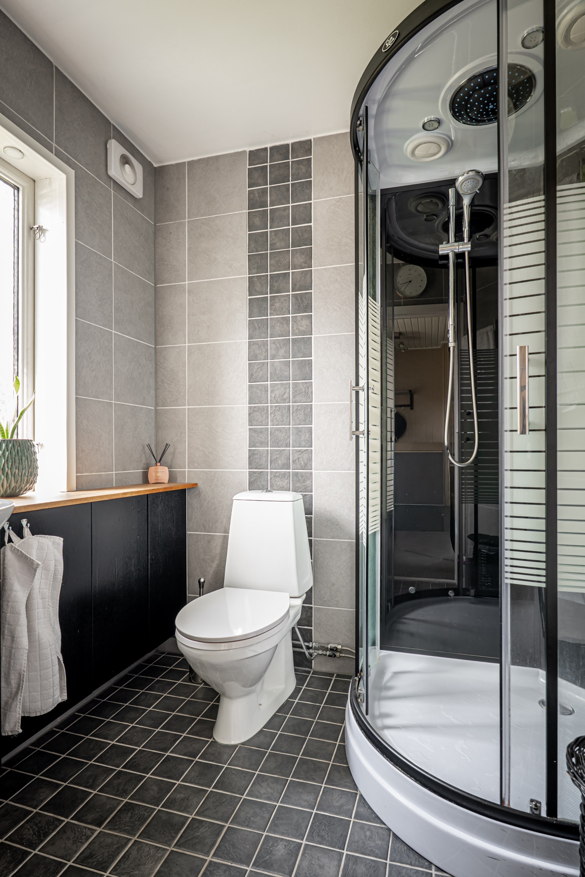 - Badrum: Helkaklat badrum med klinker på golvet. I badrummet har ni toalett, handfat samt duschkabin.