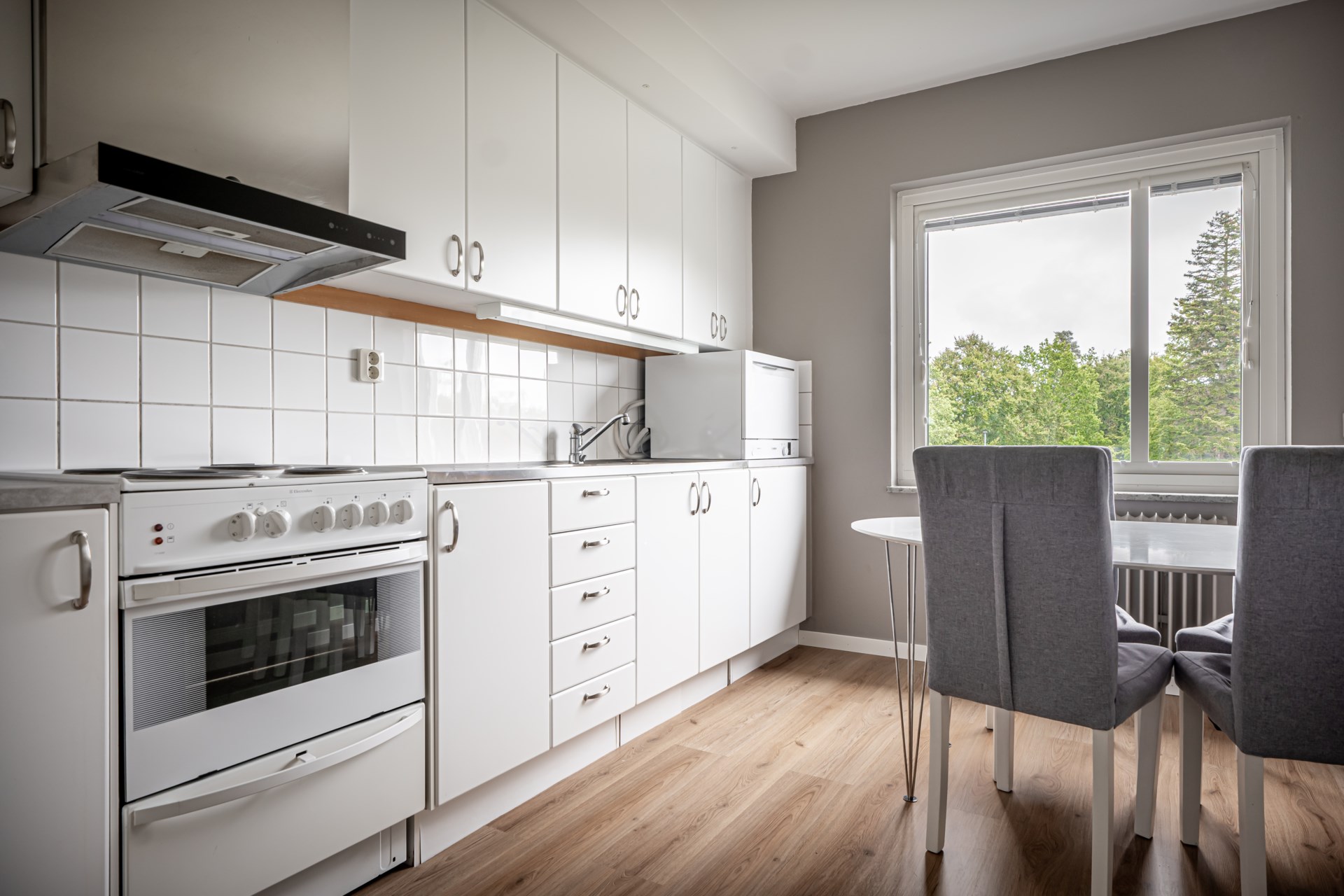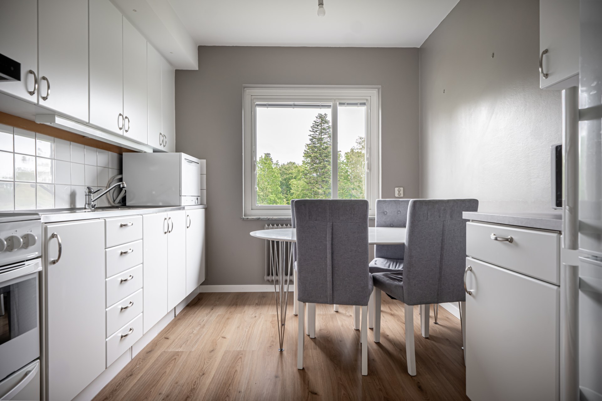 Vidare från hallen hittar du köket och badrummet, och längst in ligger sovrummet. Sovrummet är ljust och rymligt med plats för en dubbelsäng samt förvaringsmöjligheter. - Kök: Hemtrevligt kök med luckor i vitt. I köket finns det bra med yta för matlagning och bra förvaringsmöjligheter i skåp och lådor. Köket är utrustat med spis, ugn, fläkt samt kyl/frys. I köket har ni plats för ett matbord med fyra stolar.