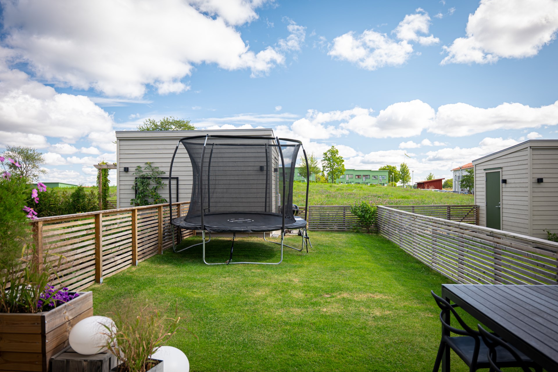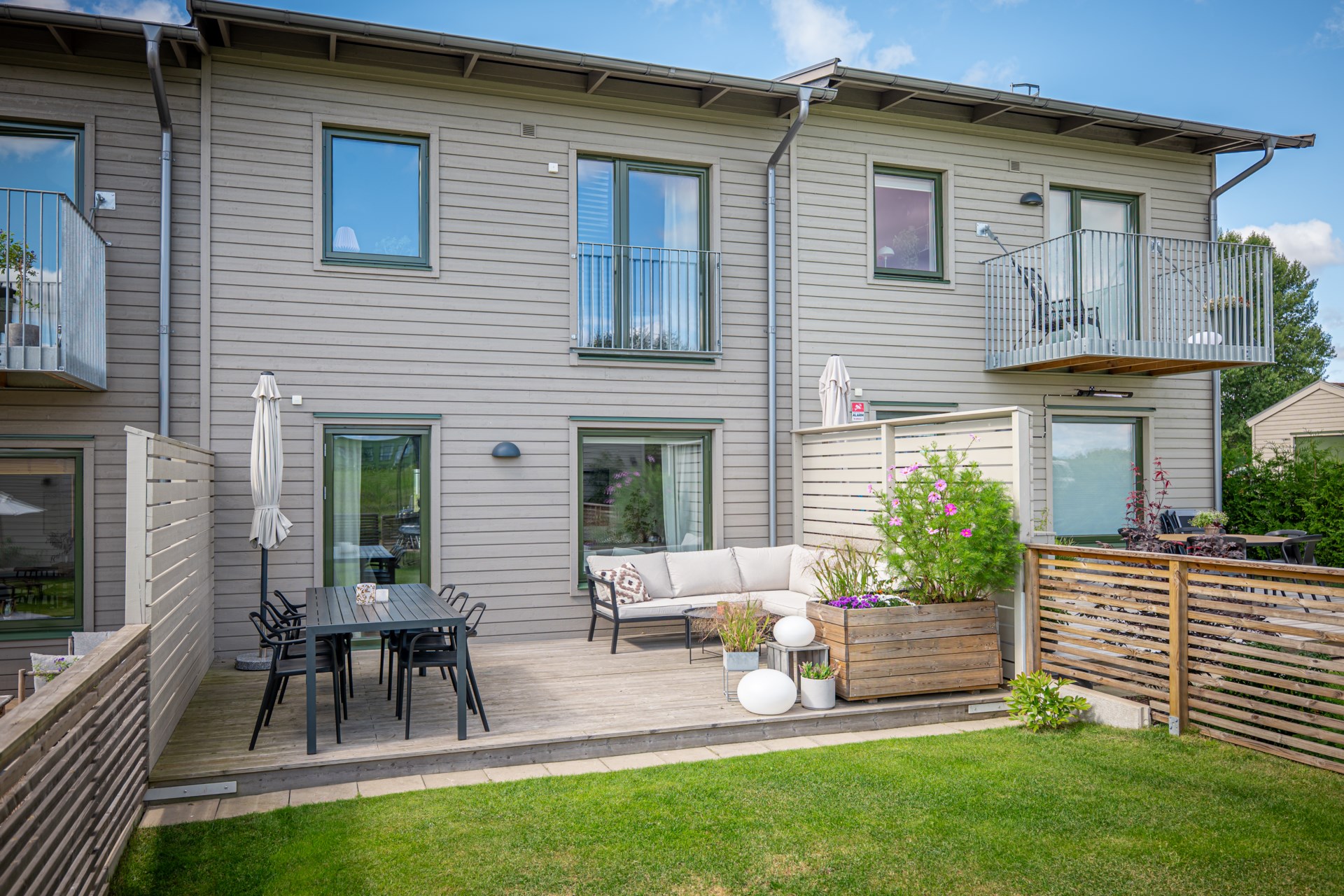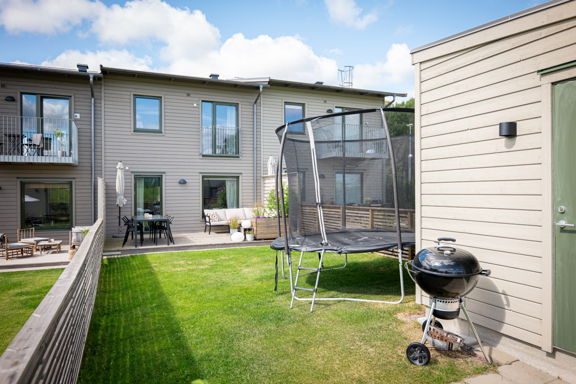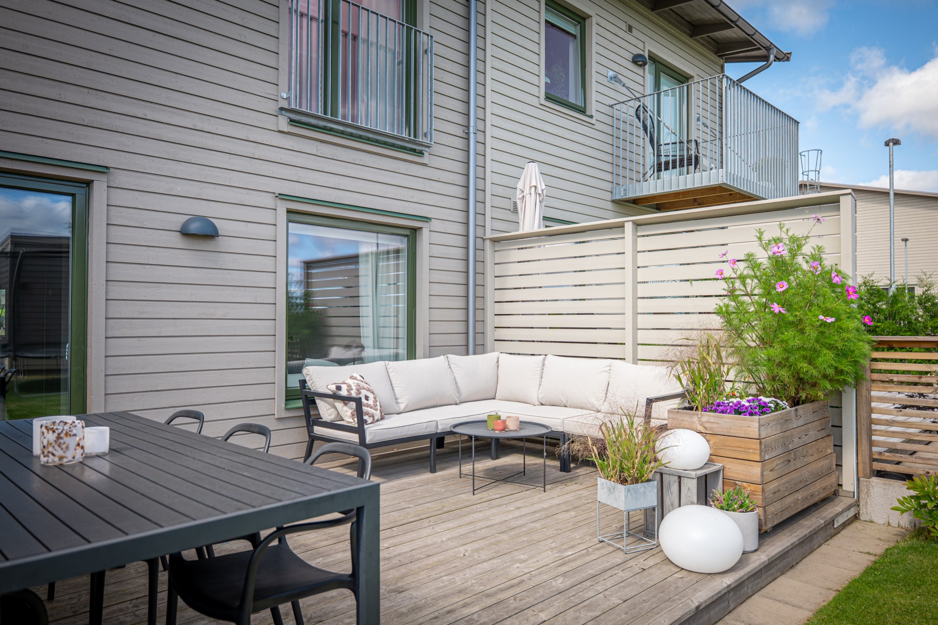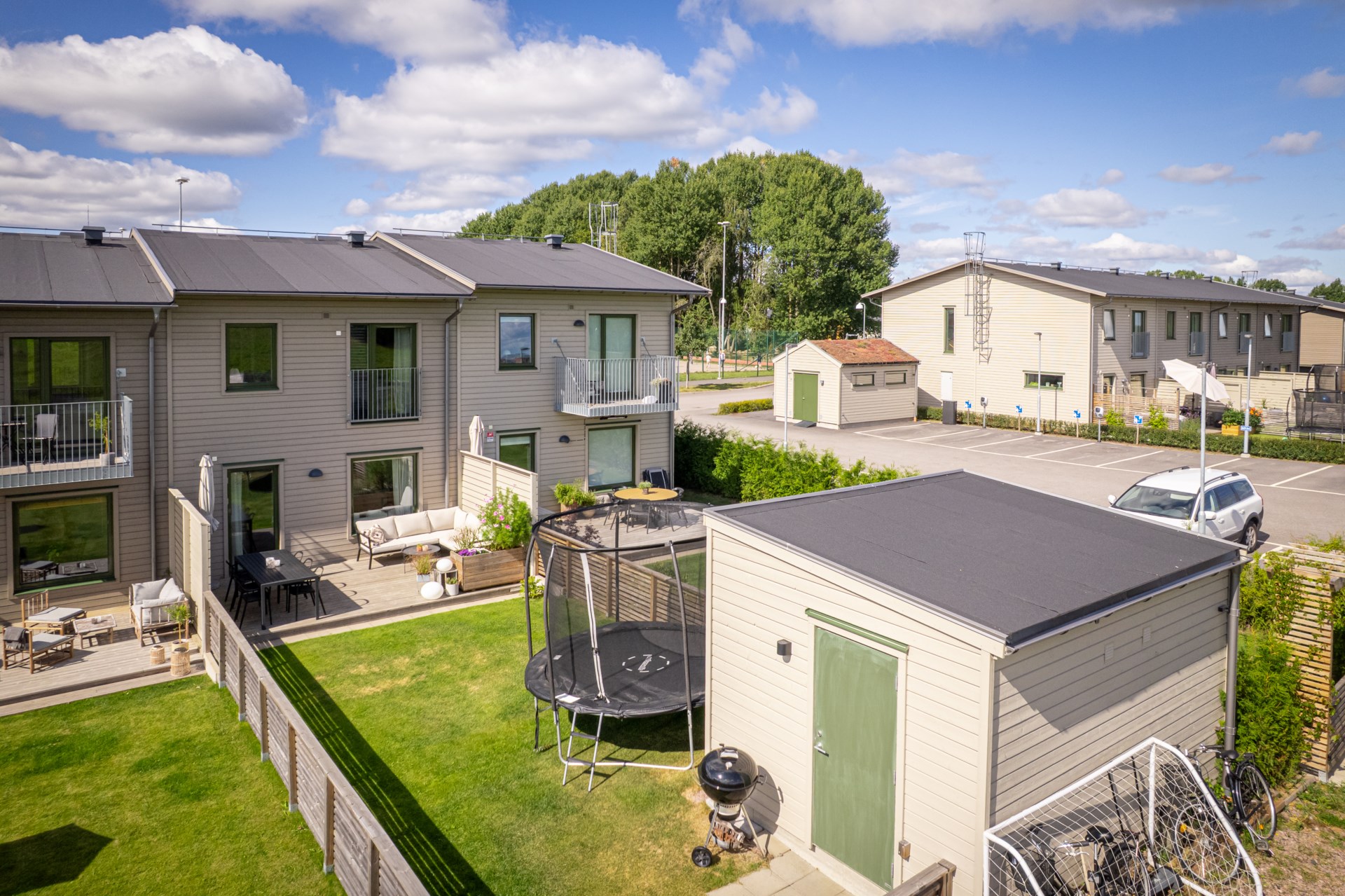 Längst in öppnar vardagsrummet upp sig – ett luftigt och trivsamt rum med gott om plats för både soffhörna och matplats. Härifrån kliver du direkt ut till den egna uteplatsen med trädäck – idealisk för lata kaffestunder eller grillkvällar med vänner. Längre ner i trädgården finns ett smidigt förråd som hör till bostaden.