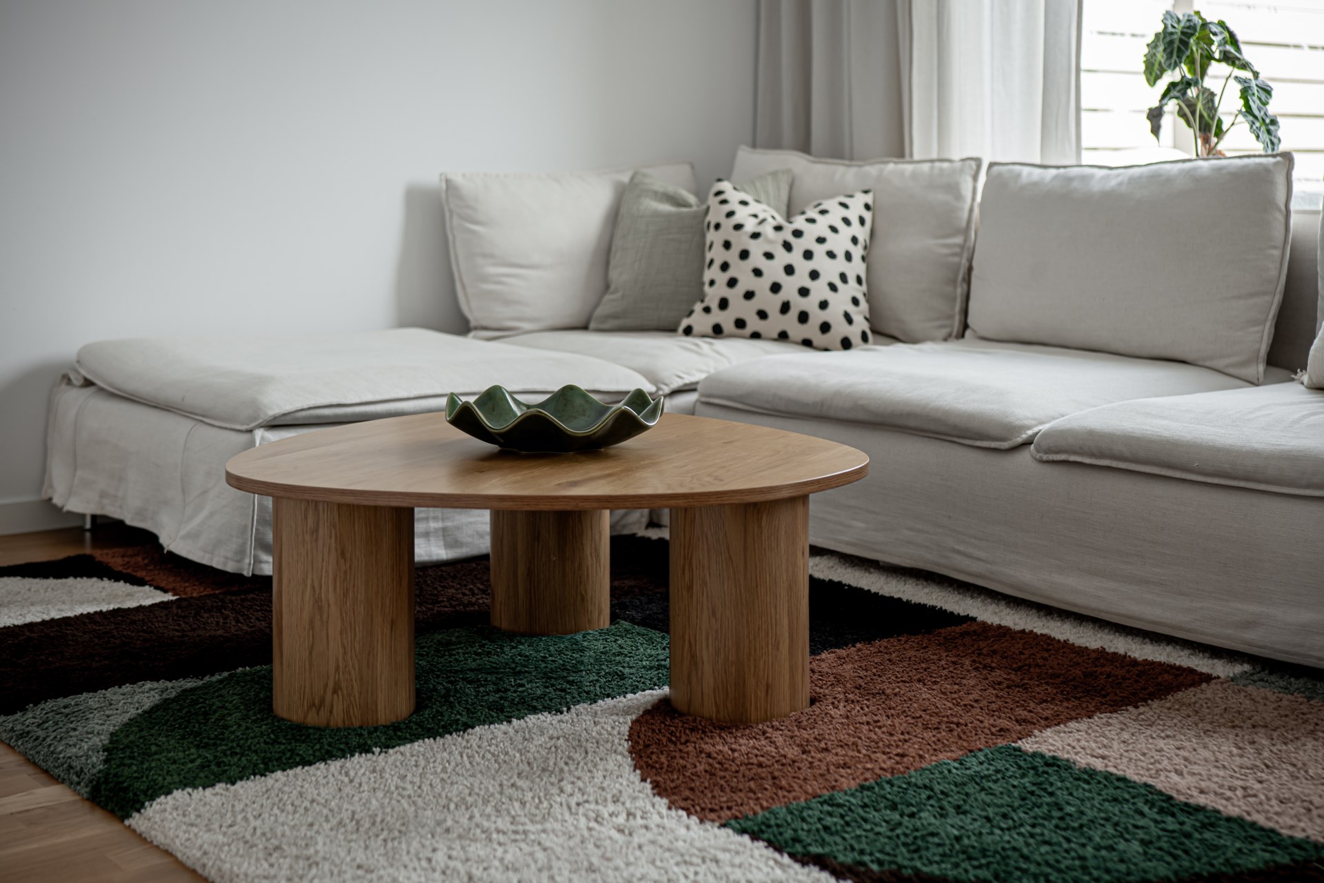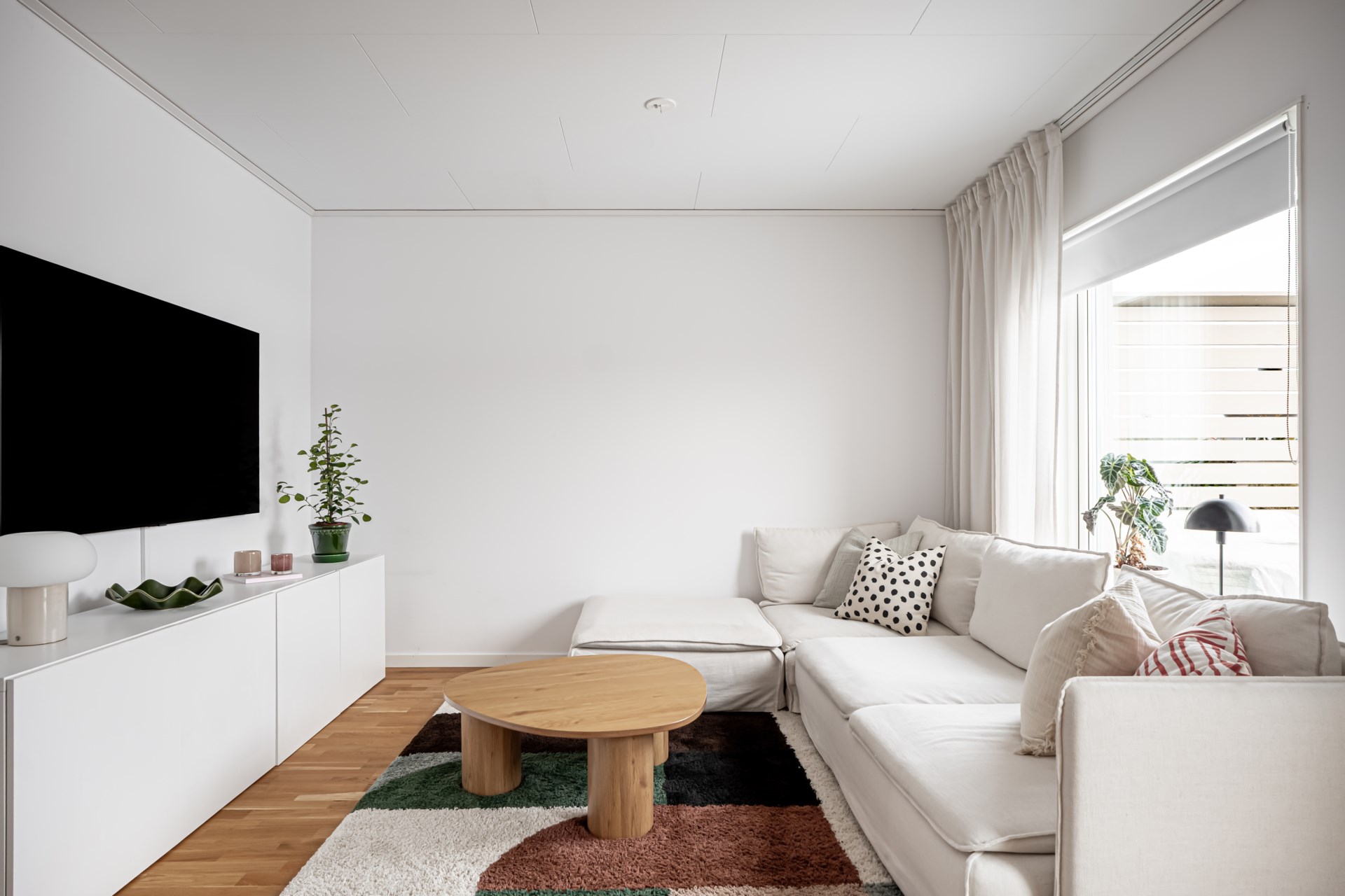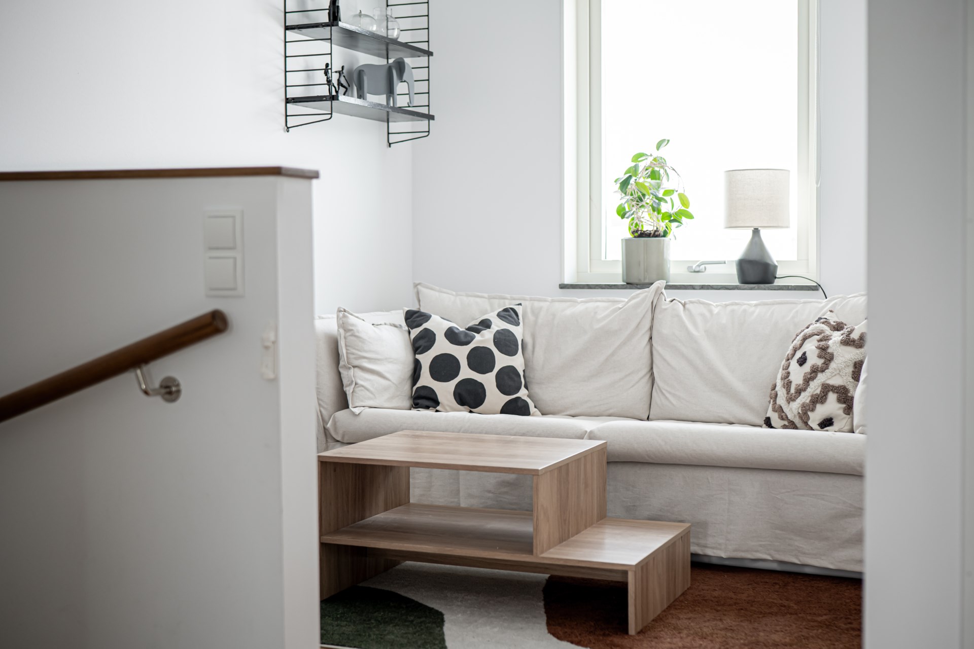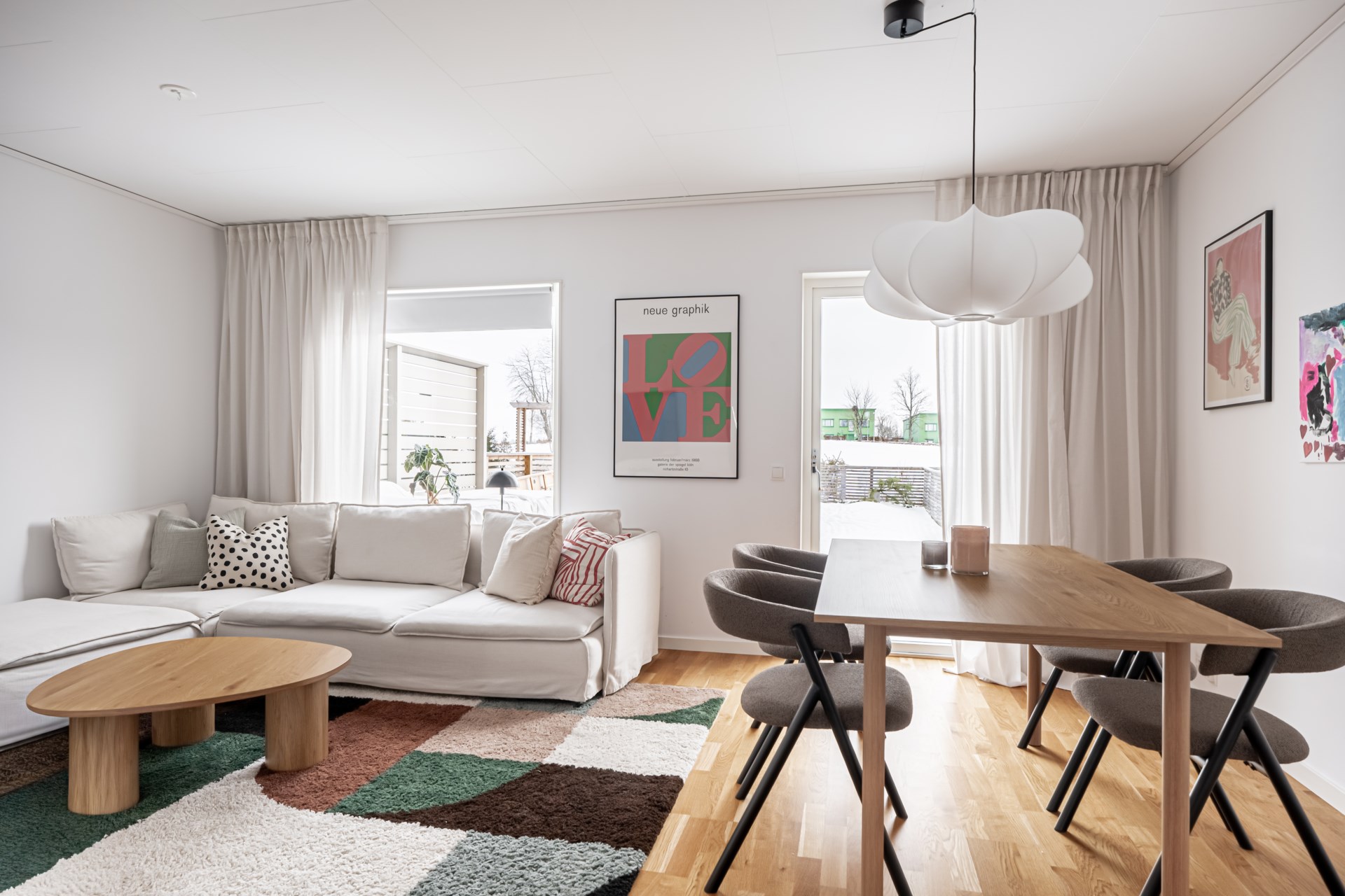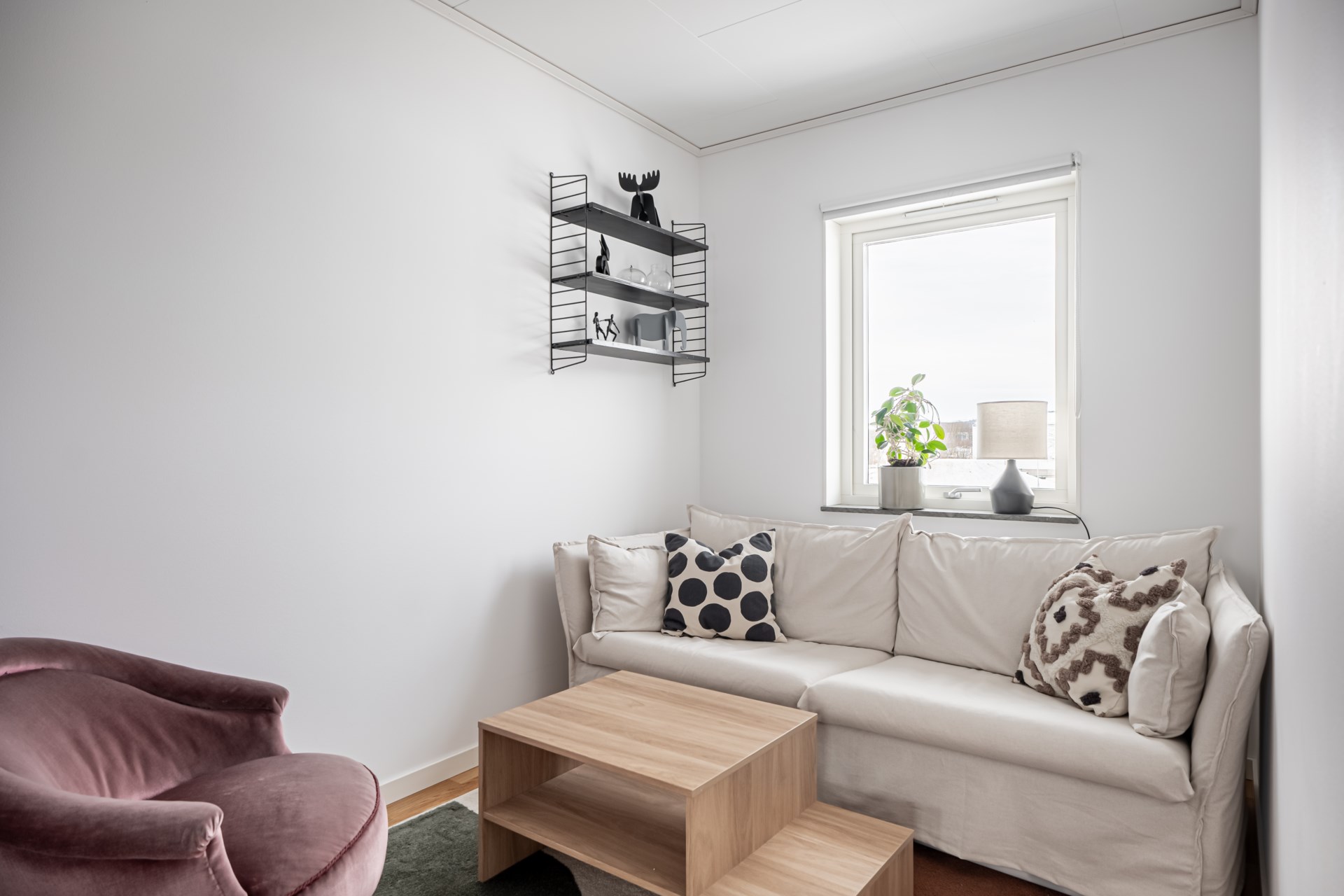 Längst in öppnar vardagsrummet upp sig – ett luftigt och trivsamt rum med gott om plats för både soffhörna och matplats. Härifrån kliver du direkt ut till den egna uteplatsen med trädäck – idealisk för lata kaffestunder eller grillkvällar med vänner. Längre ner i trädgården finns ett smidigt förråd som hör till bostaden.