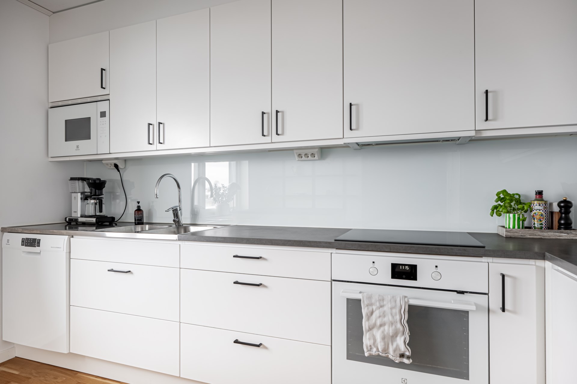 - Kök: Ett inbjudande kök med ljusa, tidlösa luckor som harmoniserar fint med den eleganta grå bänkskivan. Här finns allt du behöver för matlagning och vardagslyx – spishäll, fläkt, ugn, diskmaskin samt kyl och frys i fullhöjd. Den generösa köksön blir hemmets naturliga samlingspunkt, perfekt för extra arbetsyta eller för att slå sig ner och njuta av en god måltid.