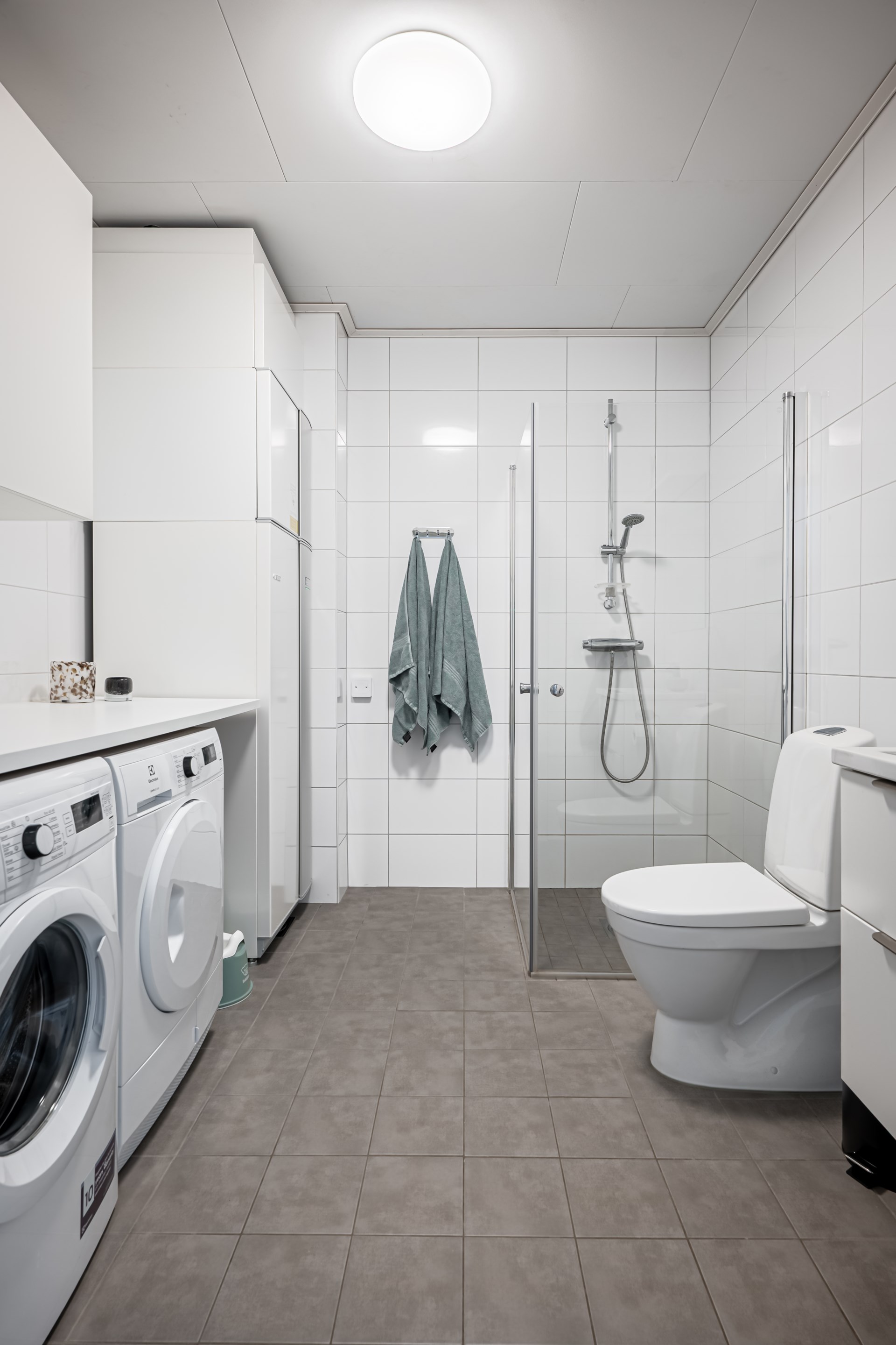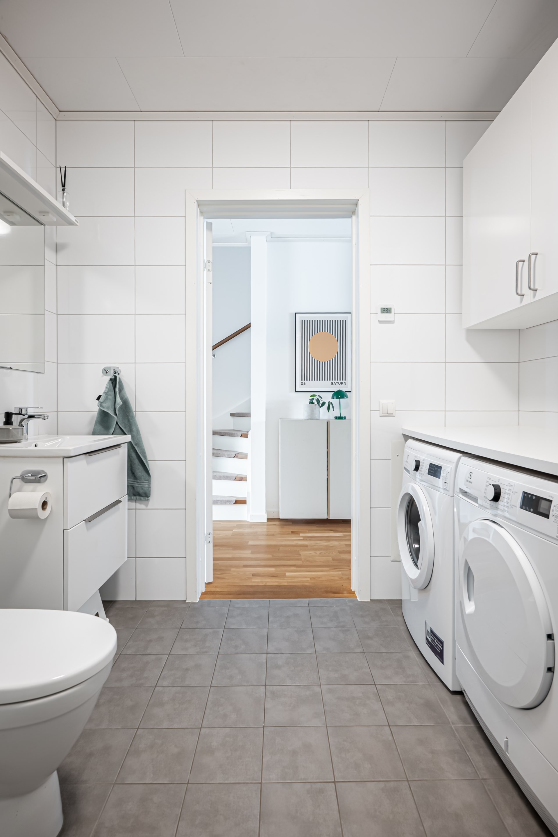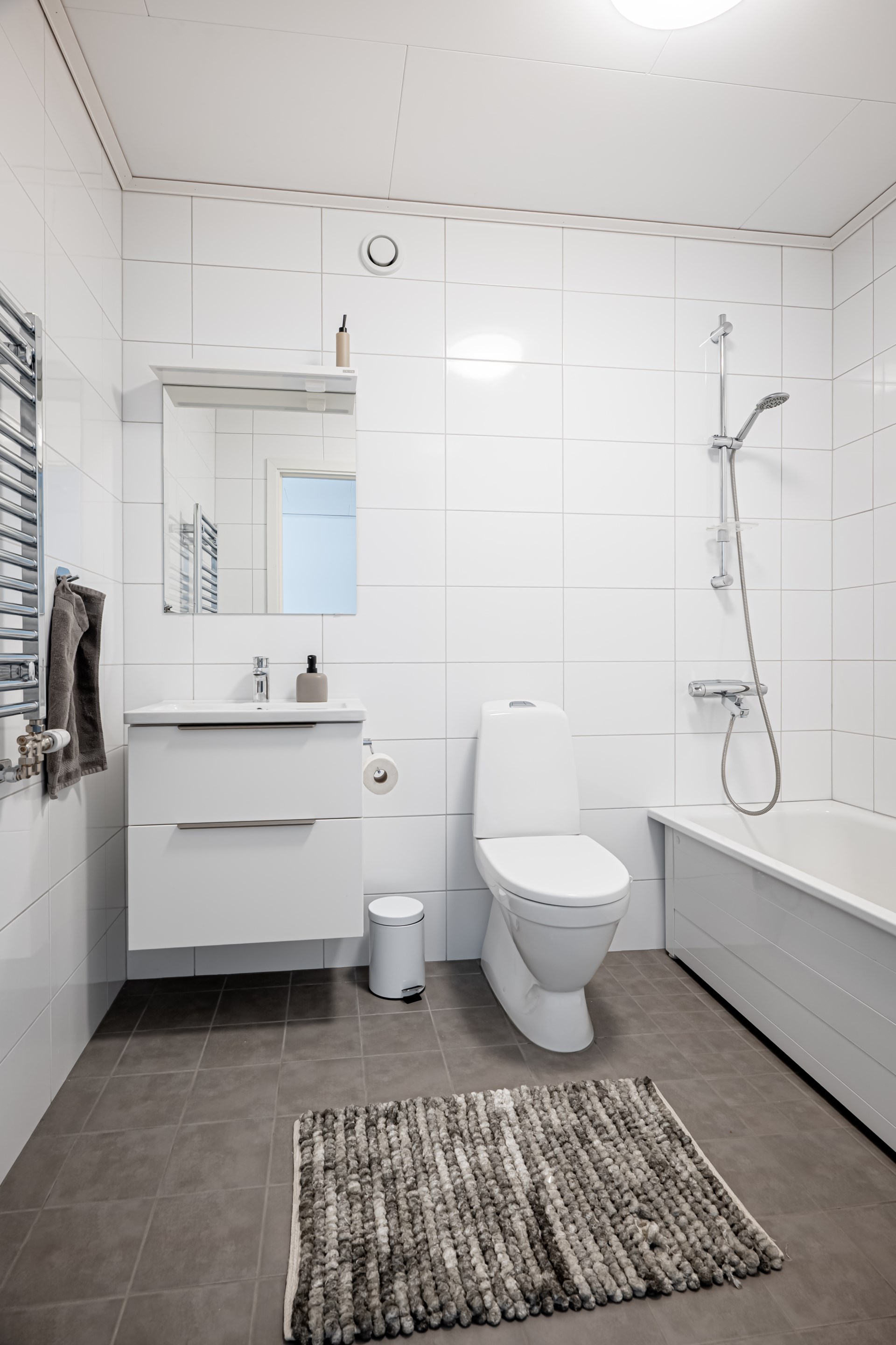 - Badrum: På övre plan, i anslutning till sovrummen, finns ett praktiskt badrum med vita kaklade väggar och stilrent grått klinkergolv. Här hittar du toalett, kommod och ett skönt badkar – perfekt för avkopplande stunder.