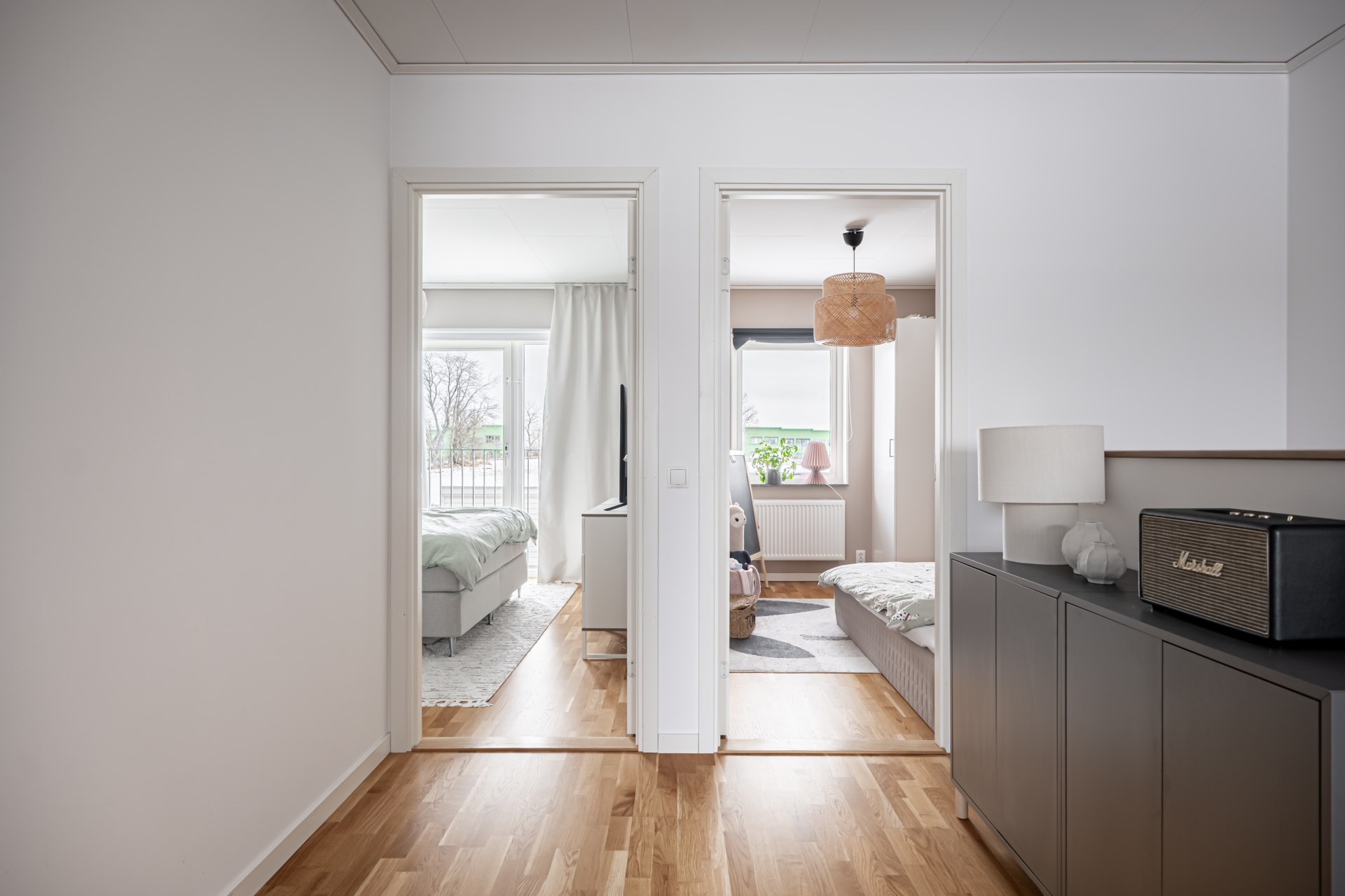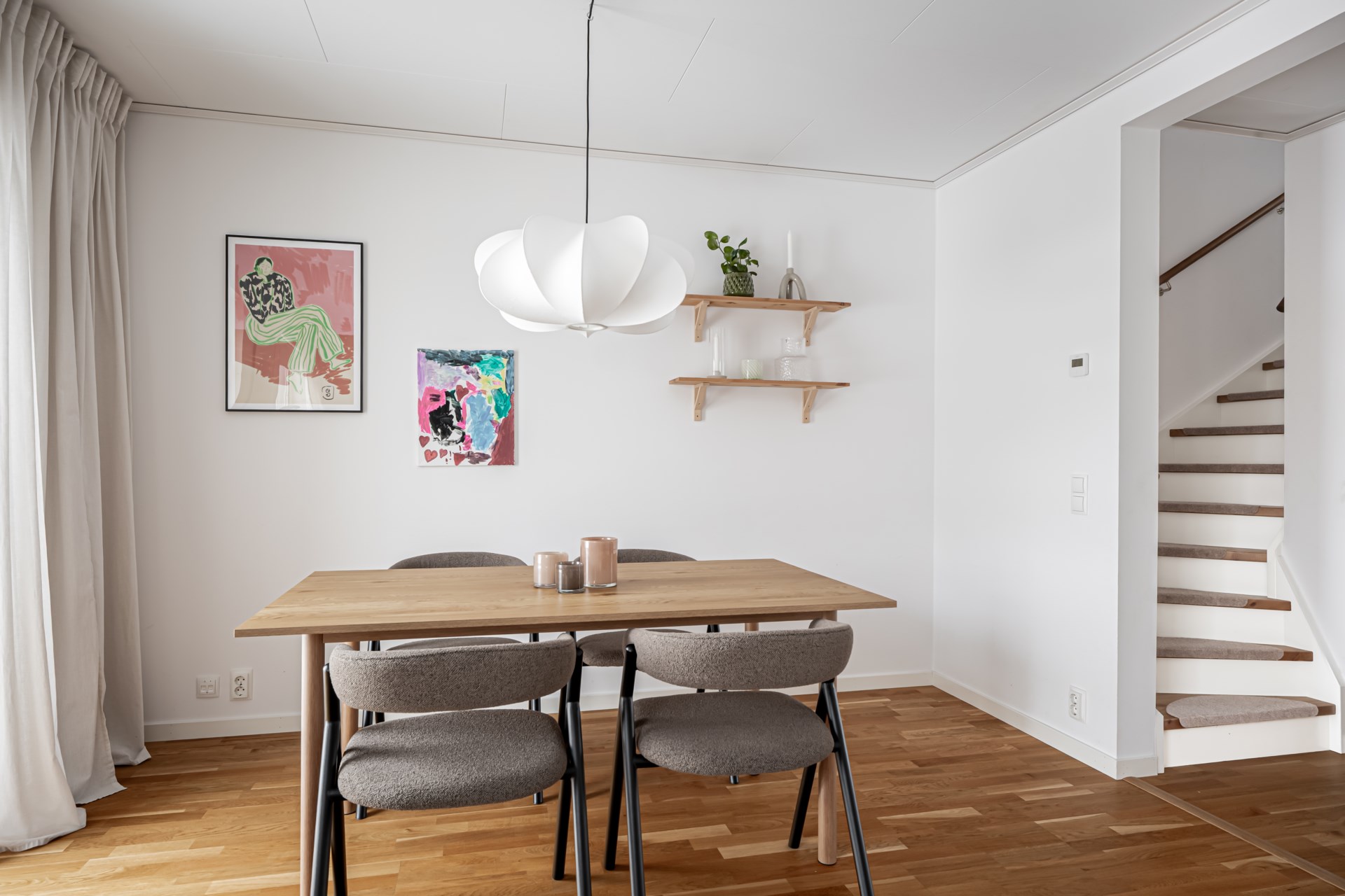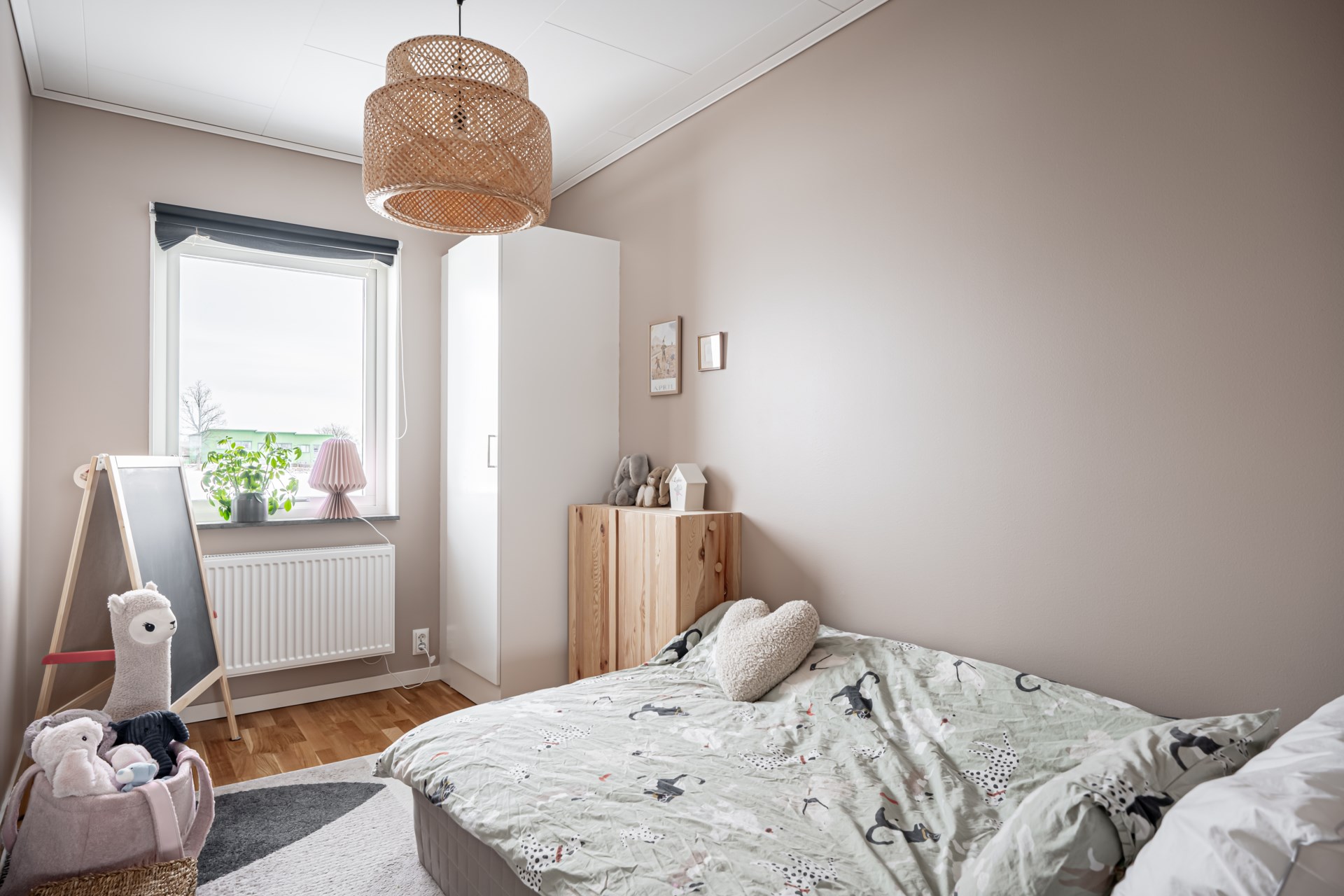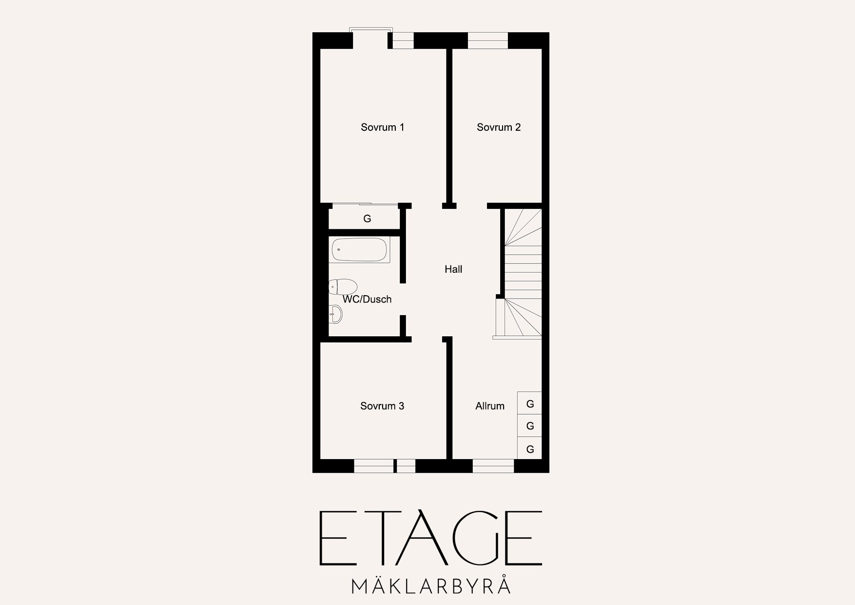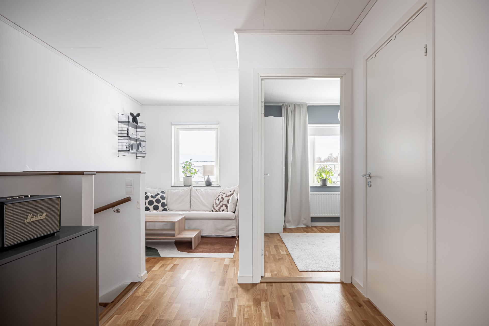 En trappa upp väntar den mer privata delen av hemmet. Här finns tre sovrum, varav det största har en generös skjutdörrsgarderob. Dessutom finns ett allrum som passar perfekt som tv-hörna, lekrum eller kontor – och behöver du ett extra sovrum är det enkelt att skapa. Ni finner även det andra badrummet på övre plan. - Badrum: Stort och fint badrum med helkaklade väggar och klinkergolv. Här finns toalett, kommod och dusch, samt praktiska tvättmöjligheter med både tvättmaskin och torktumlare.