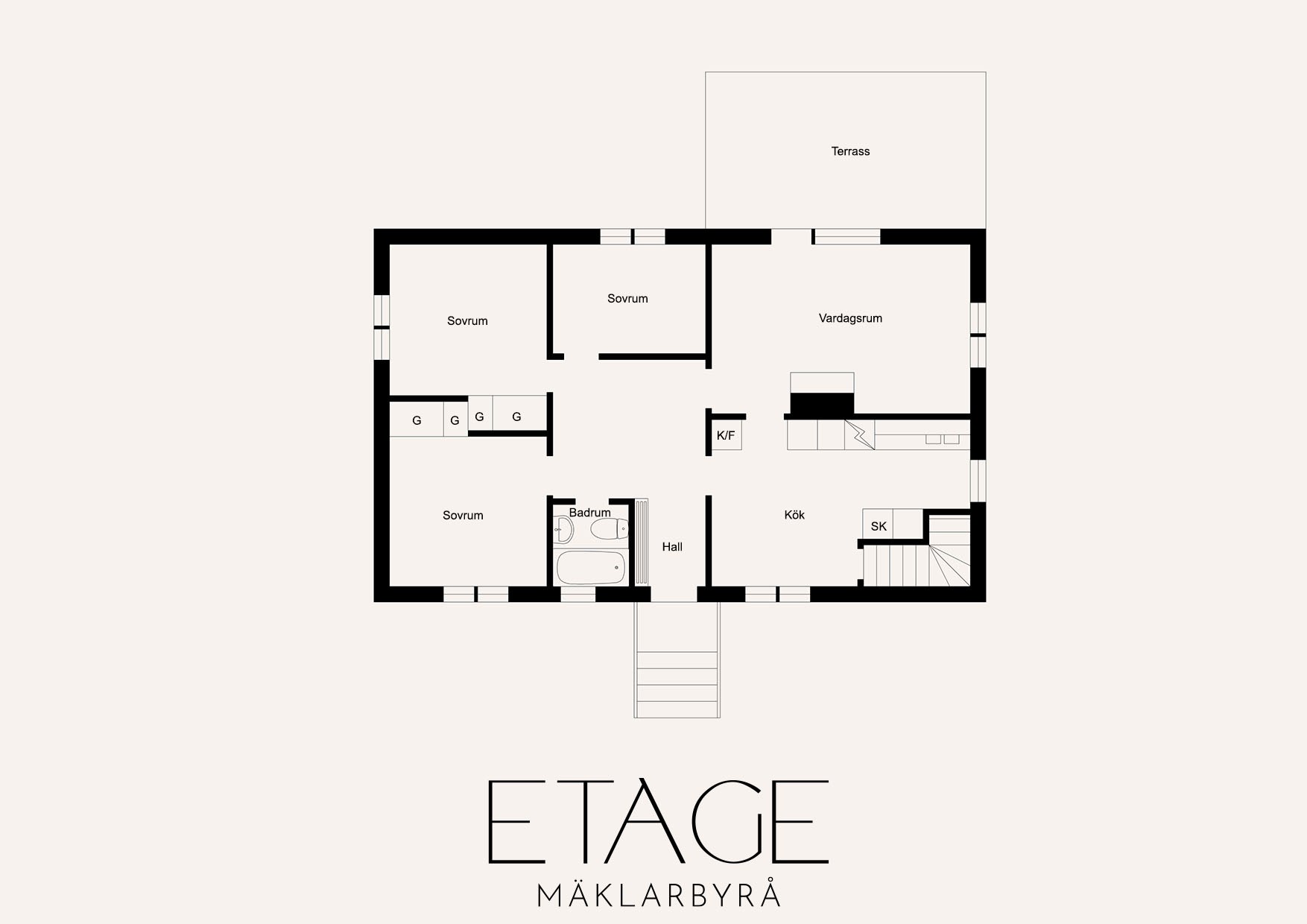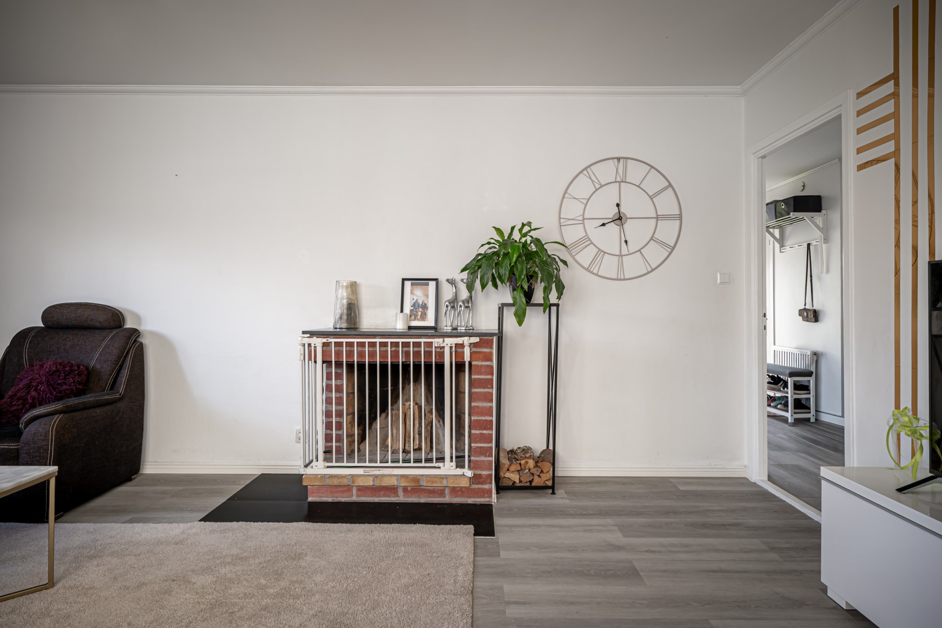Rakt fram öppnar vardagsrummet upp sig, ljust, rymligt och inbjudande. Här finns gott om plats för både soffgrupp och tv-möbel, och under kyligare kvällar sprider den öppna spisen både värme och en härlig atmosfär. Från vardagsrummet nås uterummet som förlänger säsongen och bjuder in till många trivsamma stunder.
