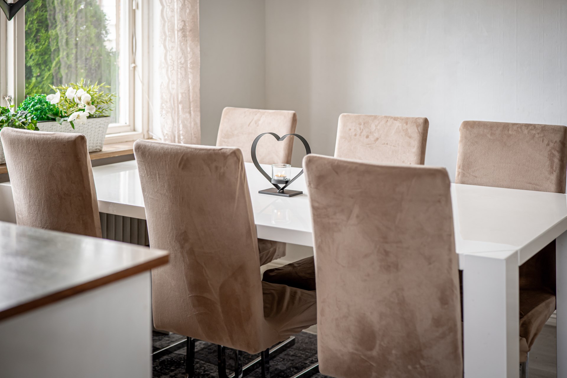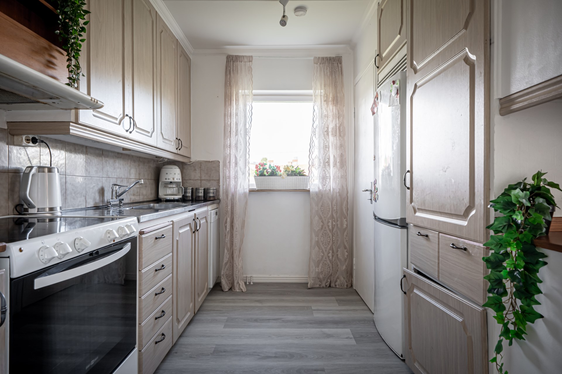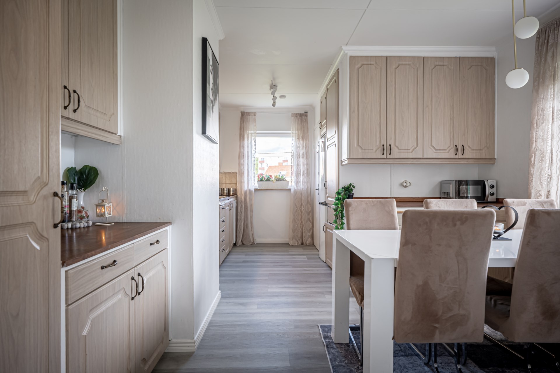 - Kök: Hemtrevlig kök med gott om skåp och lådor för porslin och köksredskap. Köket är utrustat med spis, ugn, fläkt, diskmaskin samt kyl/frys. I köket har ni plats för ett matbord med sex stolar.