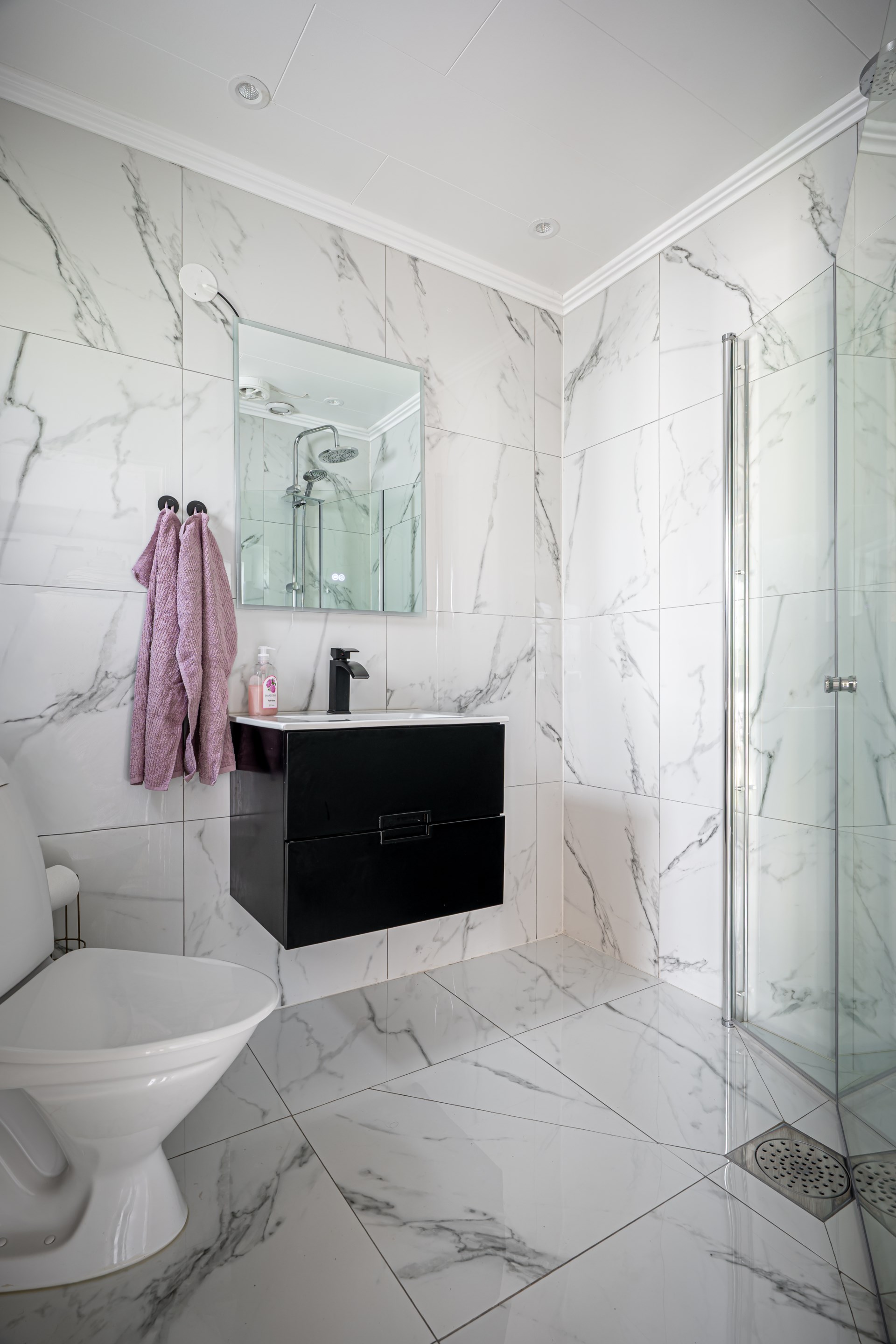 Källarplanet rymmer en mängd möjligheter och erbjuder ytor som kan anpassas efter era behov. Här finns idag en gillestuga, pannrum, tvättstuga, badrum samt generösa förvaringsutrymmen. Vill ni skapa ett hemmagym, ett kontor eller kanske ett tonårsrum? Möjligheterna är många i detta flexibla utrymme. - Badrum: Helkaklat badrum med matchande klinker på golvet. I badrummet har ni toalett, kommod, spegel och dusch.