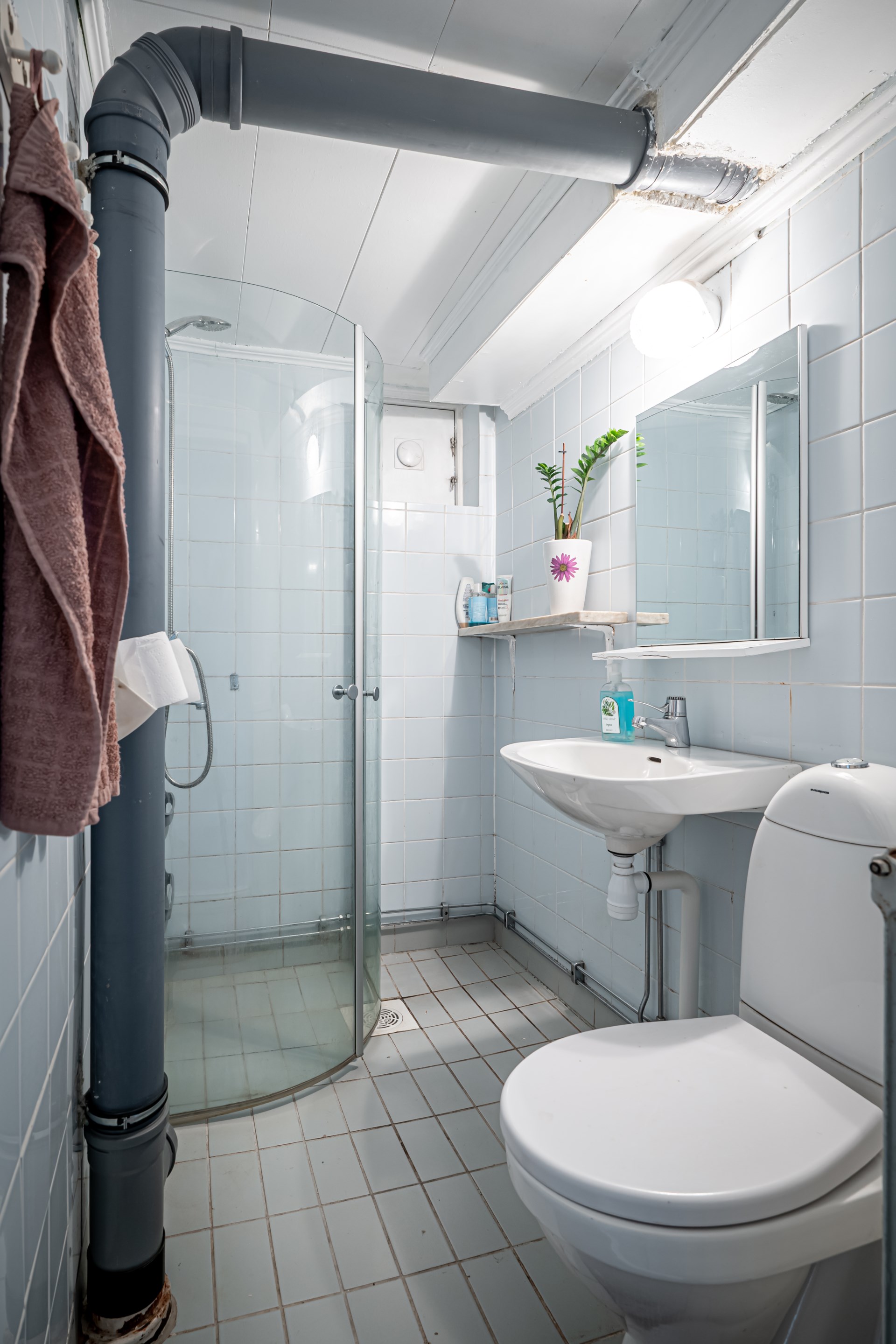 - Badrum: I källaren finns det andra badrummet som har kaklade väggar och klinker på golvet. I badrummet har ni toalett, handfat, spegel och dusch.