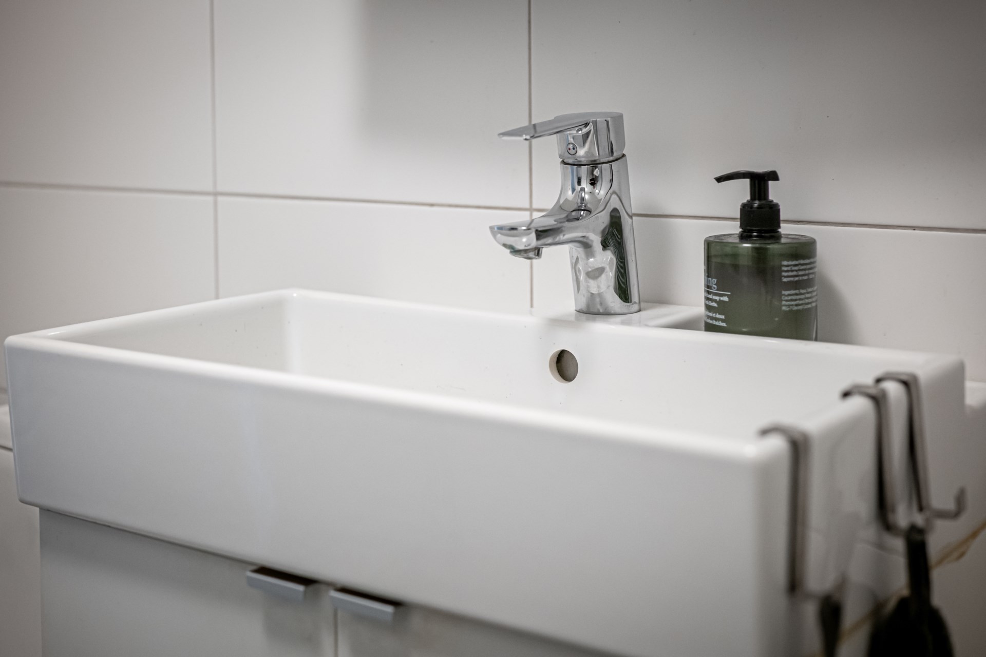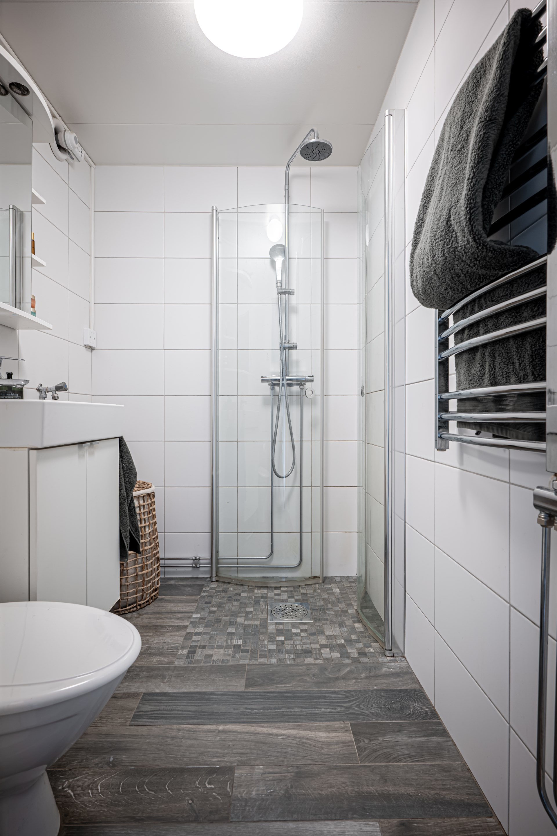 - Badrum: Helkaklat badrum med klinker på golvet. Badrummet är utrustat med dusch, wc och handfat.