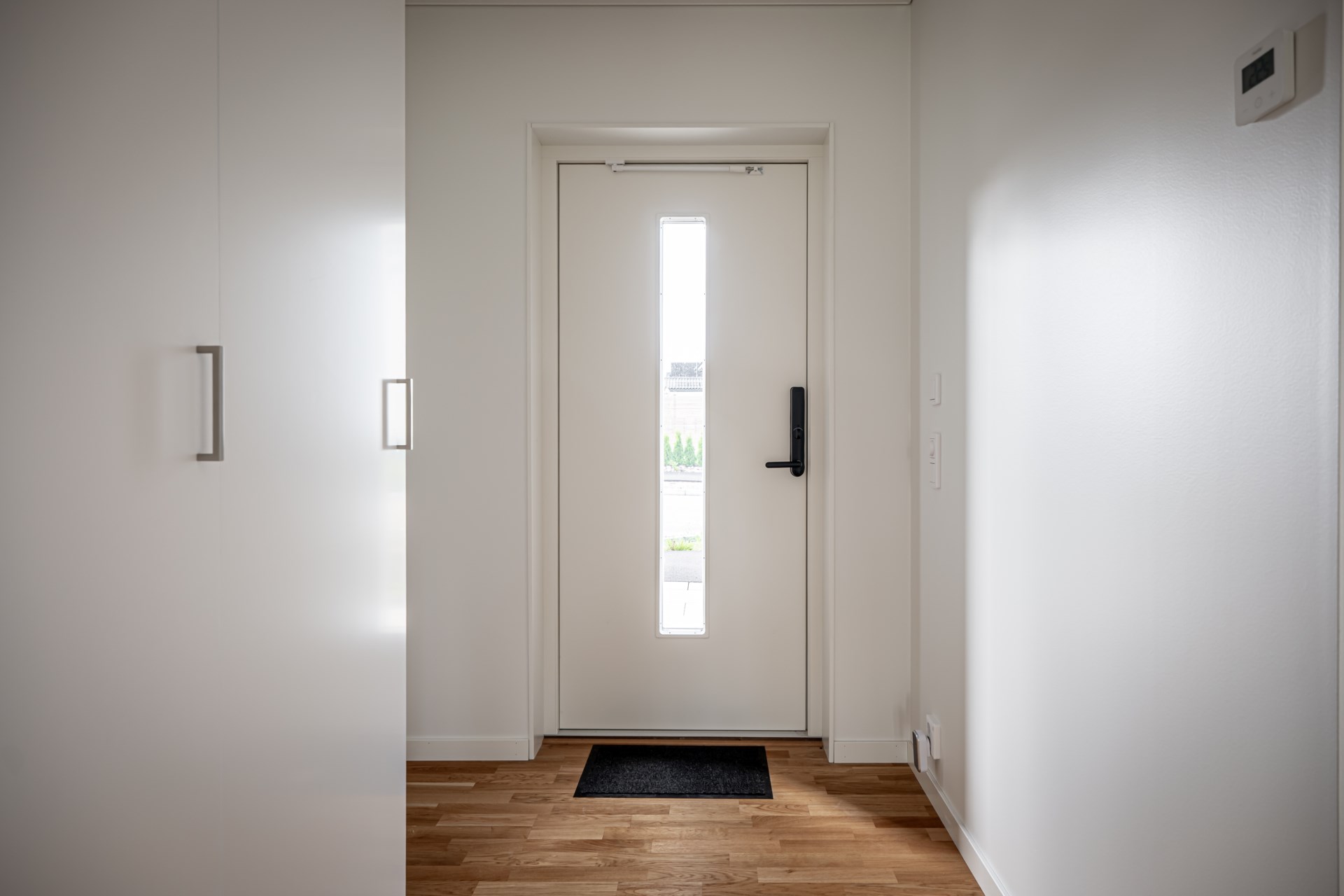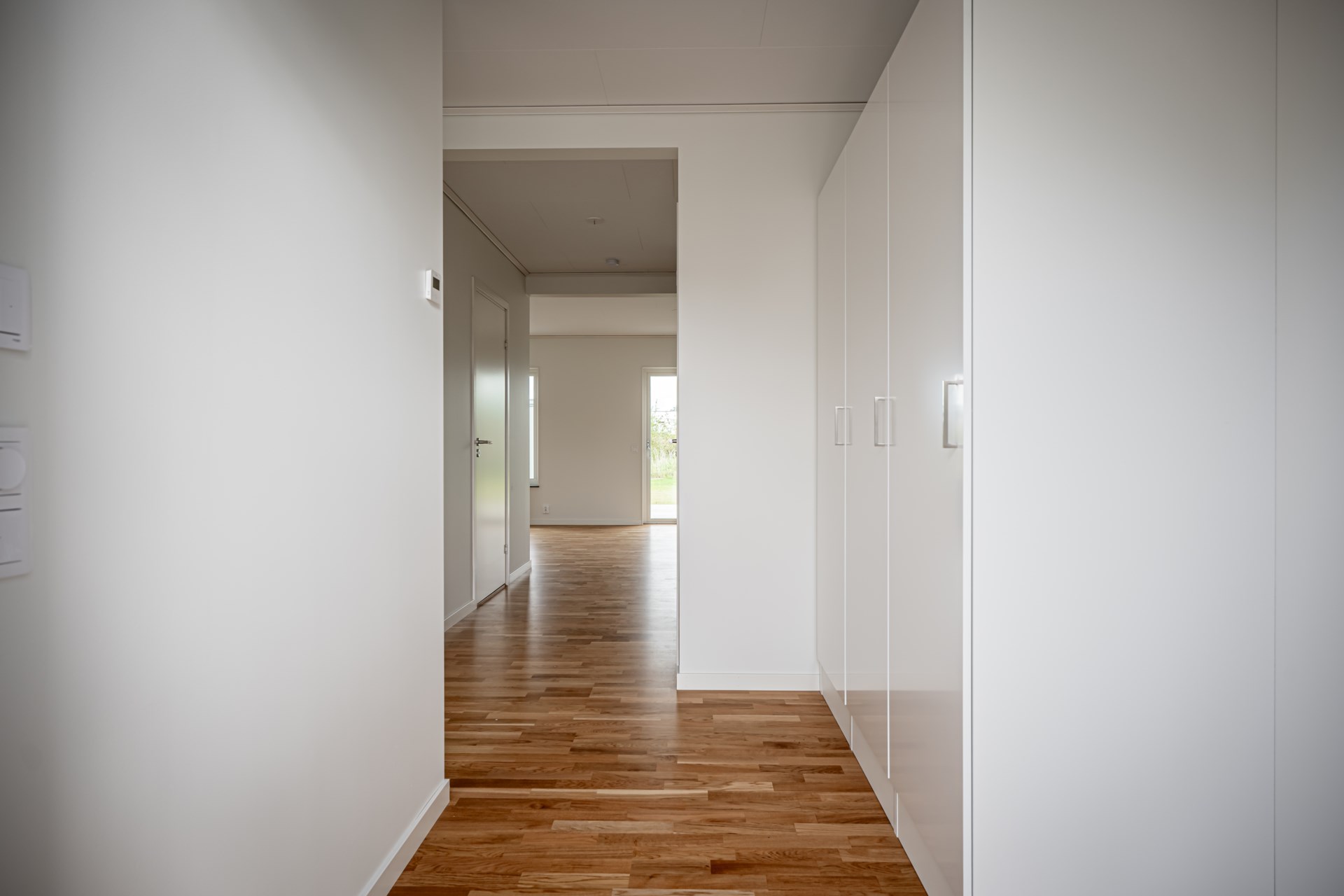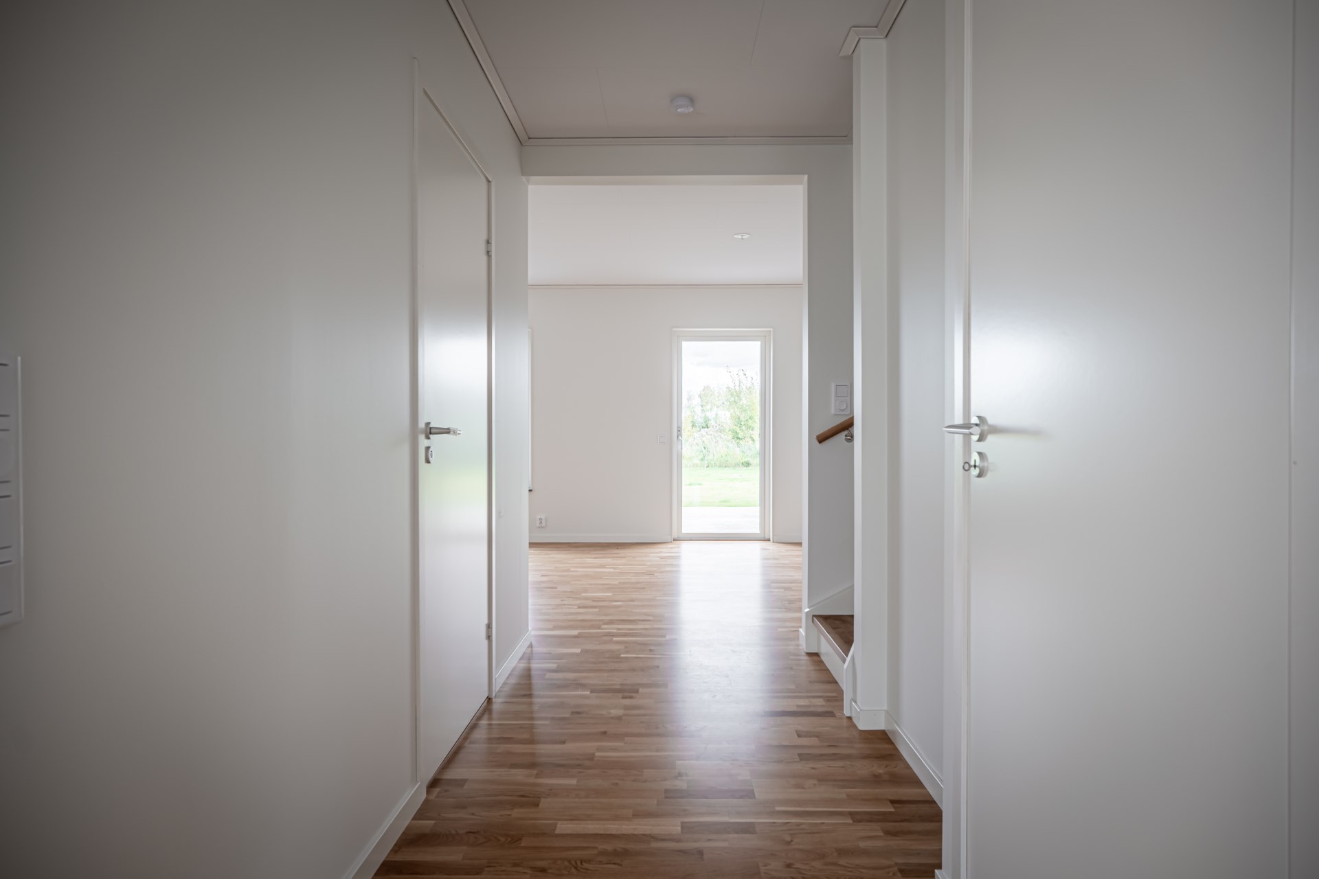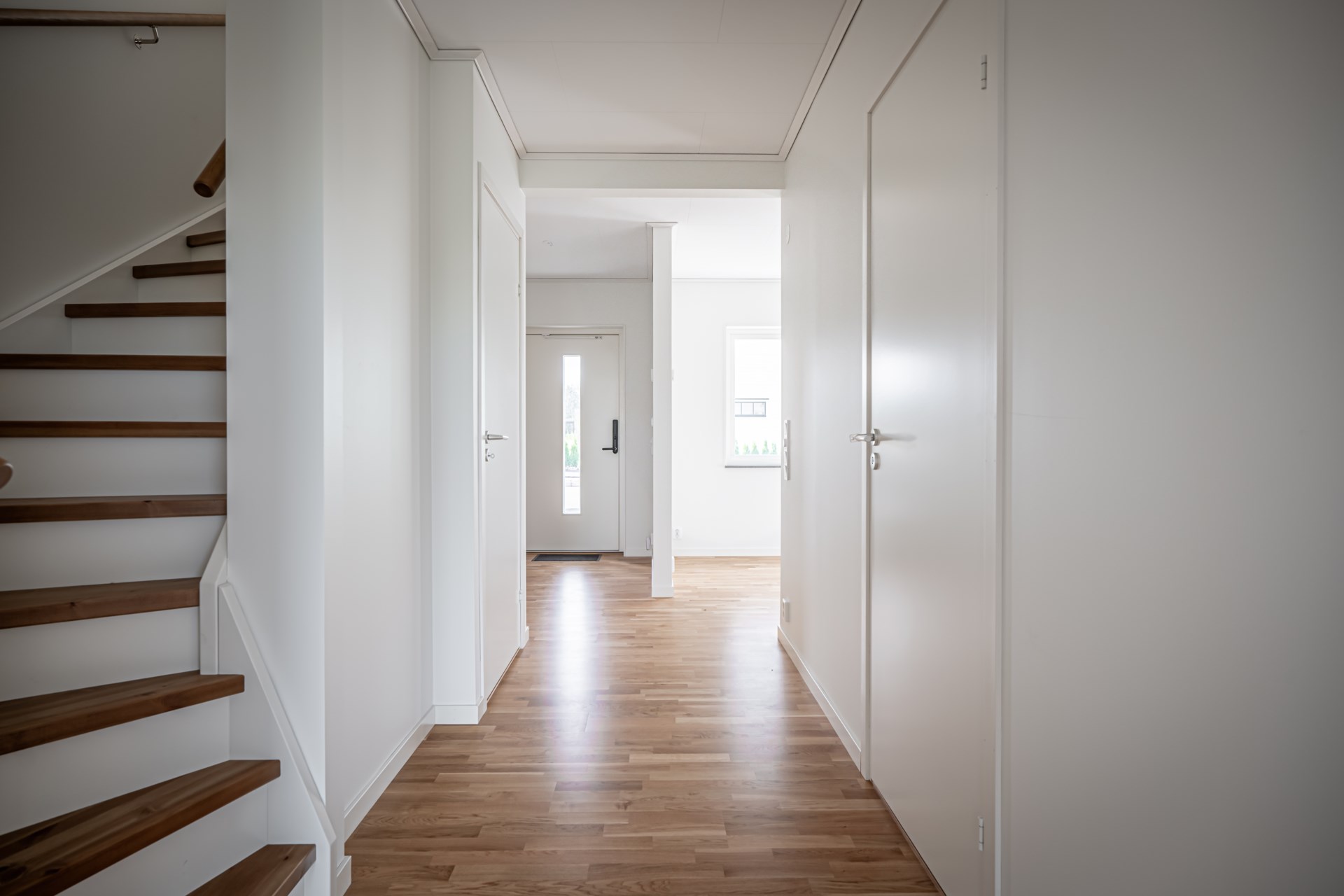- Allmän beskrivning: Välkommen till ett hem som präglas av stil och genomtänkta materialval. Redan i entrén möts du av ett vackert ekparkettgolv och vitmålade väggar som tillsammans ger ett ljust och luftigt intryck. Här finns två garderober samt ett praktiskt städskåp – perfekt för att hålla ordning på ytterkläder och städutrustning.