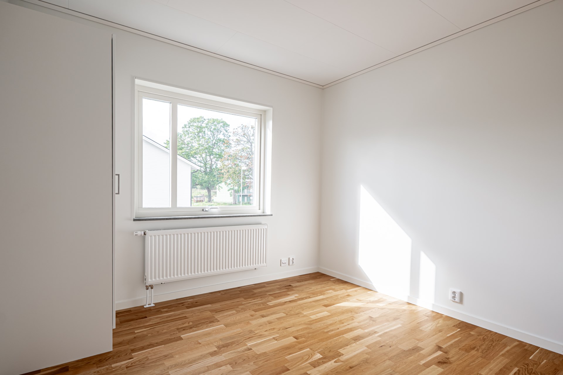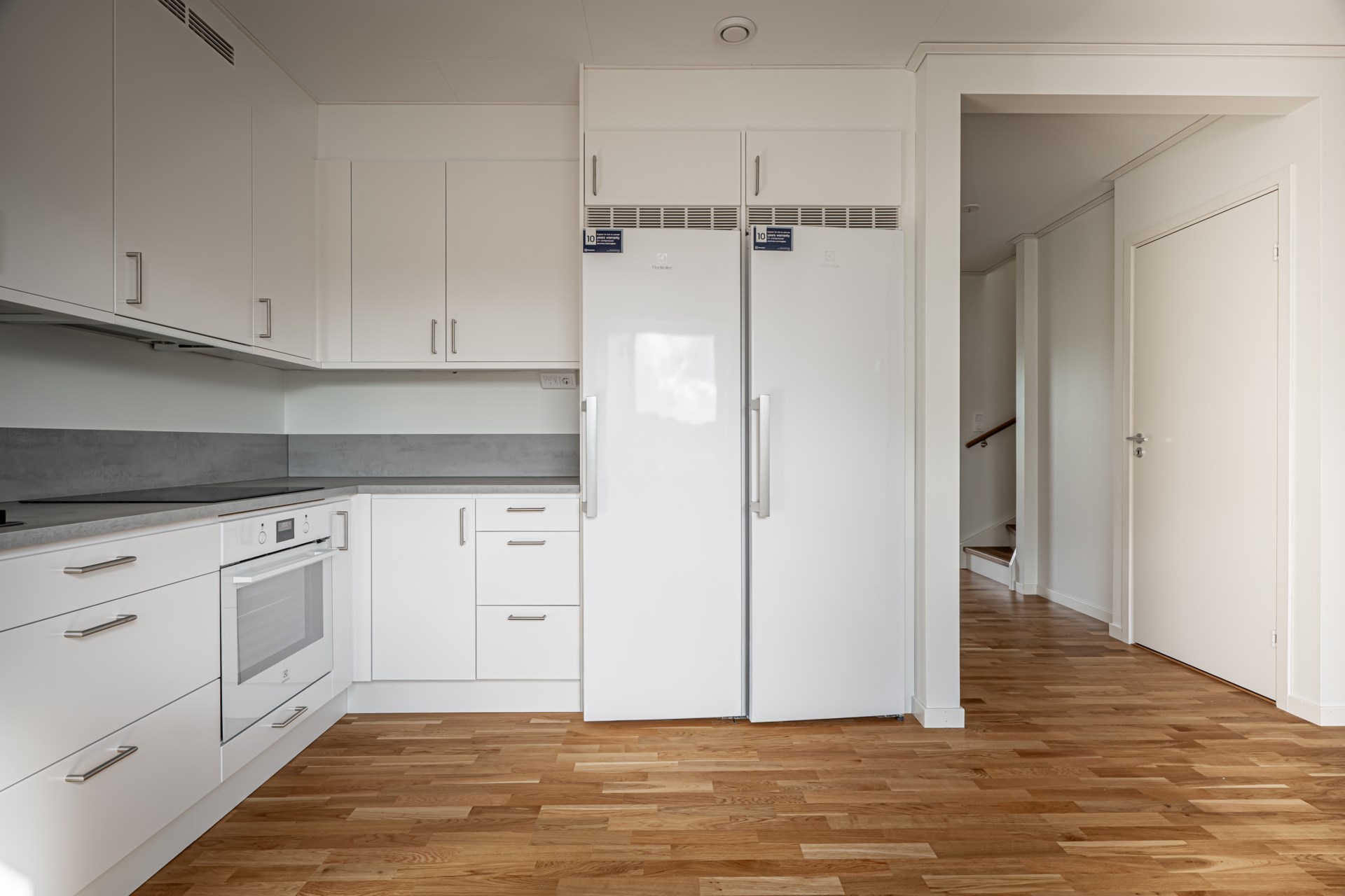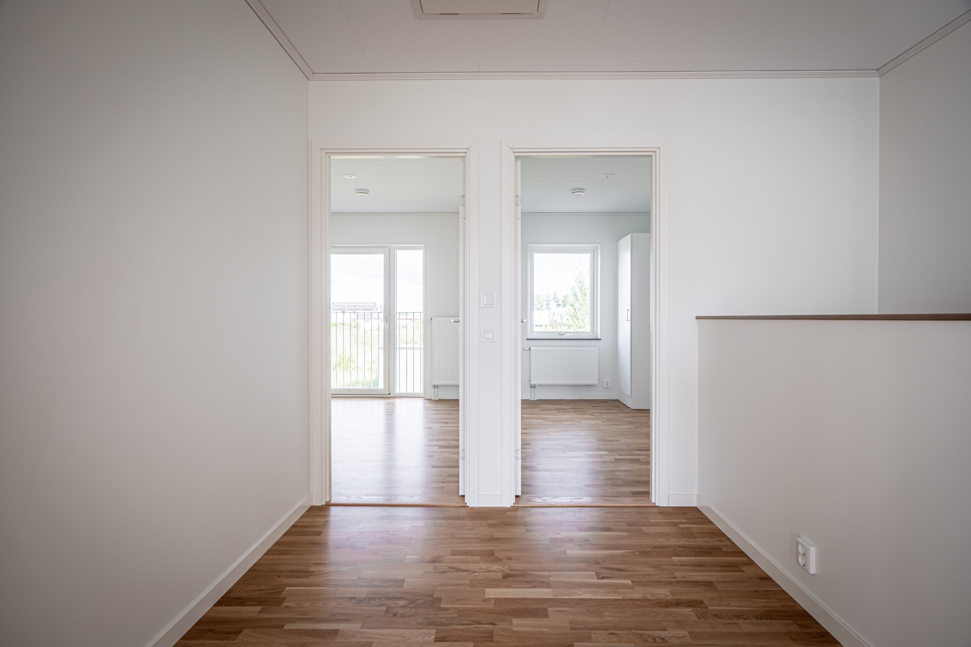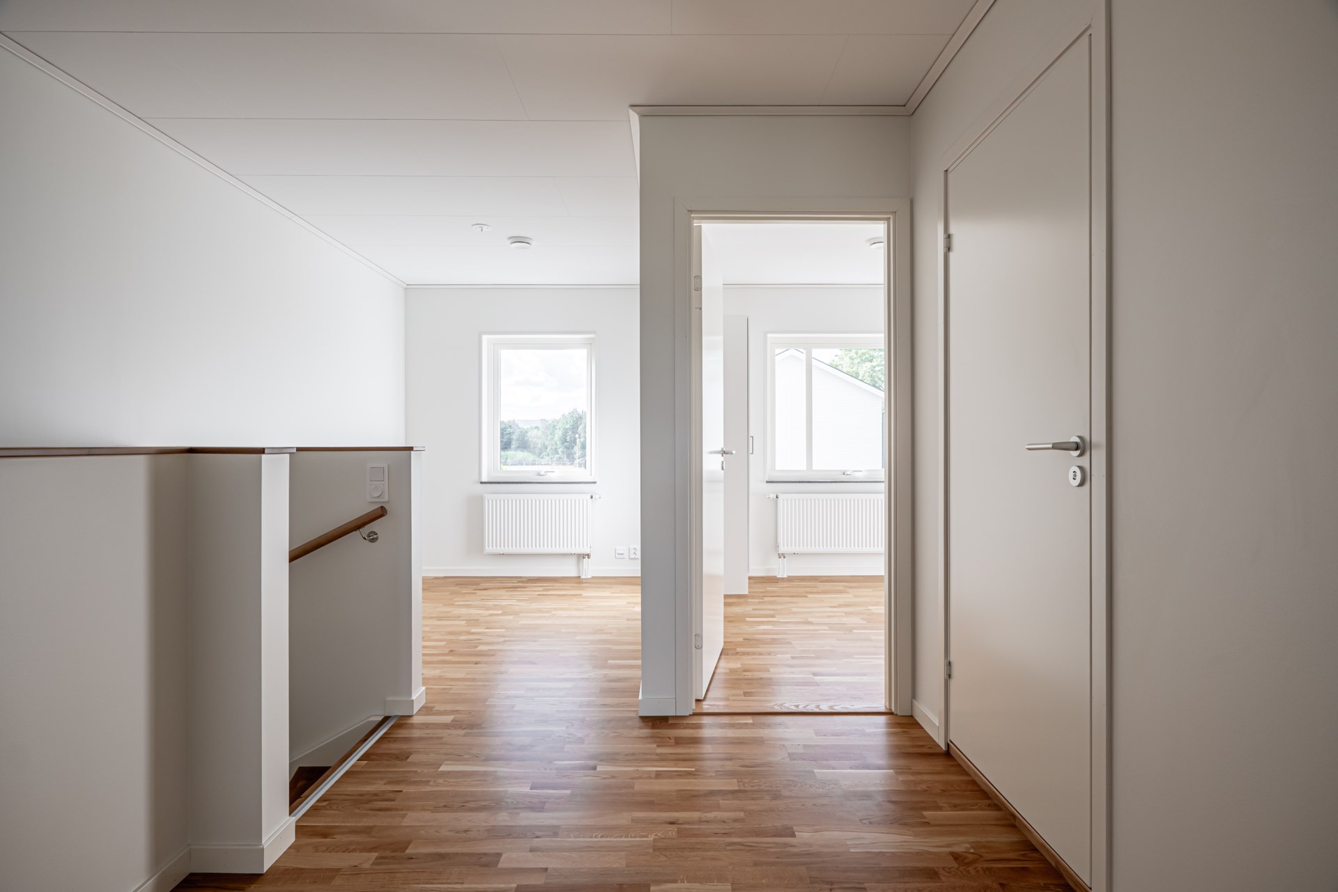 Trappan leder er sen till upp till övervåningen. Här möts du av en rymlig hall som knyter samman våningens alla rum. Planlösningen är väl genomtänkt med enhetliga golv och ljusa väggar. Det större sovrummet bjuder på en fransk balkong samt en generös skjutdörrsgarderob. De två övriga sovrummen har samma eleganta stil och är utrustade med varsin garderob. På detta plan finns även ett allrum – perfekt som tv-rum, lekhörna eller hemmakontor – samt ytterligare ett badrum. - Kök: De vita, släta köksluckorna ger ett fräscht och tidlöst intryck som lyfts av den mörkgrå laminatbänkskivan. Längs arbetsytan löper ett matchande stänkskydd i laminat som skapar en enhetlig helhet. Köket är utrustat med moderna vitvaror såsom inbyggnadsugn, mikrovågsugn, induktionshäll, kyl, frys, diskmaskin och köksfläkt.