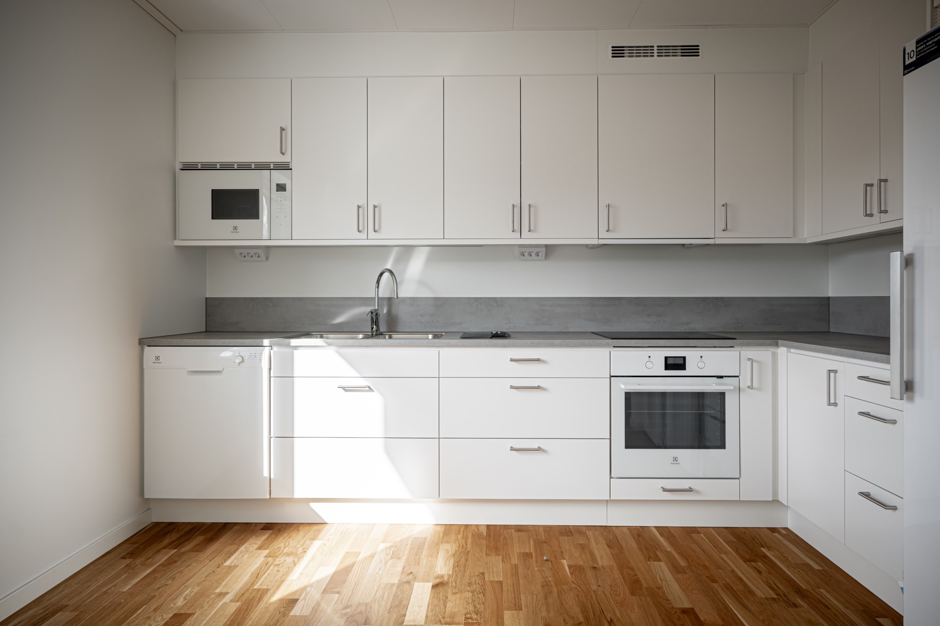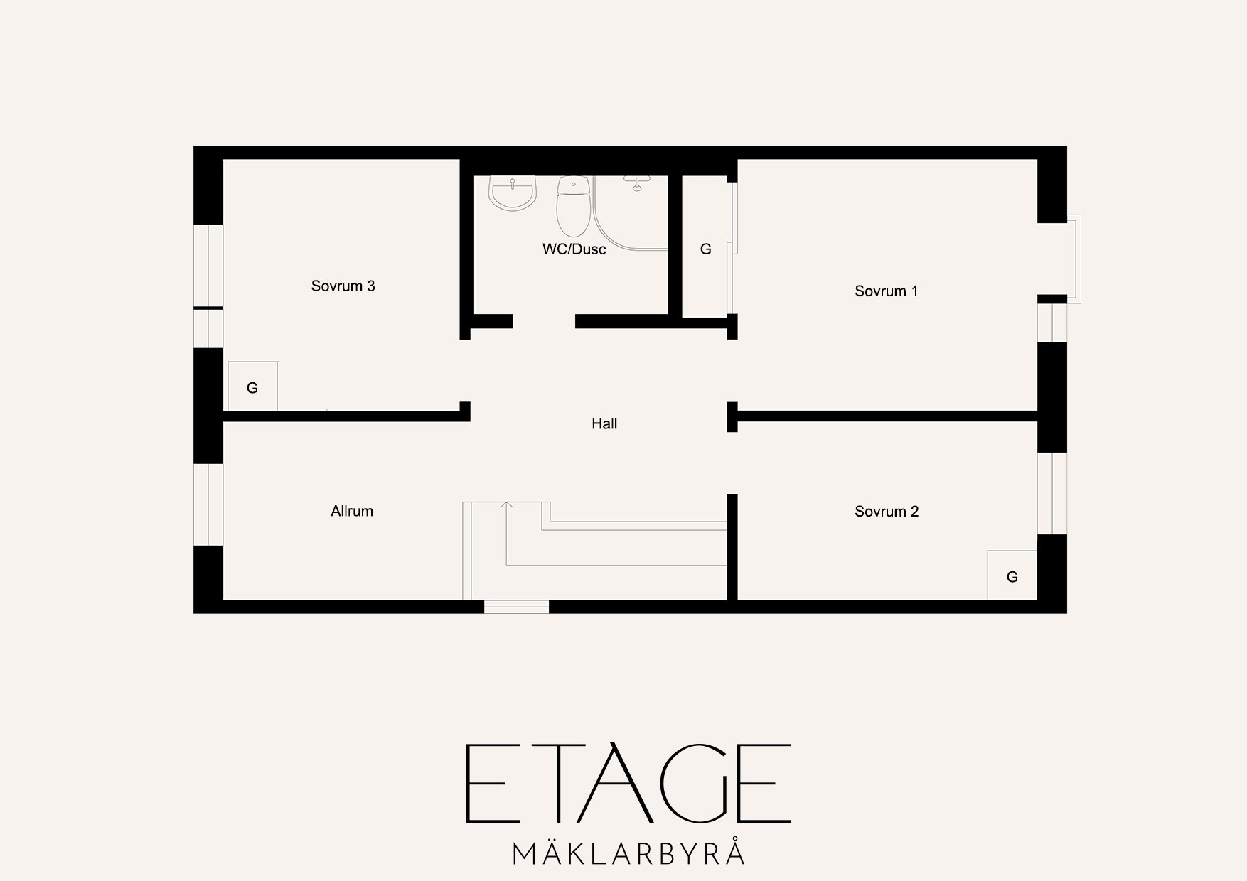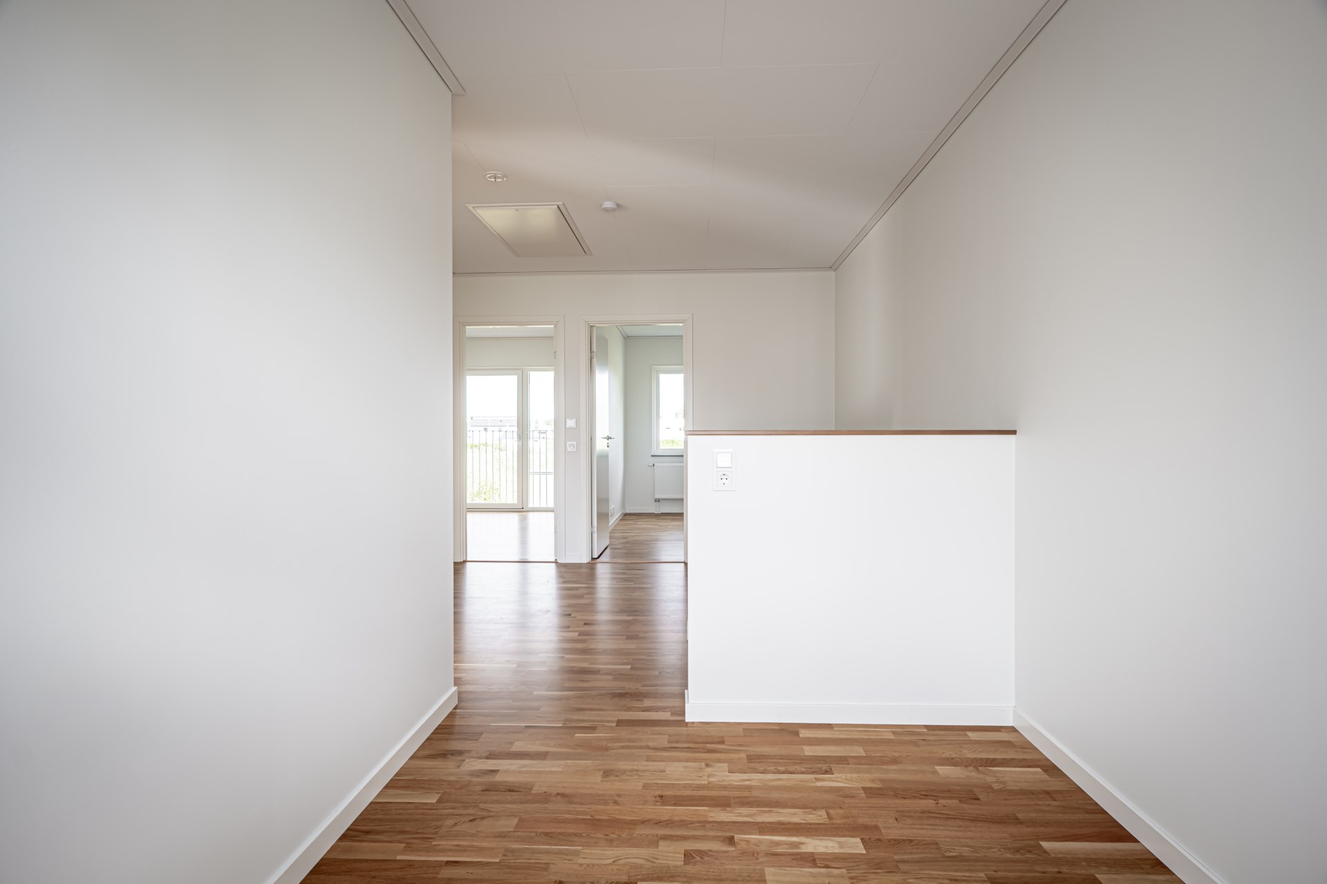 Trappan leder er sen till upp till övervåningen. Här möts du av en rymlig hall som knyter samman våningens alla rum. Planlösningen är väl genomtänkt med enhetliga golv och ljusa väggar. Det större sovrummet bjuder på en fransk balkong samt en generös skjutdörrsgarderob. De två övriga sovrummen har samma eleganta stil och är utrustade med varsin garderob. På detta plan finns även ett allrum – perfekt som tv-rum, lekhörna eller hemmakontor – samt ytterligare ett badrum. - Kök: De vita, släta köksluckorna ger ett fräscht och tidlöst intryck som lyfts av den mörkgrå laminatbänkskivan. Längs arbetsytan löper ett matchande stänkskydd i laminat som skapar en enhetlig helhet. Köket är utrustat med moderna vitvaror såsom inbyggnadsugn, mikrovågsugn, induktionshäll, kyl, frys, diskmaskin och köksfläkt.