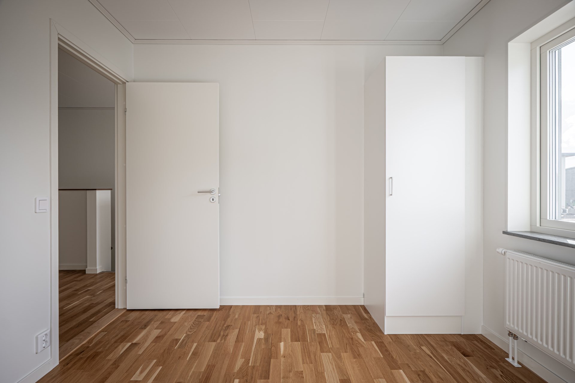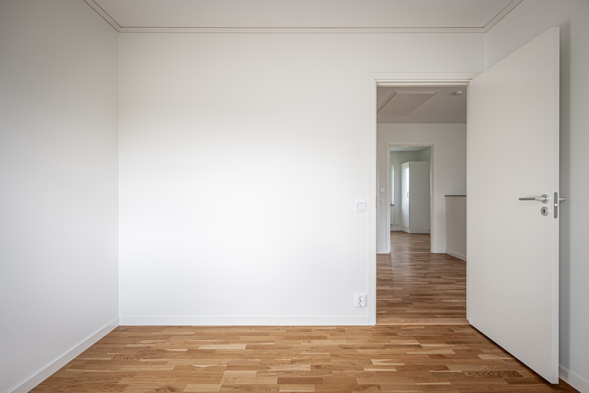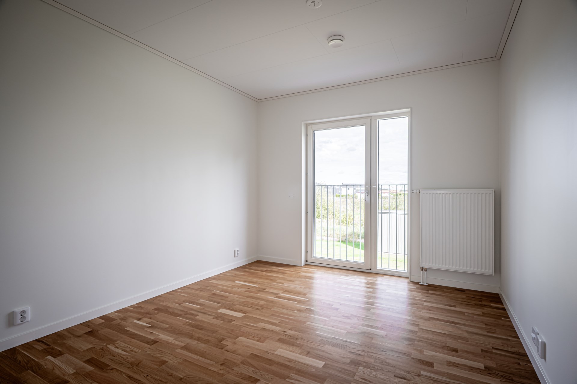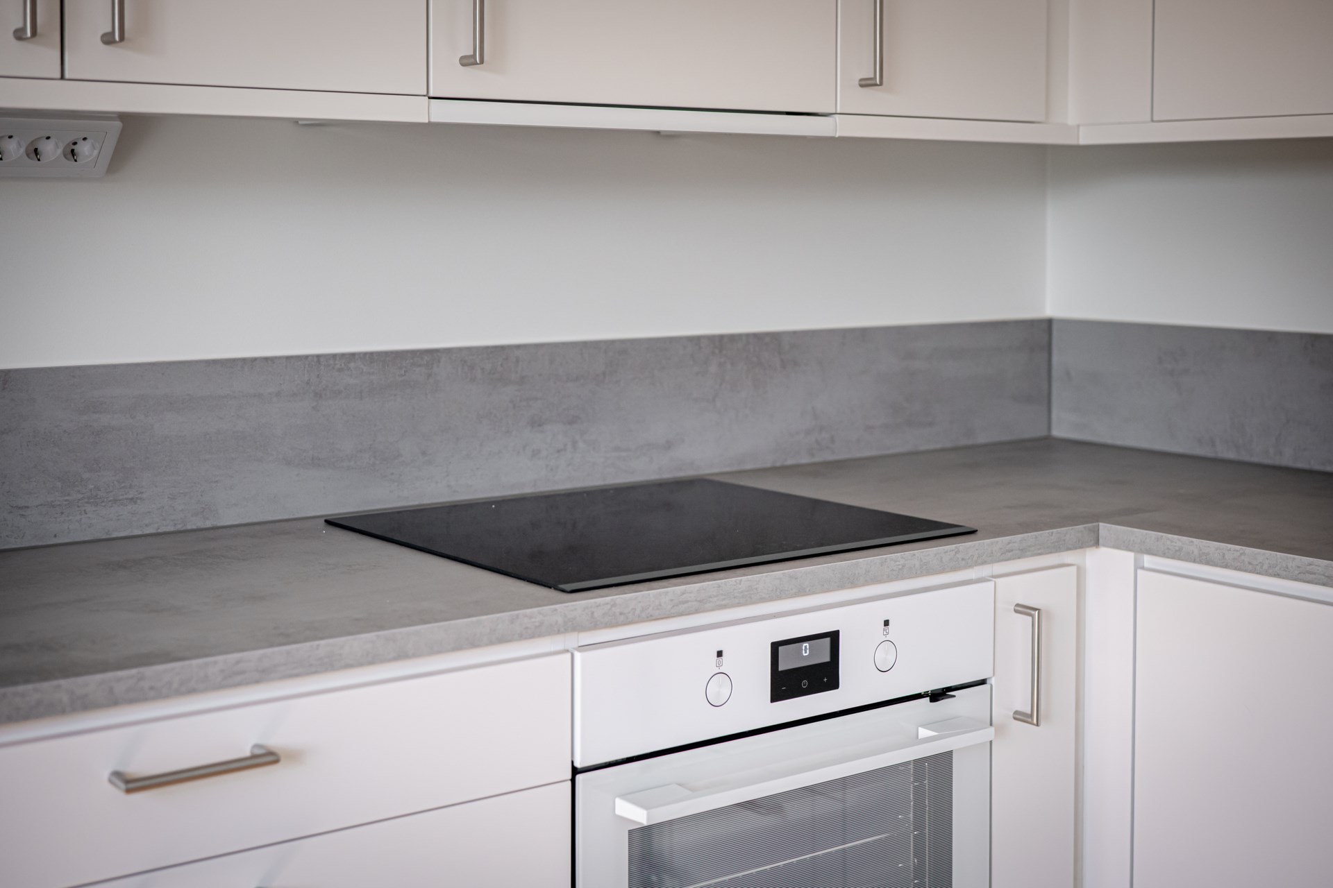 Trappan leder er sen till upp till övervåningen. Här möts du av en rymlig hall som knyter samman våningens alla rum. Planlösningen är väl genomtänkt med enhetliga golv och ljusa väggar. Det större sovrummet bjuder på en fransk balkong samt en generös skjutdörrsgarderob. De två övriga sovrummen har samma eleganta stil och är utrustade med varsin garderob. På detta plan finns även ett allrum – perfekt som tv-rum, lekhörna eller hemmakontor – samt ytterligare ett badrum. - Kök: De vita, släta köksluckorna ger ett fräscht och tidlöst intryck som lyfts av den mörkgrå laminatbänkskivan. Längs arbetsytan löper ett matchande stänkskydd i laminat som skapar en enhetlig helhet. Köket är utrustat med moderna vitvaror såsom inbyggnadsugn, mikrovågsugn, induktionshäll, kyl, frys, diskmaskin och köksfläkt.