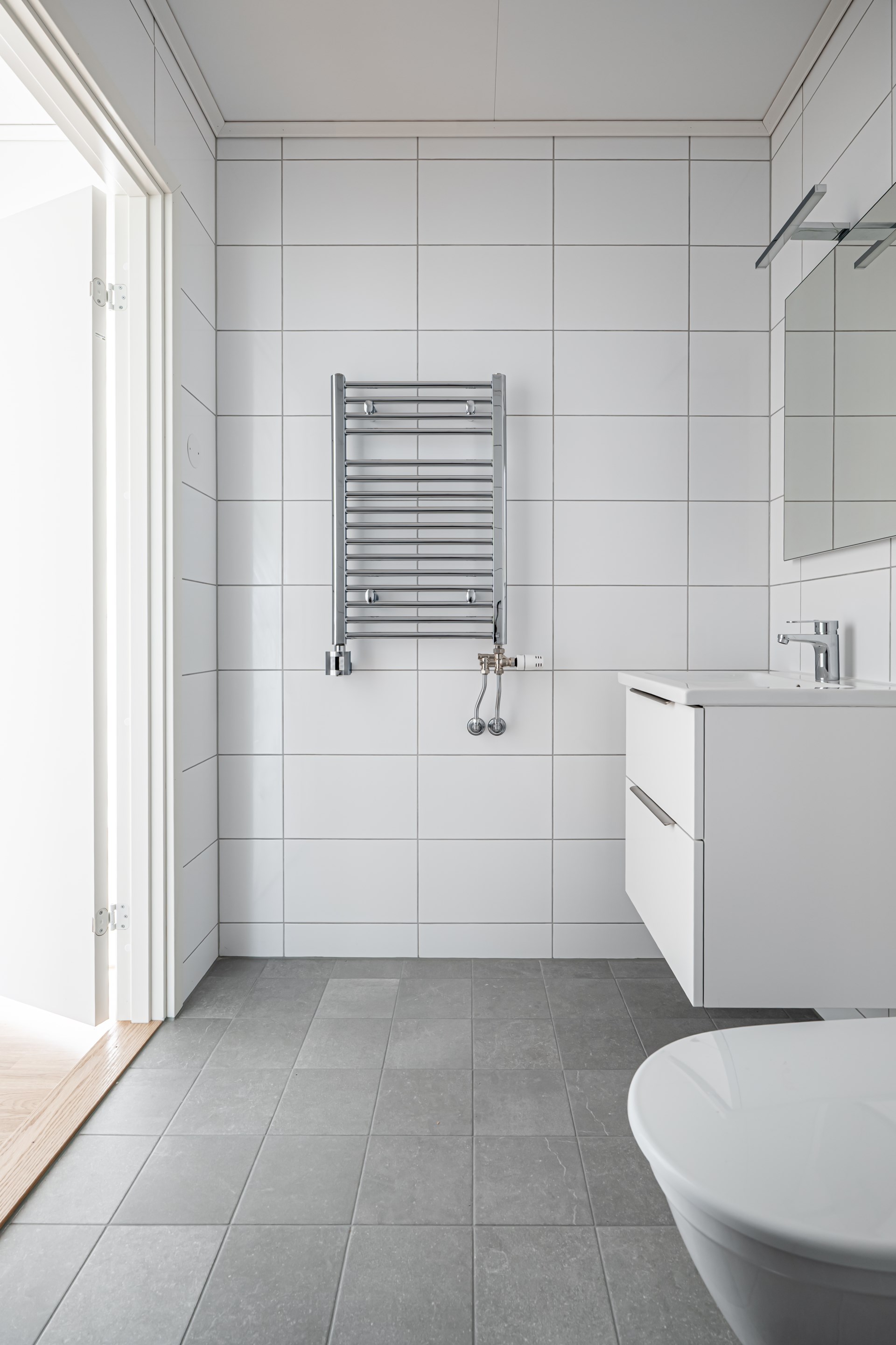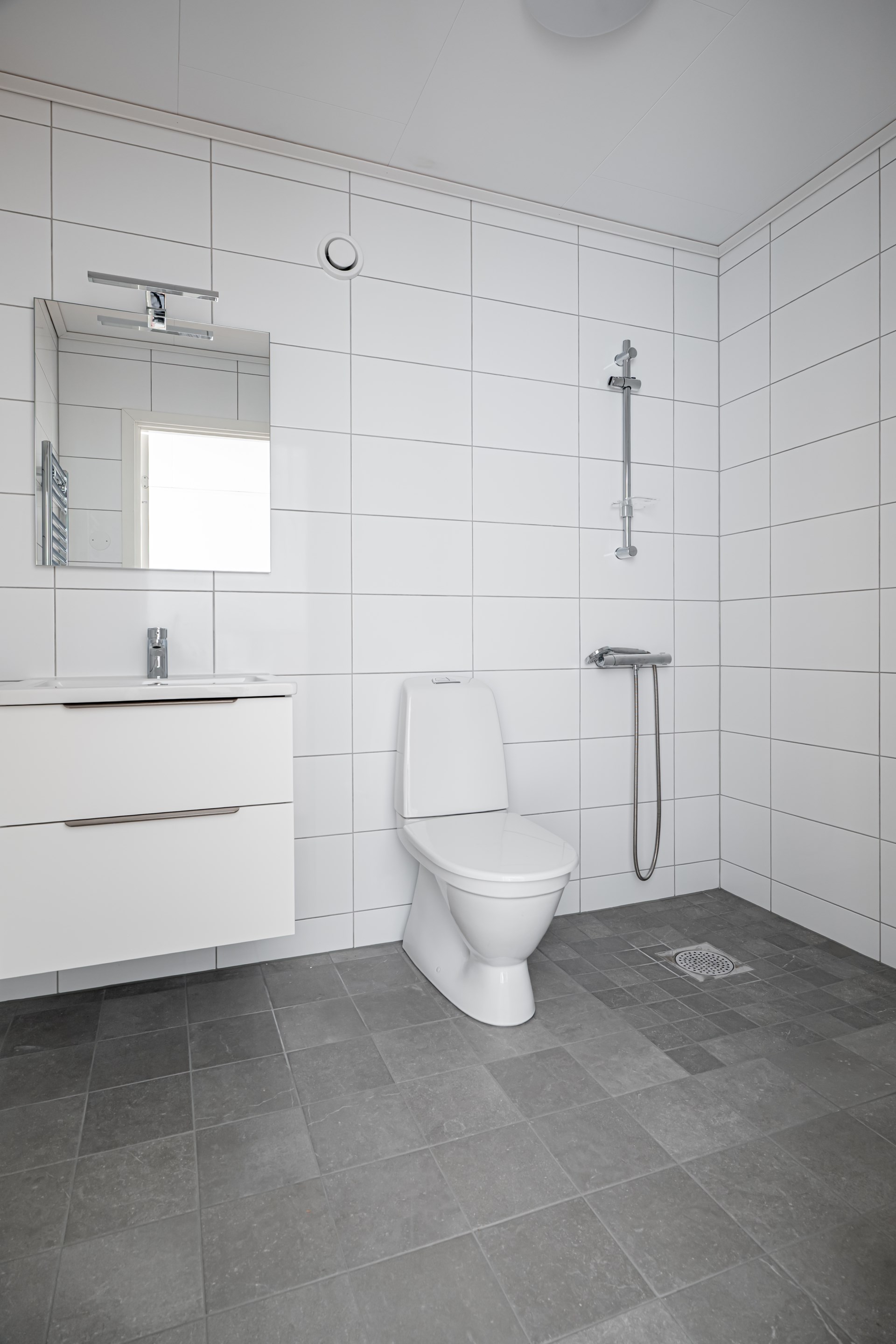 - Badrum: Badrum med grått klinkergolv och vitt kakel på väggarna. Badrummet är utrustat med handfat och vit kommod, spegel med belysning, WC, dusch samt en handdukstork.