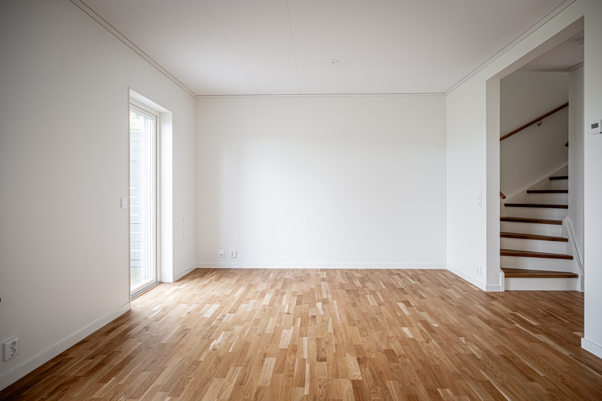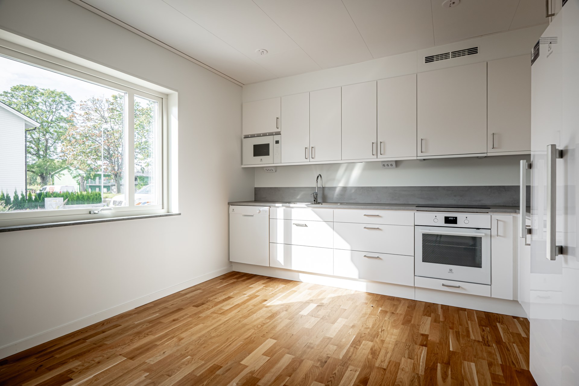 Köket följer samma enhetliga stil med ekparkett och ljusa väggar. Här finns gott om utrymme för både matlagning och en matplats där hela familjen kan samlas kring bordet. Intill ligger vardagsrummet som enkelt möbleras med en soffgrupp och som dessutom erbjuder utgång till en trivsam altan på baksidan – en perfekt plats för avkoppling utomhus. På entréplanet finner du även badrummet som är smart kombinerat med tvättstuga.