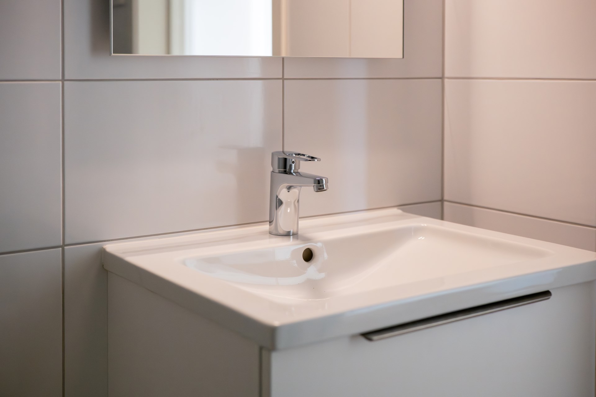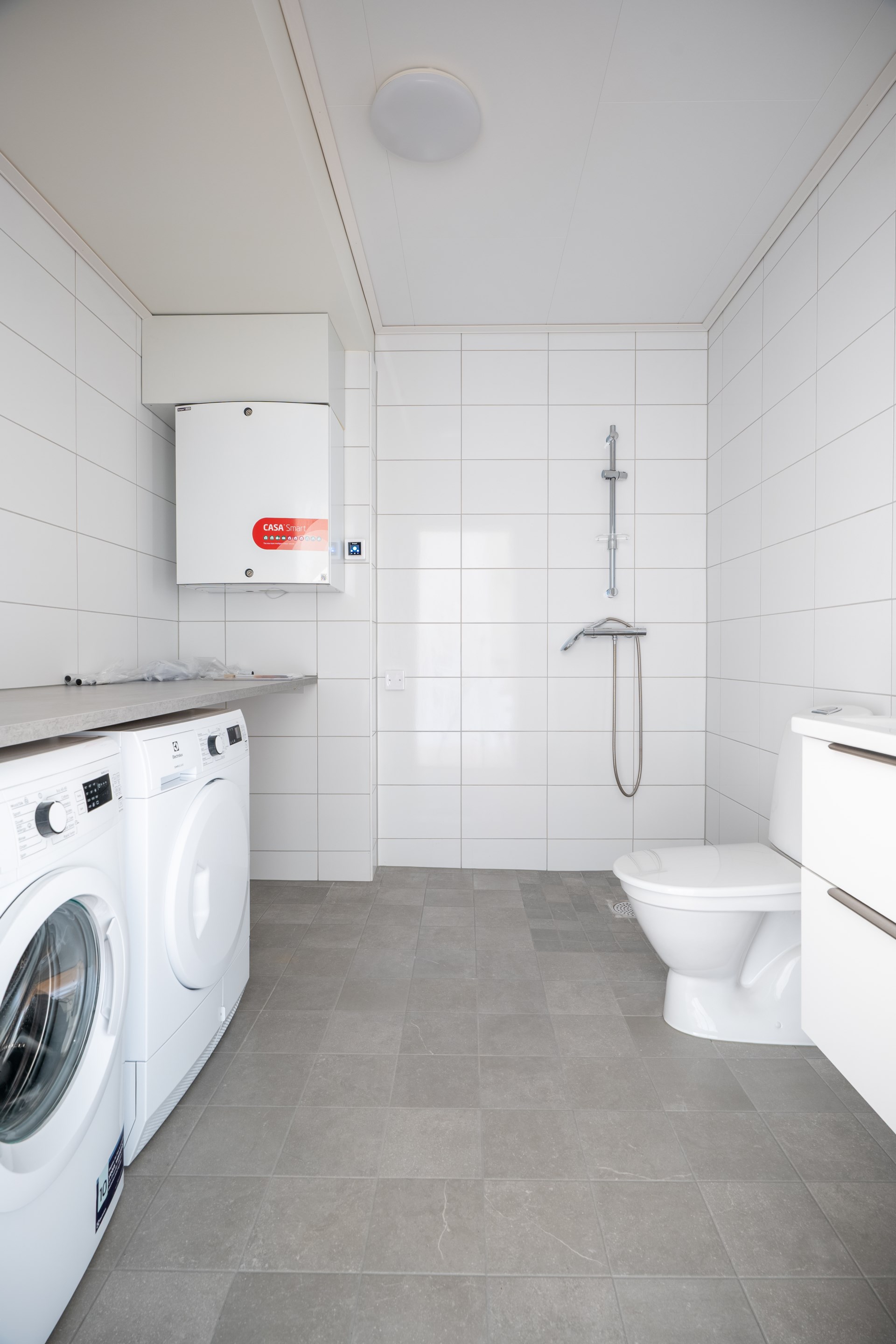- Badrum/Tvättstuga: Badrummet är stilrent inrett med grått klinkergolv med behaglig golvvärme och vita, kaklade väggar. Här finns ett handfat med vit kommod, spegel med belysning, WC samt en dusch. För extra bekvämlighet är badrummet även utrustat med tvättmaskin och torktumlare, med en praktisk laminatbänkskiva ovanpå som underlättar vid vikning och sortering av tvätt.