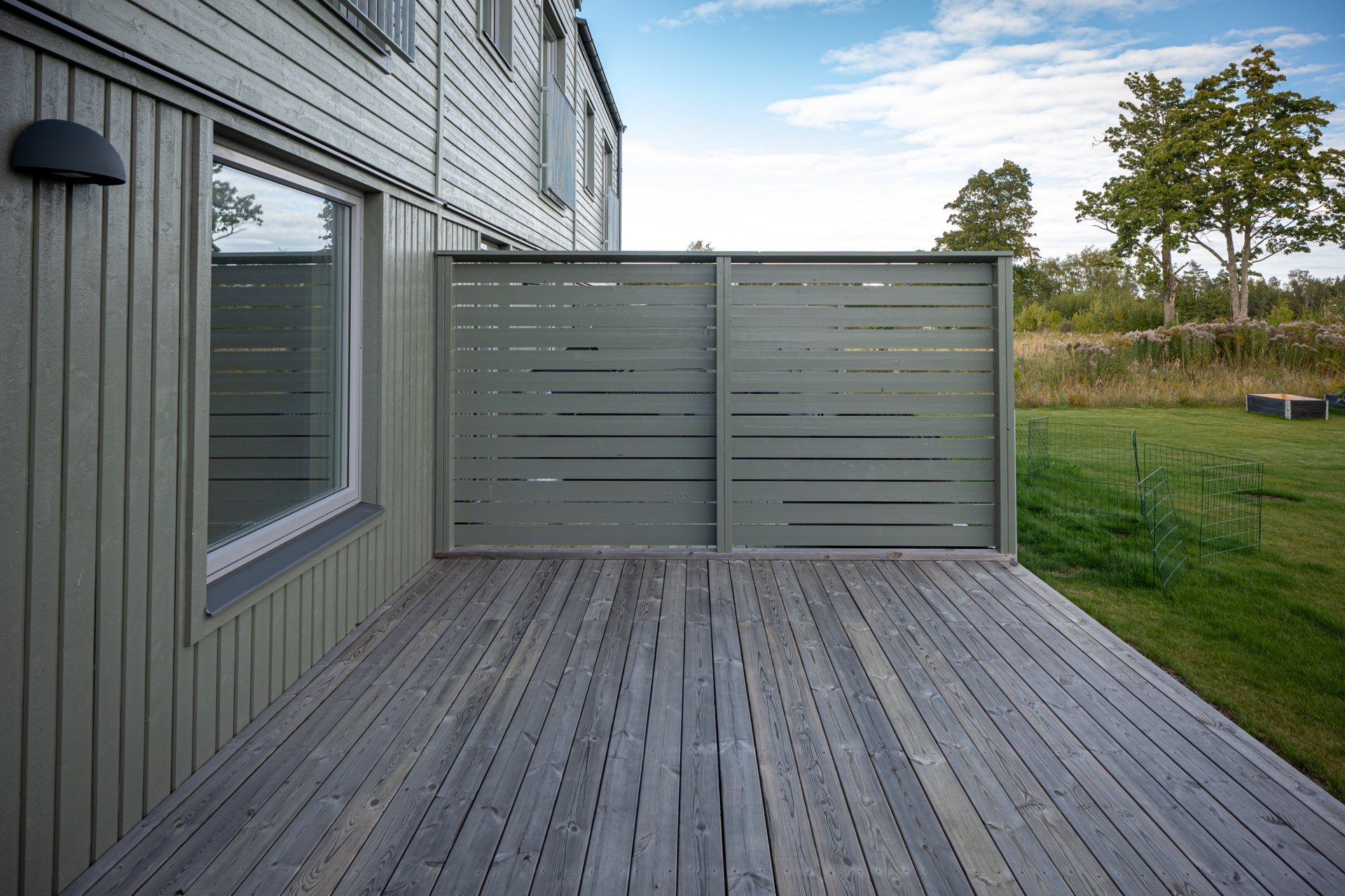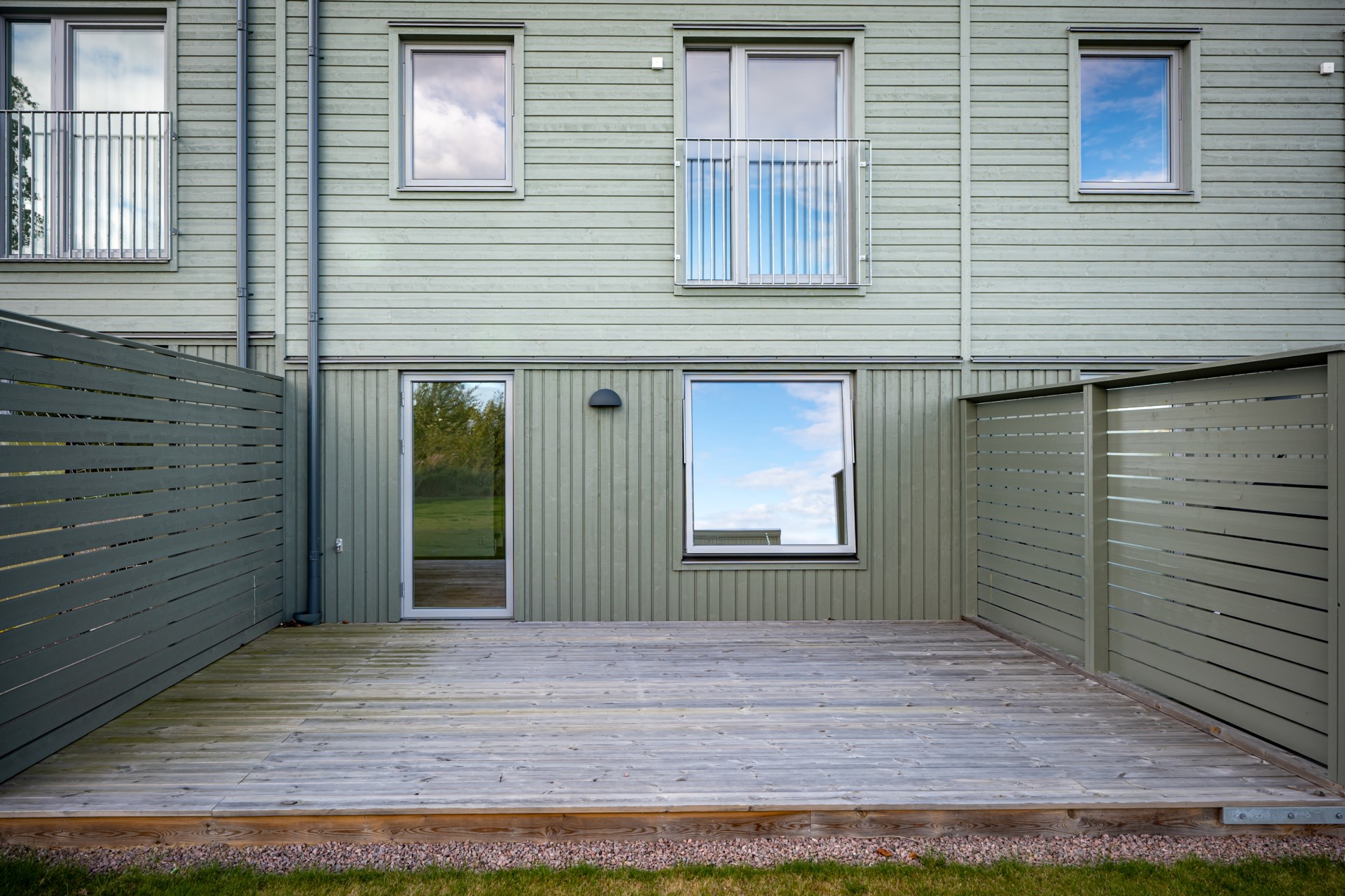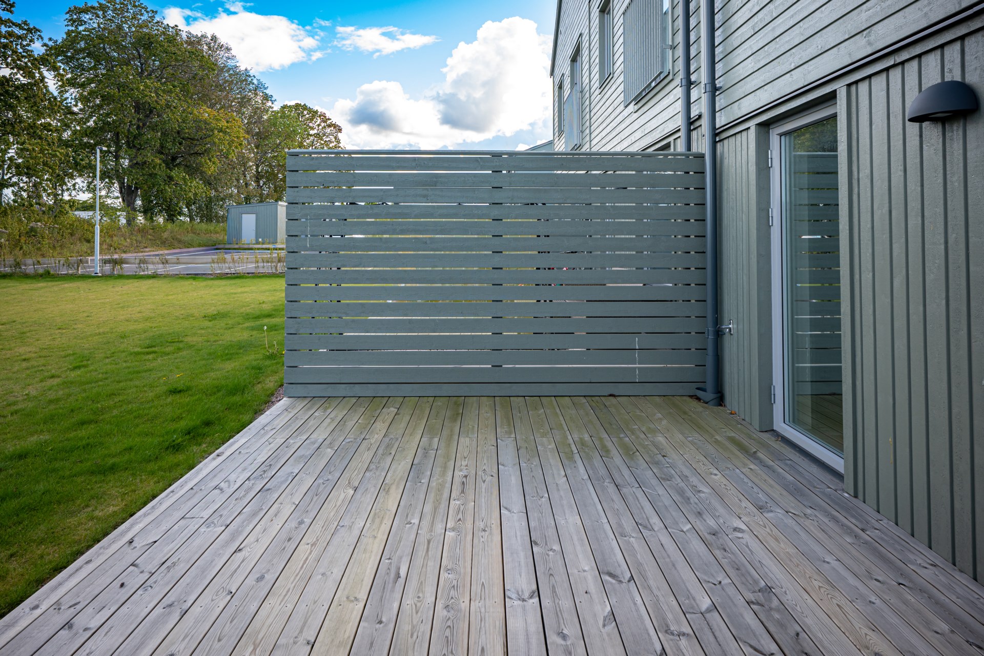 - Beskrivning Balkong/Uteplats: Utomhus kan du njuta av två uteplatser. På baksidan finns en altan med trädäck i österläge och en skiljevägg som skapar avskildhet mot grannen. På framsidan finns en stenlagd uteplats i västerläge, där du kan njuta av eftermiddagssolen.