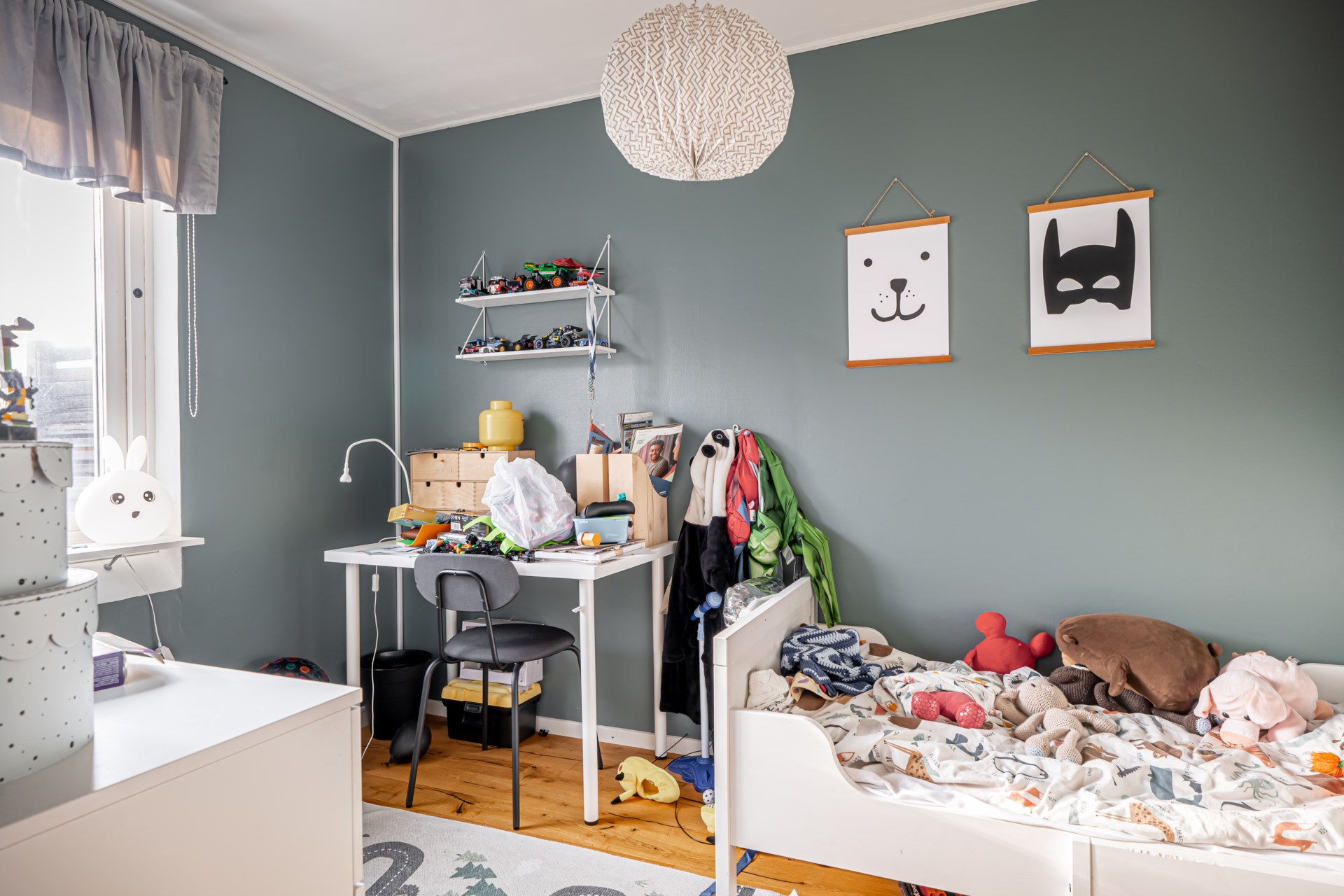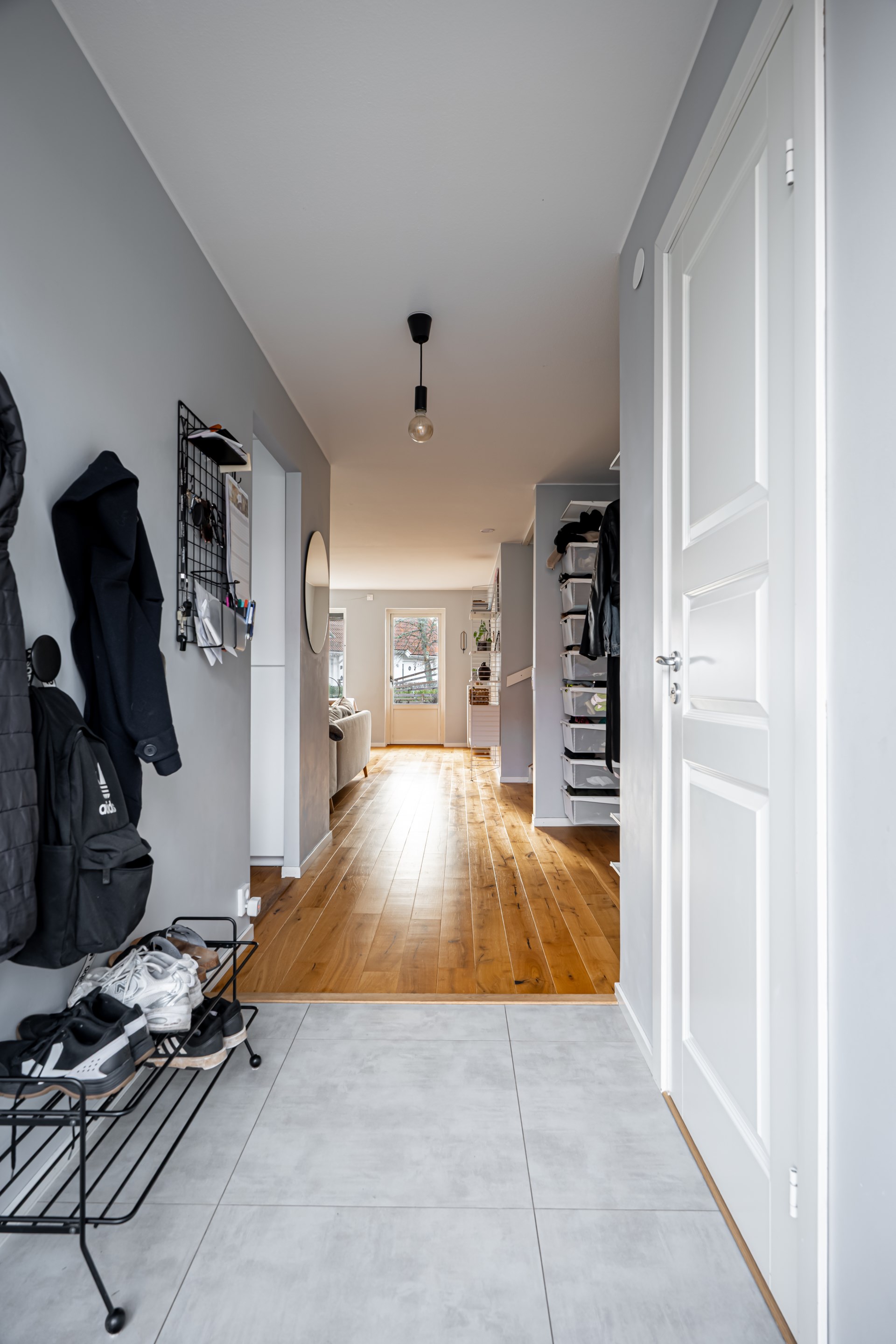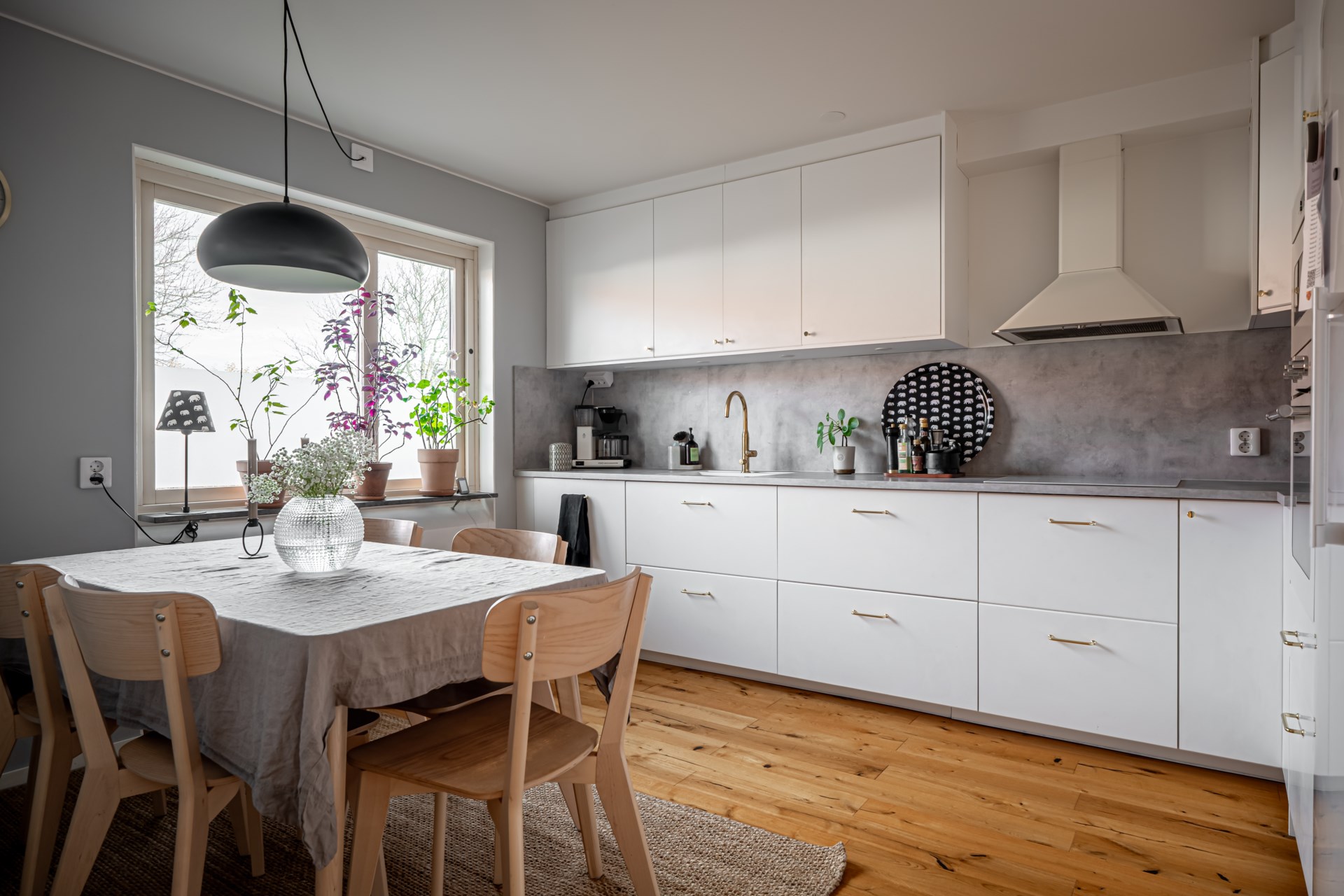 På varsin sida om vardagsrummet finns två sovrum, varav det ena med plats för dubbelsäng. En trappa upp möts ni av ett härligt allrum – perfekt för soffhörna, tv-rum eller kanske ett hemmakontor. Här finns även ett badrum, en rymlig klädkammare och två sovrum i bra storlek. - Kök: Renoverat kök från IKEA med släta luckor och bra bänkyta för matlagning. Köket är utrustat med spishäll, fläkt, integrerad diskmaskin, inbyggd ugn och micro samt kyl och frys i fullhöjd. I köket finns det plats för ett matbord med fyra stolar.