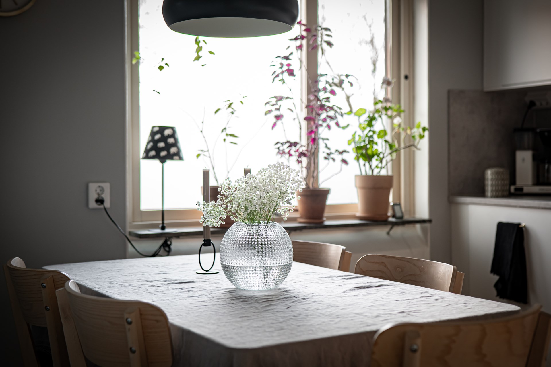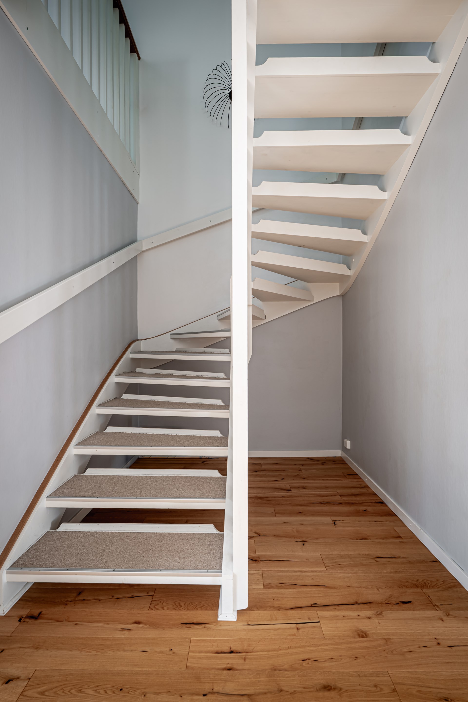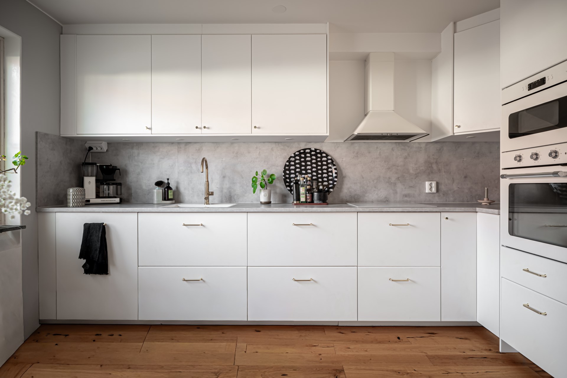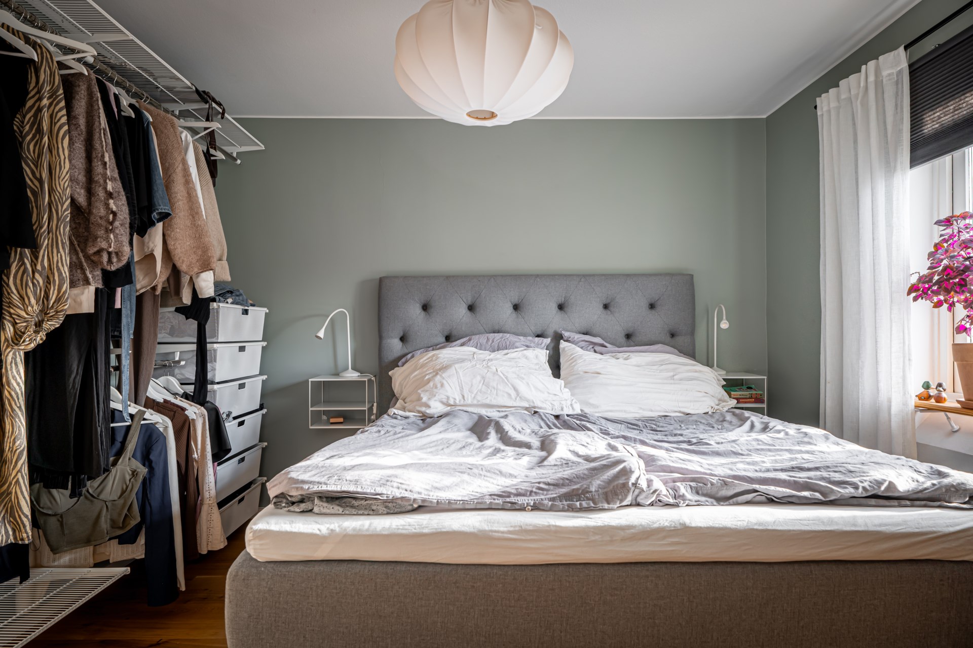 På varsin sida om vardagsrummet finns två sovrum, varav det ena med plats för dubbelsäng. En trappa upp möts ni av ett härligt allrum – perfekt för soffhörna, tv-rum eller kanske ett hemmakontor. Här finns även ett badrum, en rymlig klädkammare och två sovrum i bra storlek. - Kök: Renoverat kök från IKEA med släta luckor och bra bänkyta för matlagning. Köket är utrustat med spishäll, fläkt, integrerad diskmaskin, inbyggd ugn och micro samt kyl och frys i fullhöjd. I köket finns det plats för ett matbord med fyra stolar.