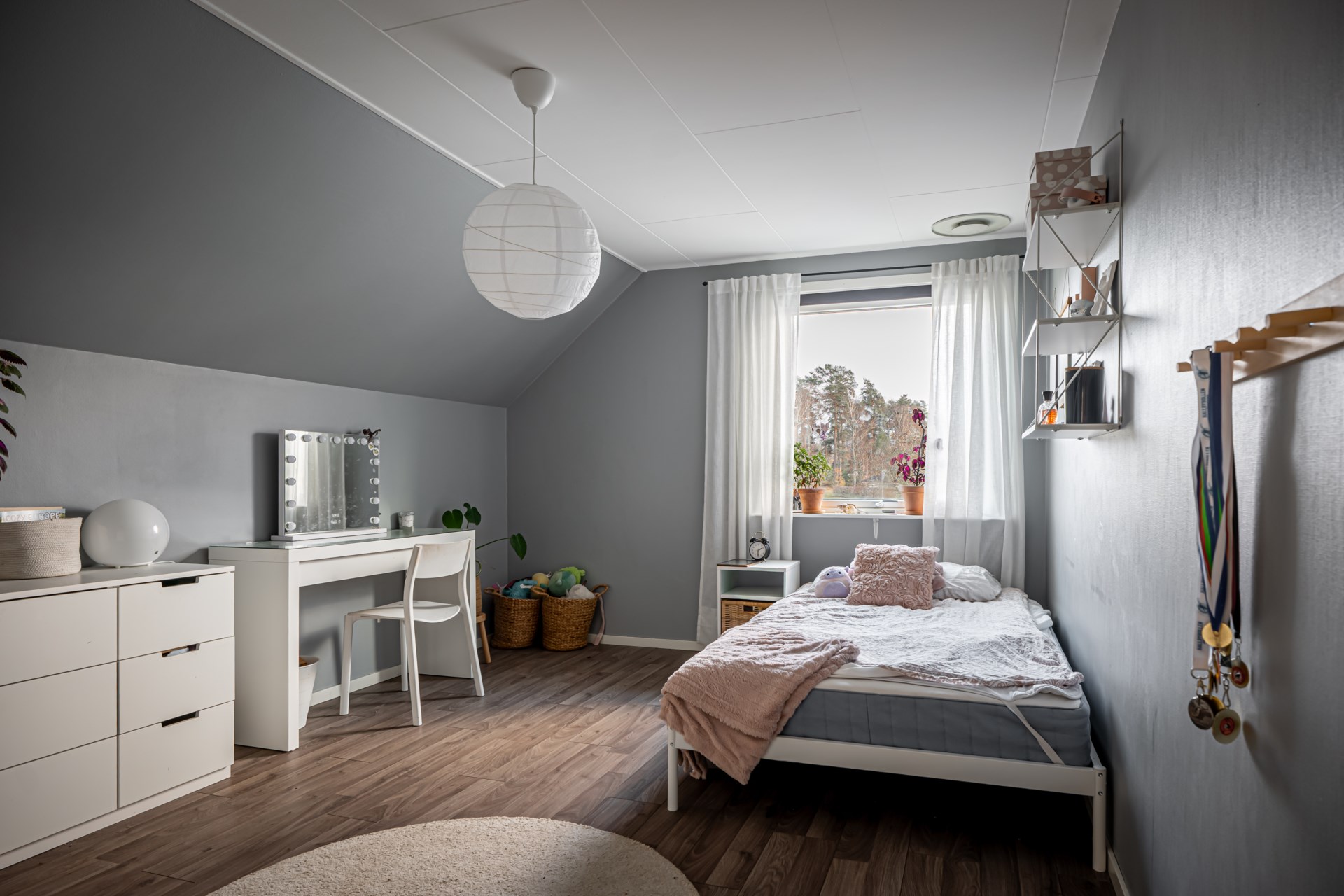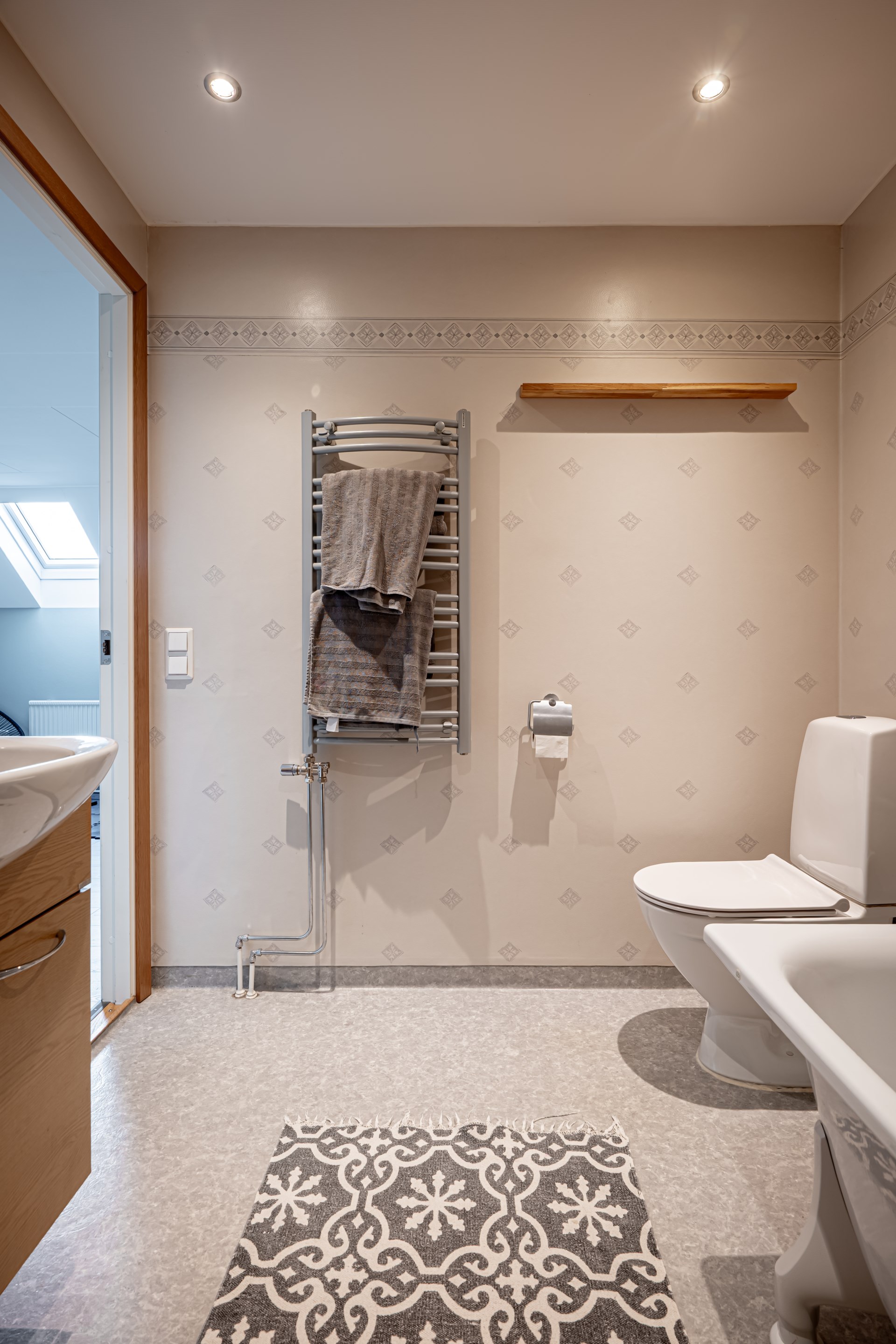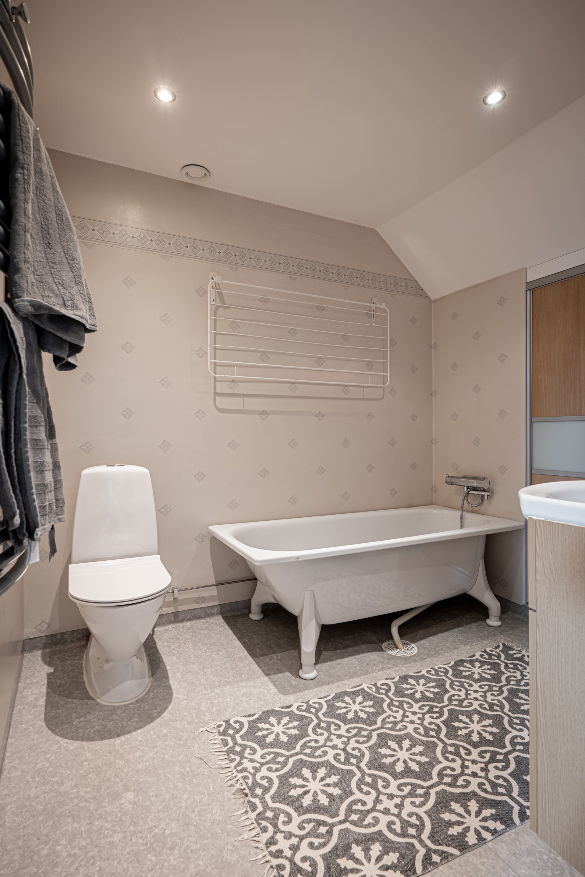 - Badrum: Badrummet på övre plan är rymligt och har våtrumsmatta på väggar och golv. I badrummet har ni toalett, kommod och badkar. Här finns även bra förvaringsmöjligheter i form av en skjutdörrsgarderob.