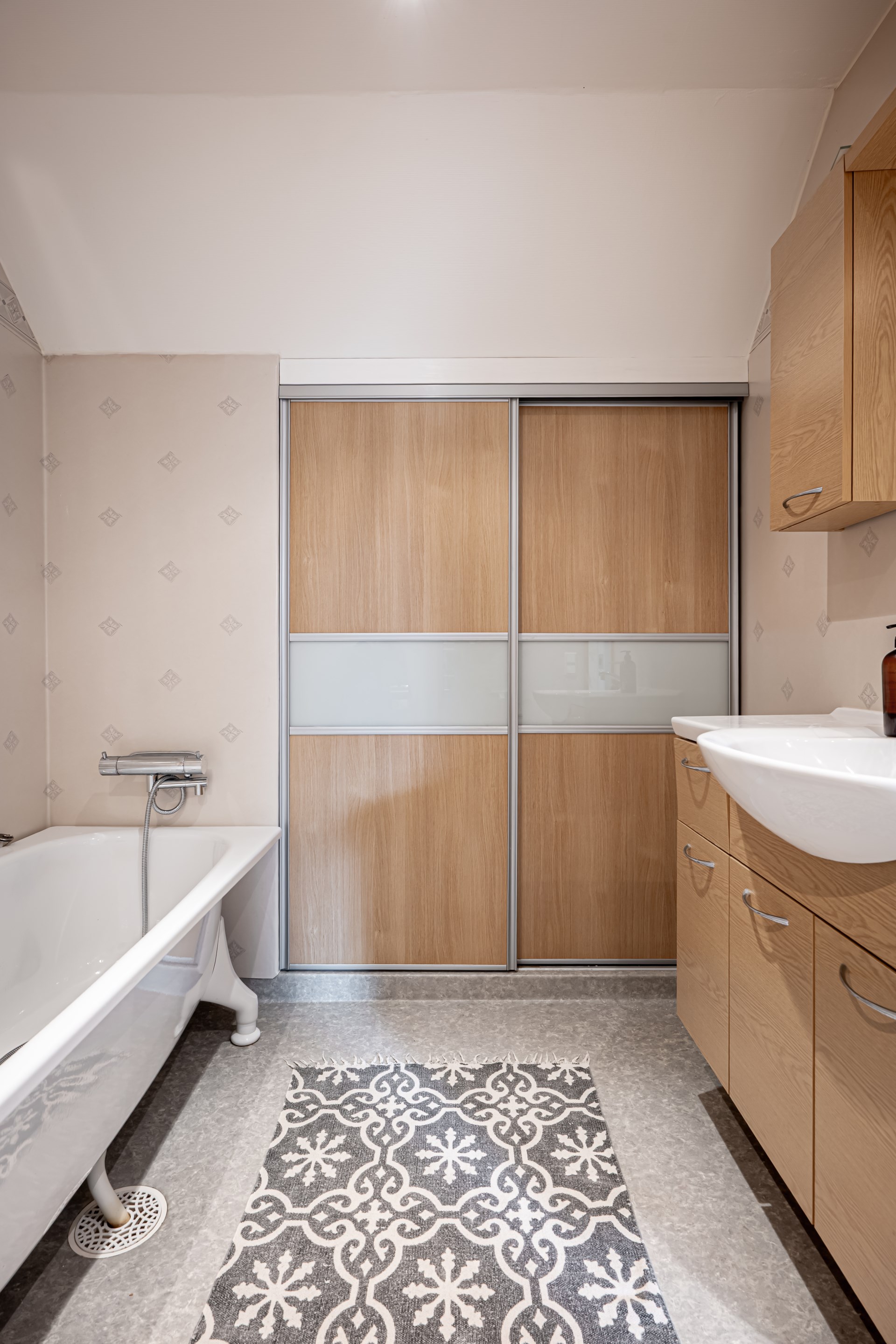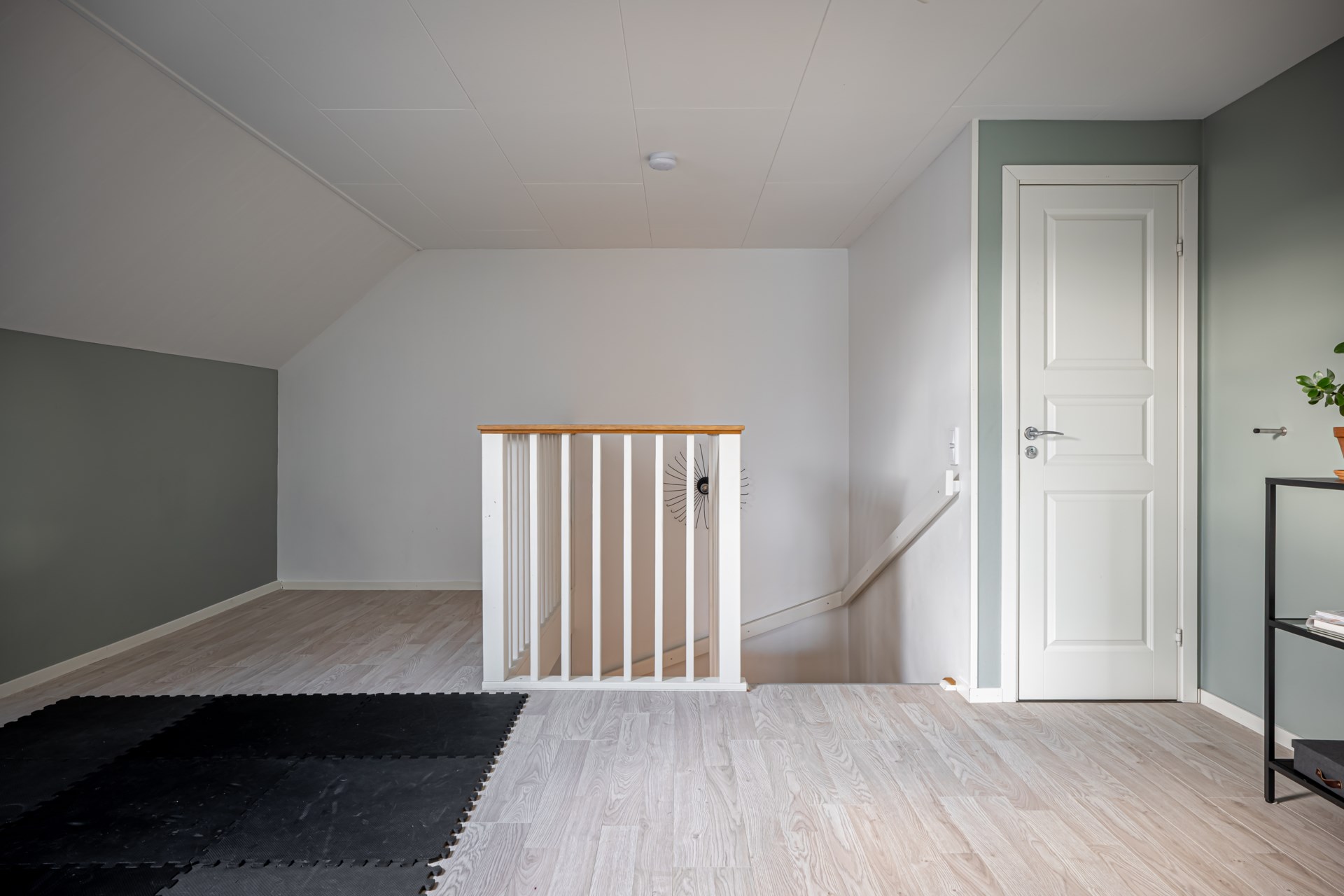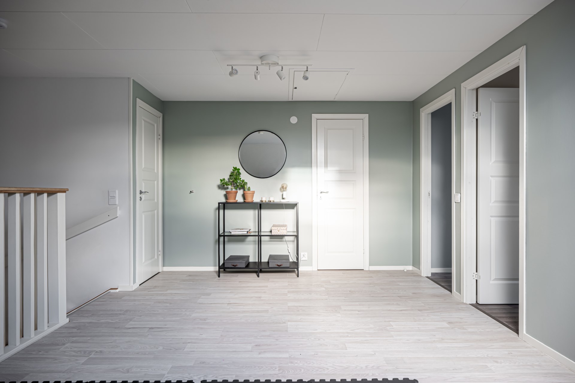 - Badrum: Badrummet på övre plan är rymligt och har våtrumsmatta på väggar och golv. I badrummet har ni toalett, kommod och badkar. Här finns även bra förvaringsmöjligheter i form av en skjutdörrsgarderob.