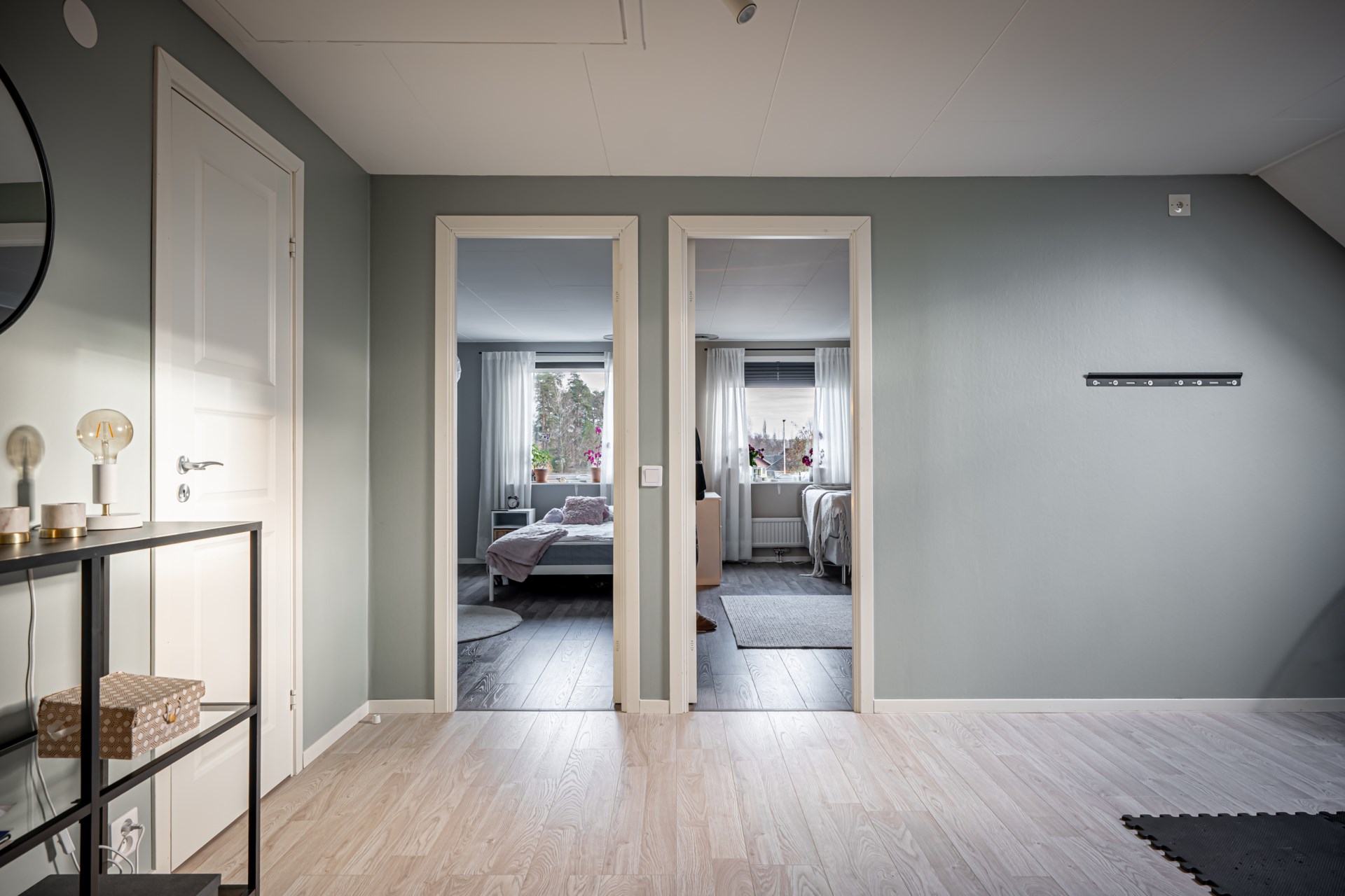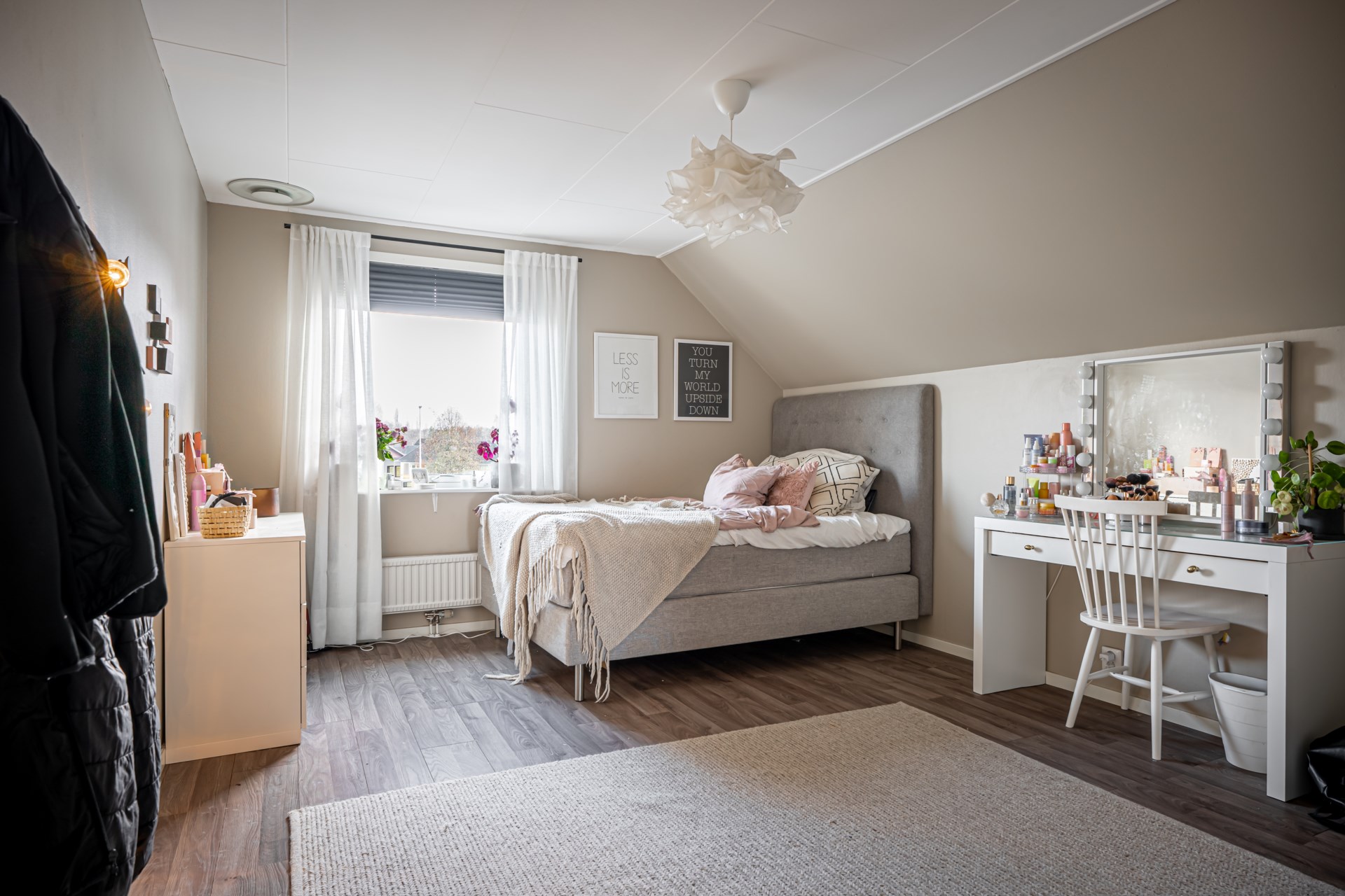 På övre plan finns ytterligare två sovrum, ett allrum och ett badrum, vilket skapar naturliga ytor för både vila och gemenskap. Ett idealiskt hem för dig som önskar ett lättskött och funktionellt boende med gott om plats för hela familjen.