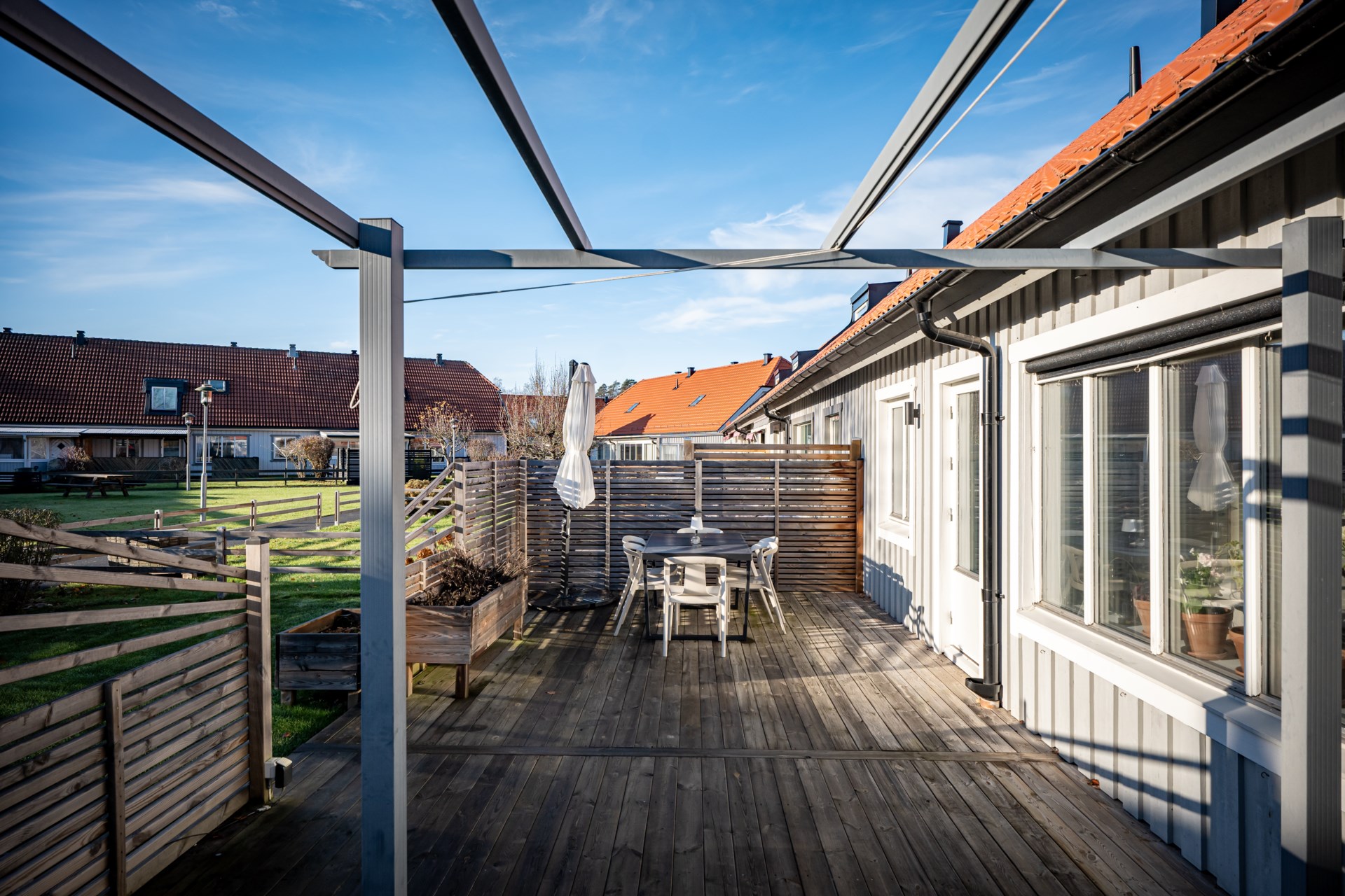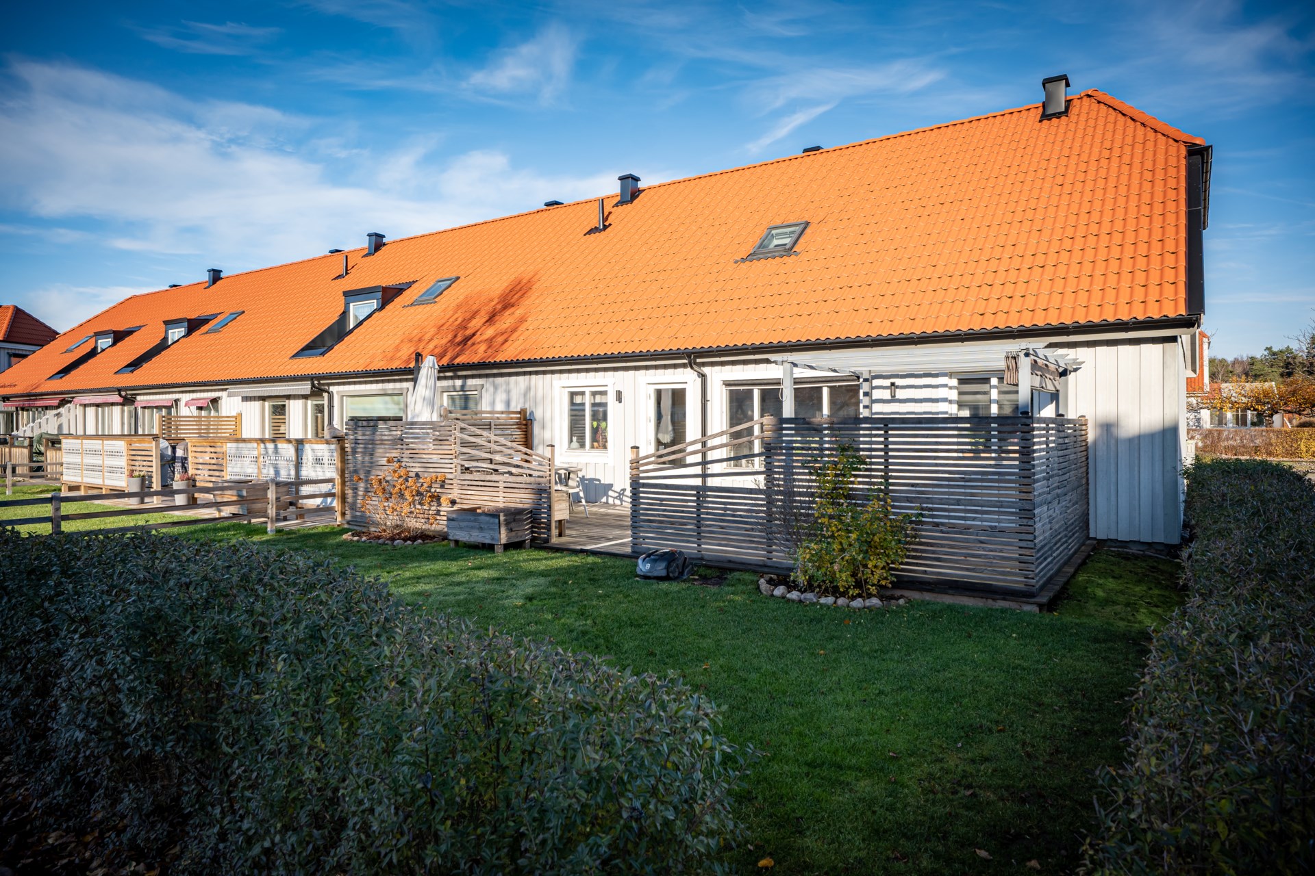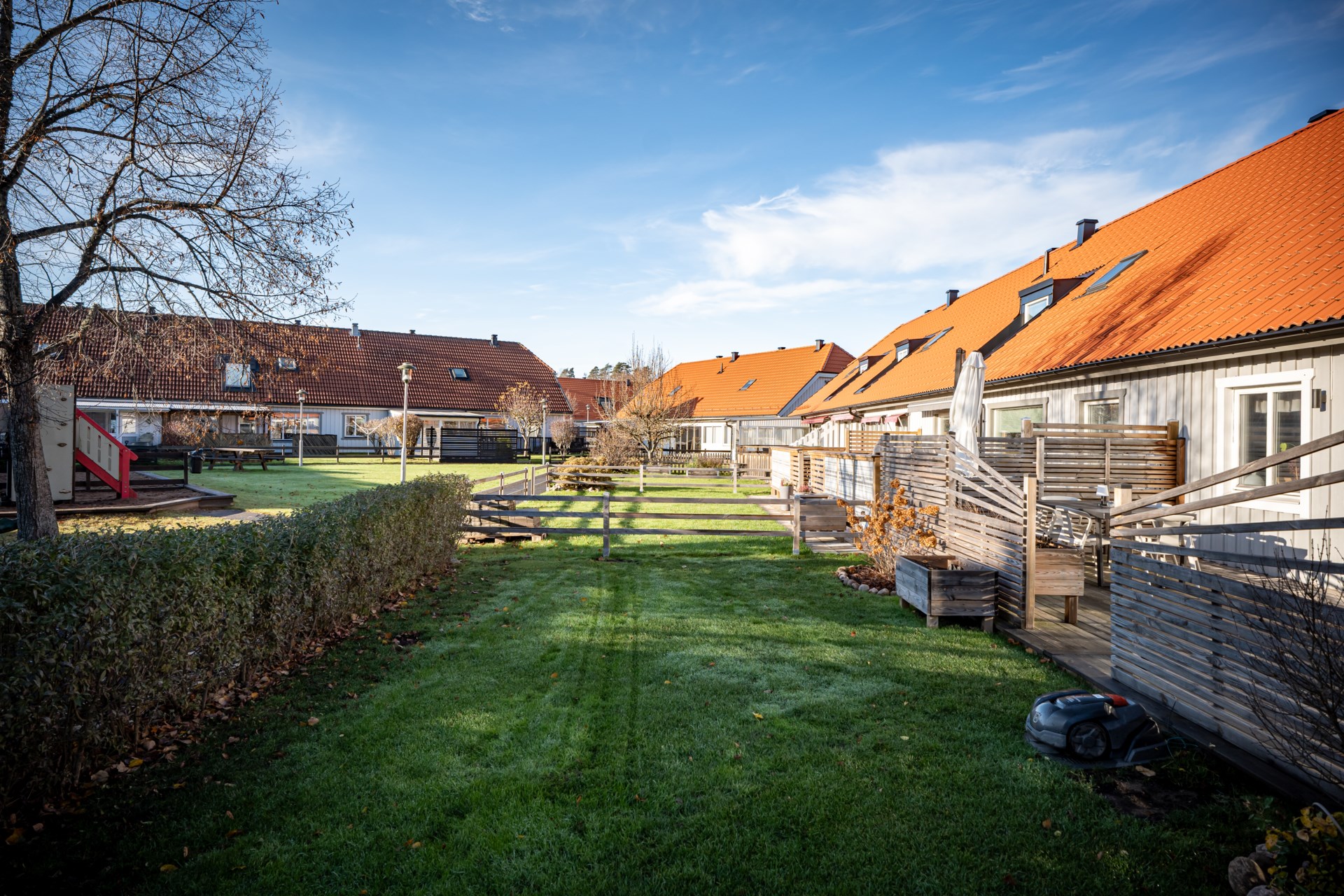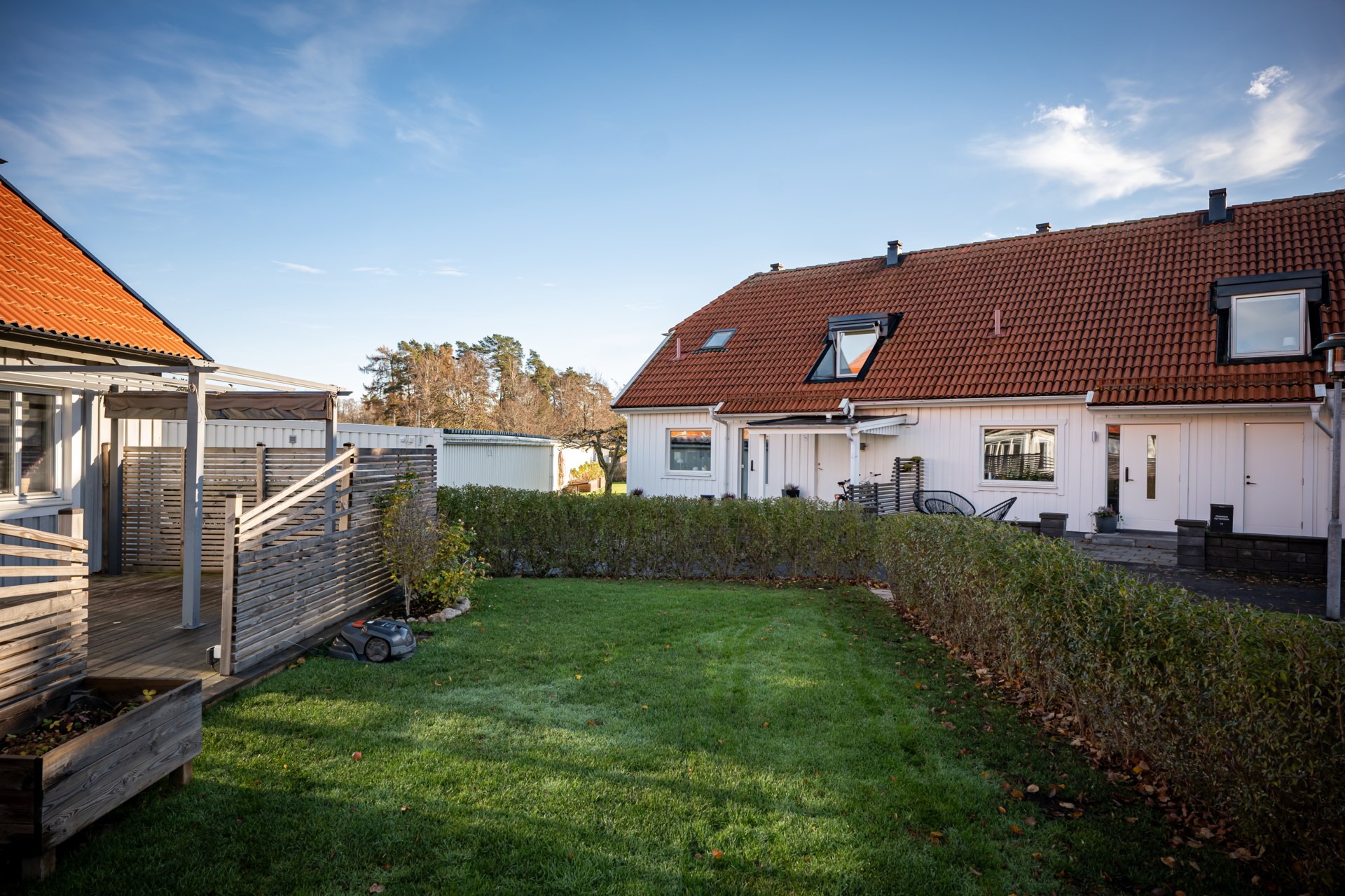 Välkommen till ett trivsamt och välskött radhus med perfekt läge för barnfamiljen! Här bor du bekvämt med genomgående fina färgval, ett renoverat kök och ett badrum från 2018, allt i ett hem som känns både modernt och ombonat.Radhuset har fyra sovrum i bra storlek och en planlösning som gör det enkelt att trivas tillsammans. Det renoverade köket bjuder in till vardagsmat och middagar i gott sällskap, och från vardagsrummet nås den stora altanen på baksidan, en härlig plats för sommarens grillkvällar och lek. Gavelläget ger ett extra ljusinsläpp och en känsla av rymd, samtidigt som tomten erbjuder fin avskildhet. Direkt bakom huset finns en lekplats, så barnen kan leka tryggt medan du har uppsikt från altanen.
