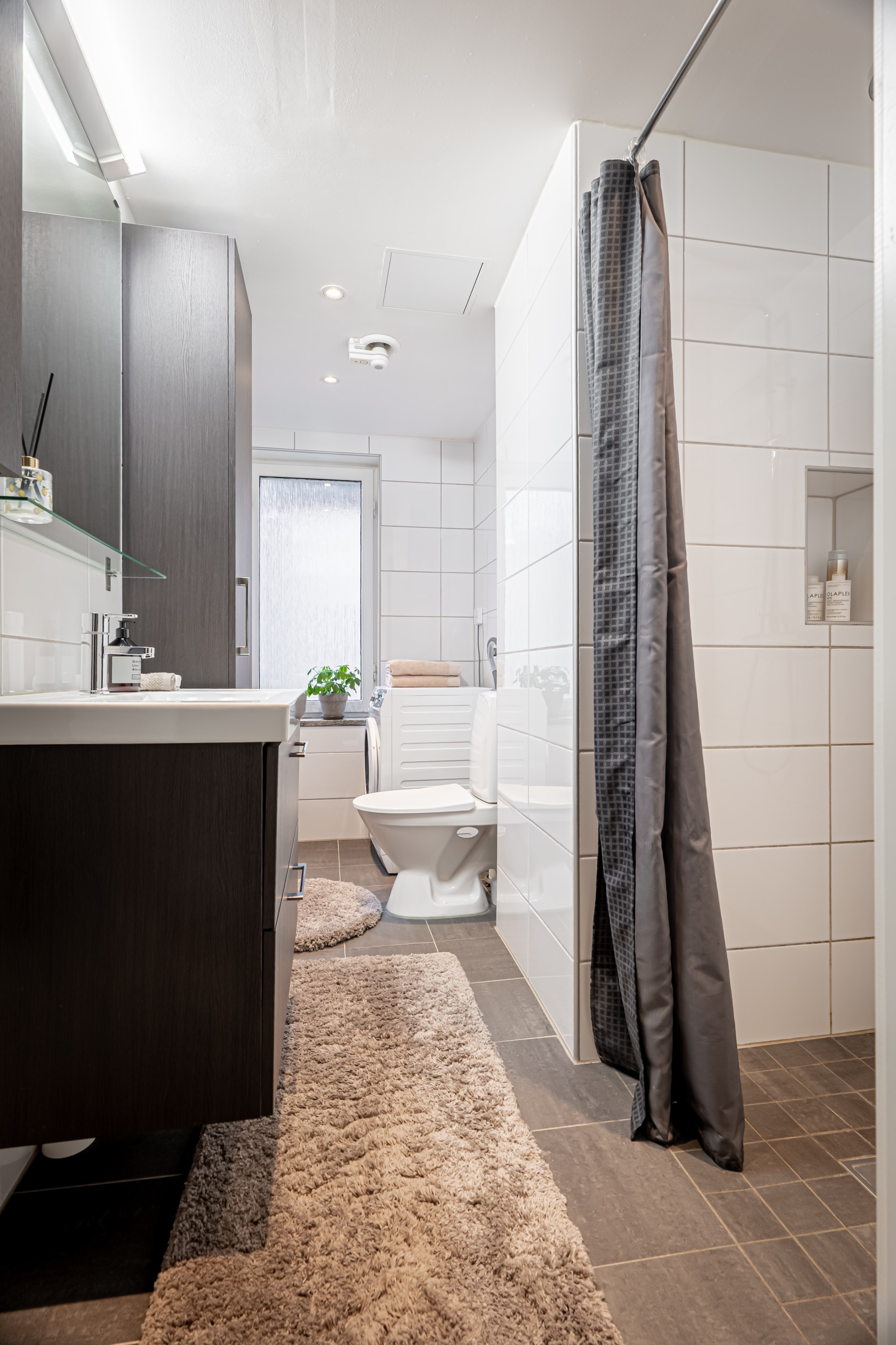 • Badrum: Helkaklat badrum med dusch, wc, handfat och tvättmaskin.