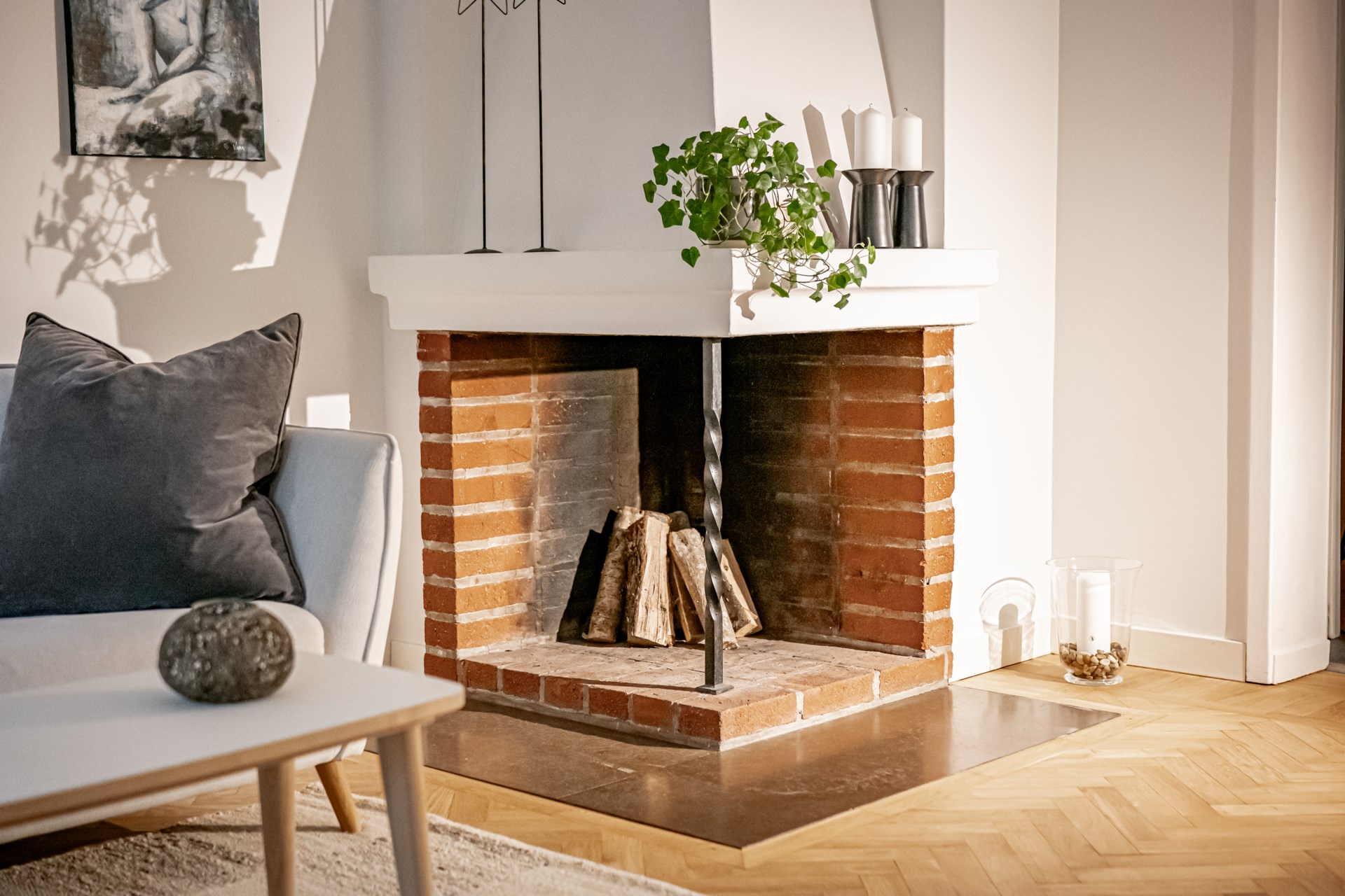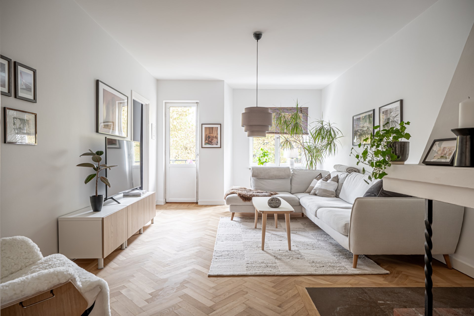 Vardagsrummet imponerar med sin vackra fiskbensparkett, stora fönster som släpper in generöst med ljus och en stämningsfull öppen spis som skapar en inbjudande känsla året om. Här finns utrymme för både soffa och en läshörna, en perfekt plats att samla nära och kära.