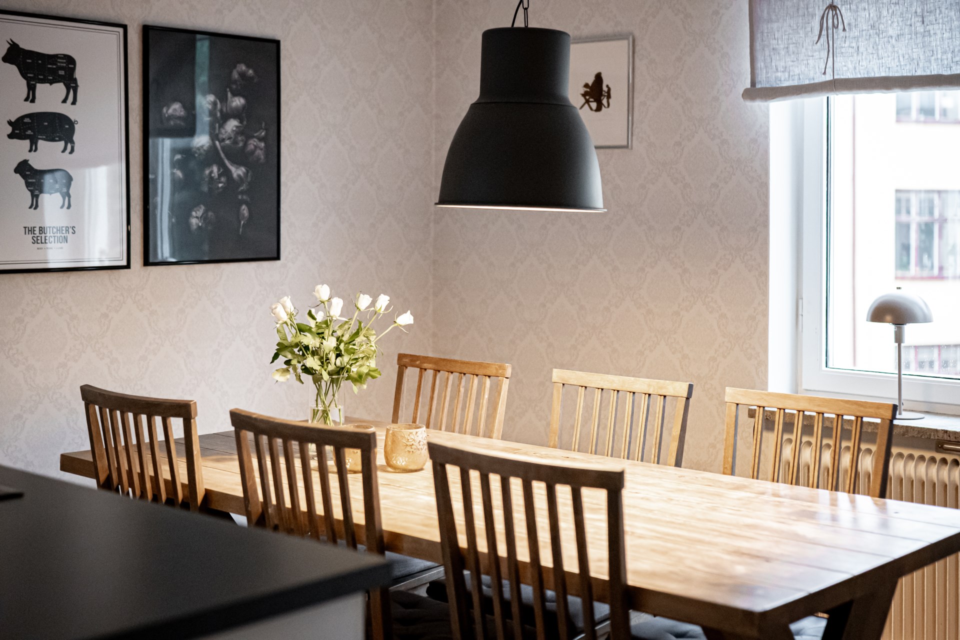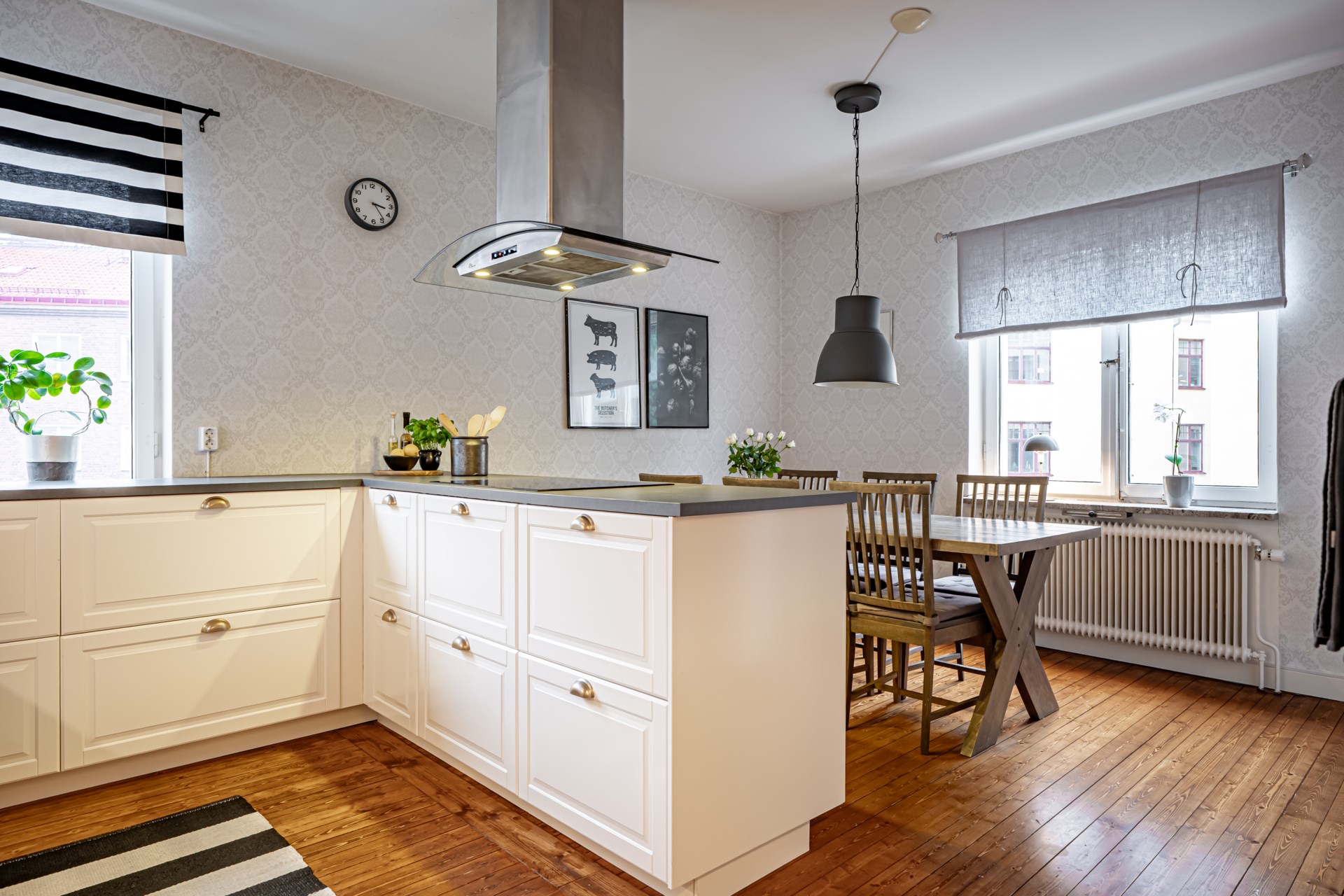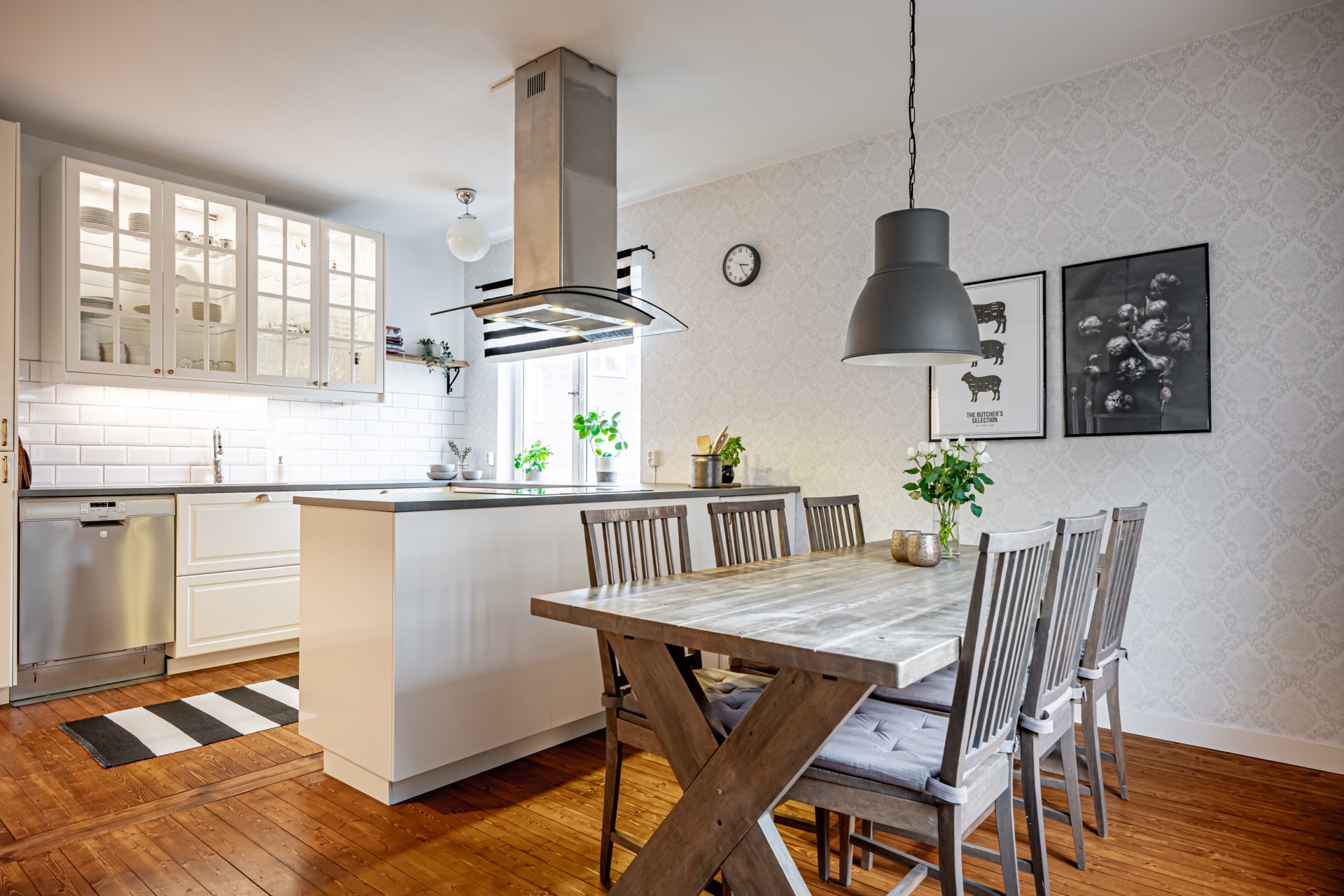 Redan när du kliver in möts du av en hemtrevlig atmosfär där klassiska detaljer samspelar med moderna inslag. Köket är både funktionellt och socialt, med gott om arbetsyta och förvaring samt plats för ett rejält matbord. Här finns alla förutsättningar för att laga middagar med vänner eller njuta av en lugn frukost i morgonljuset.