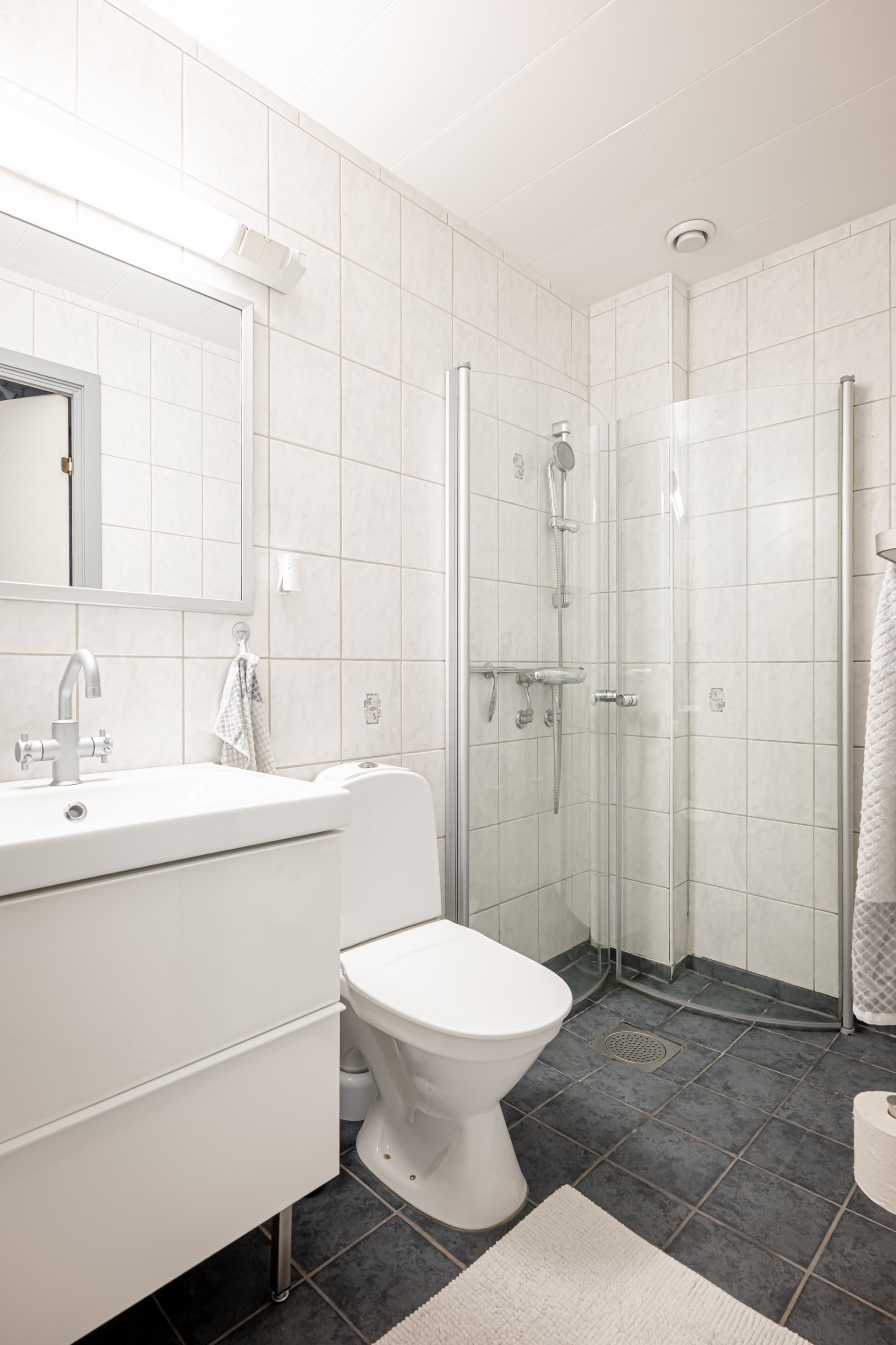 - Bardrum: Helkaklat badrum med klinker på golvet. I badrummet har ni toalett, kommod, spegel och dusch med glasväggar.