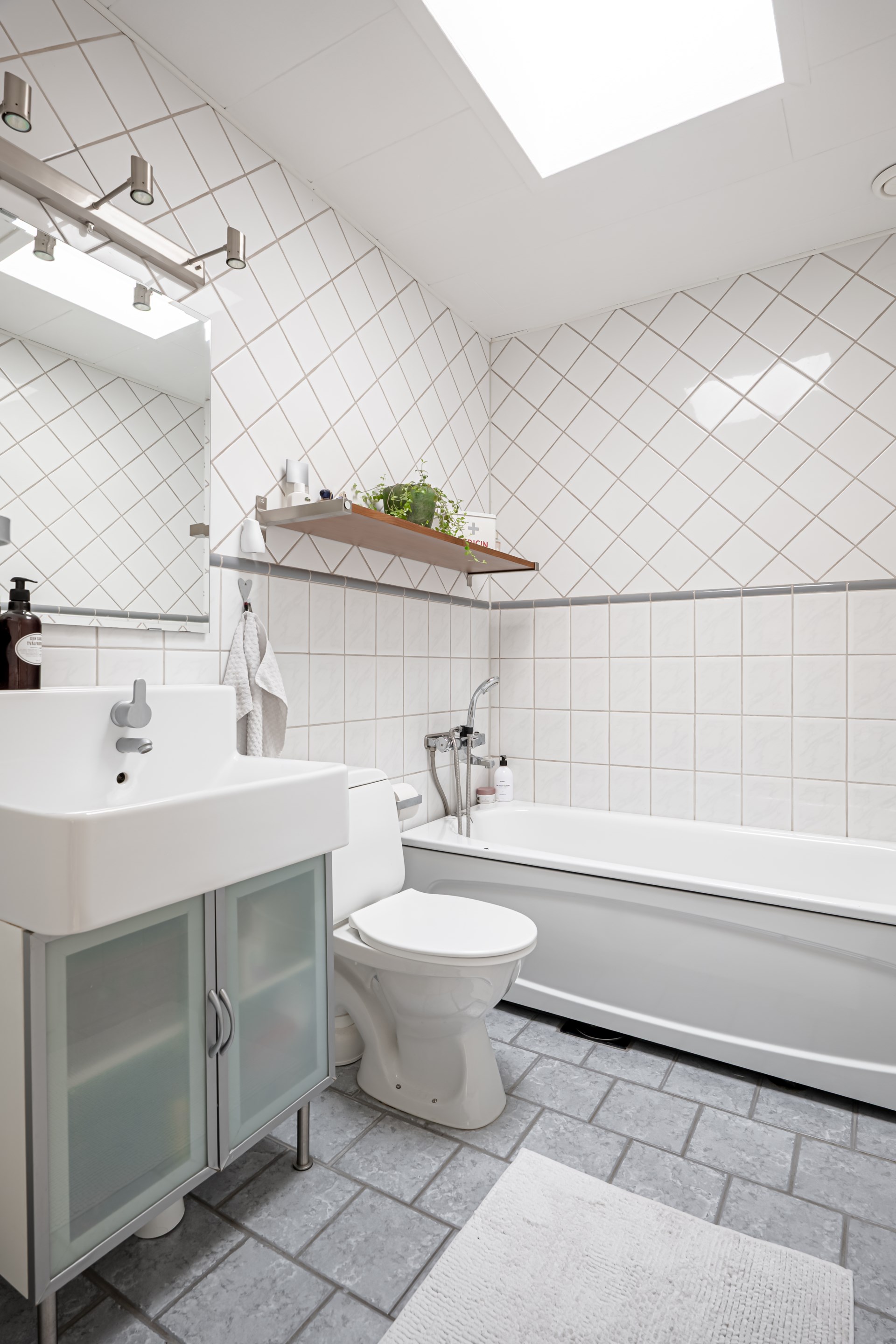- Badrum: På övre plan finner ni ett ljust badrum med klinker på golvet och kaklade väggar. I badrummet har ni kommod, spegel, toalett och badkar.