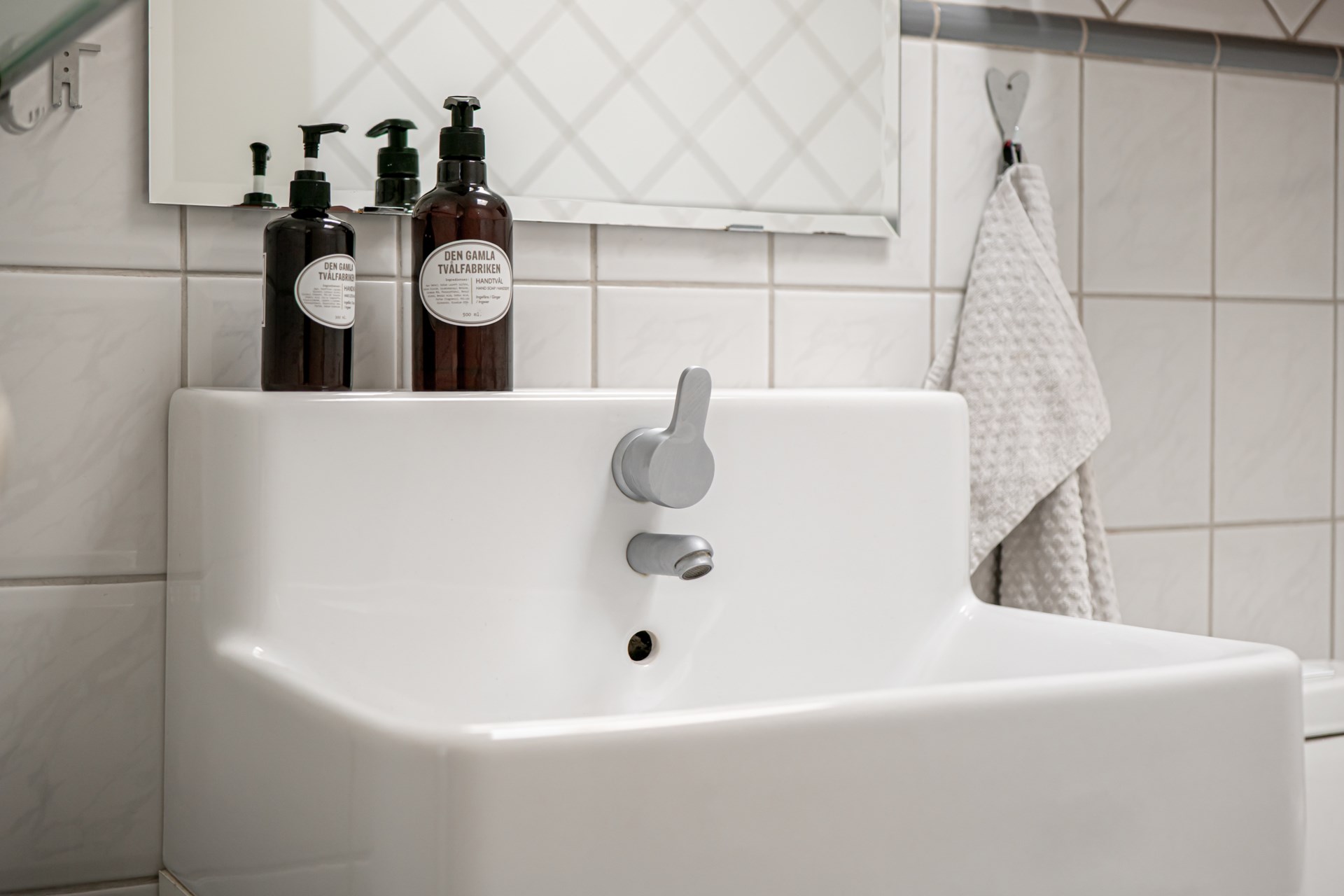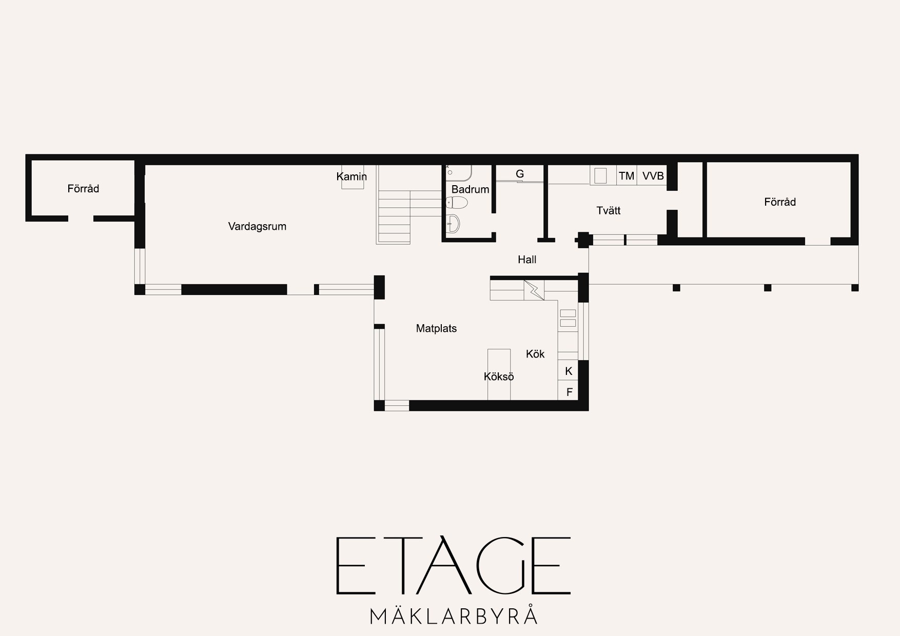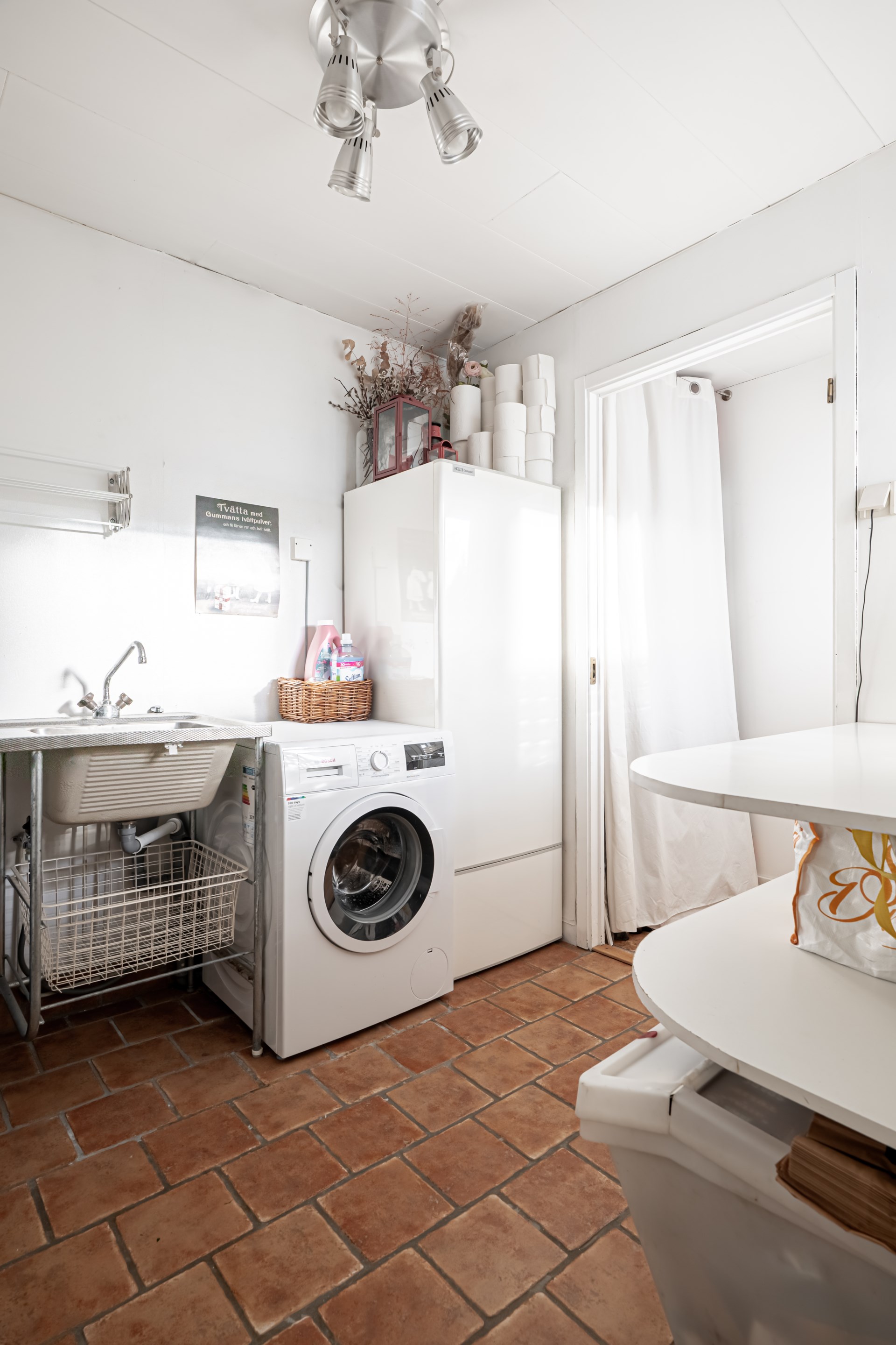 - Tvättstuga: Praktisk tvättstuga med klinker på golvet. Här finns tvättmaskin och tvättho.