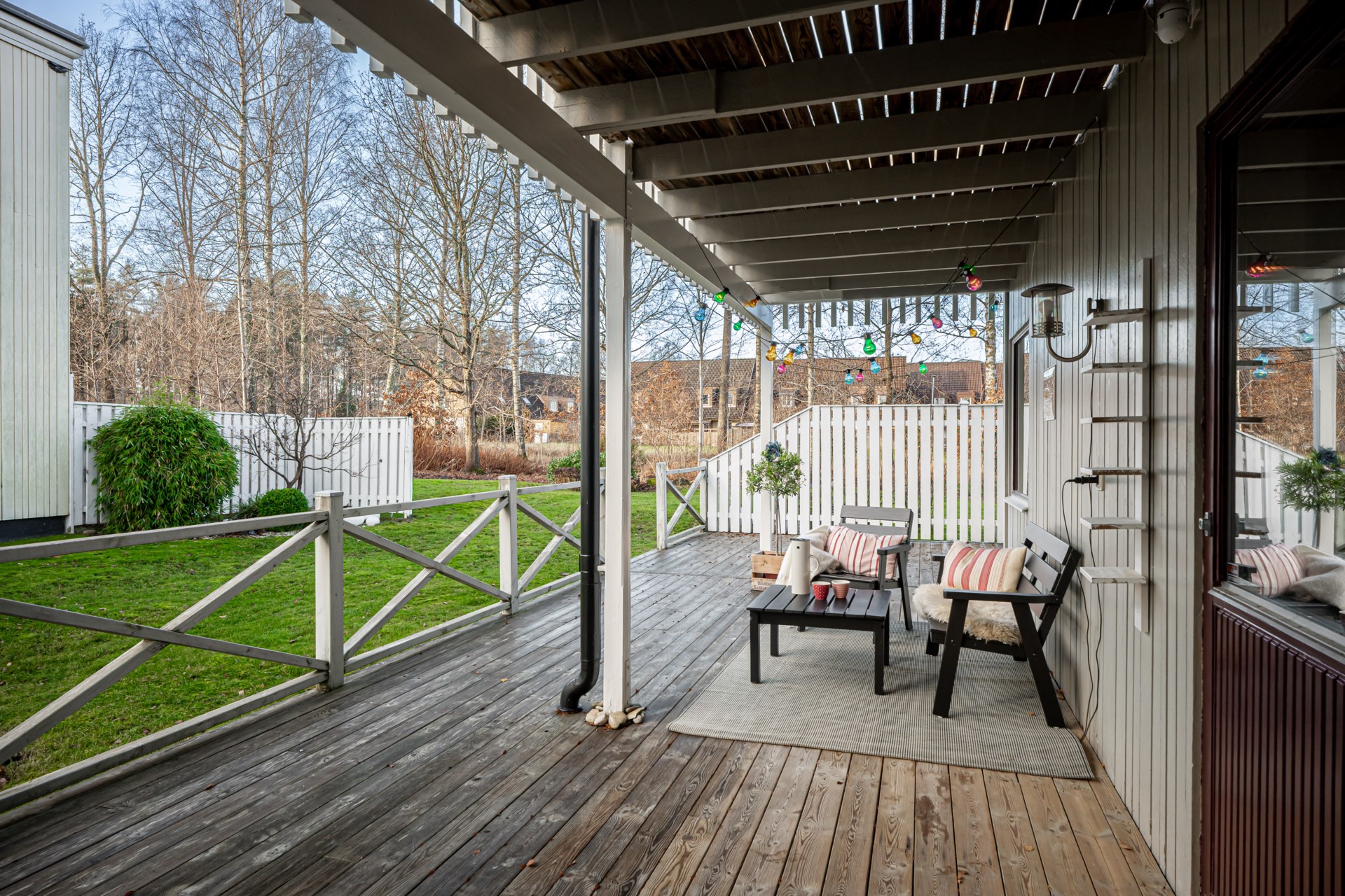 Huset läge är också ett stort plus då baksidan angränsar mot grönområde. Det gör att ni har en fri och härlig trädgård och på tomten har ni även två härliga altaner. En på framsidan där ni kan njuta om dagens första strålar ihop med morgonkaffet och en på sidan av huset där ni kan njuta av solen tills kvällen kommer.
