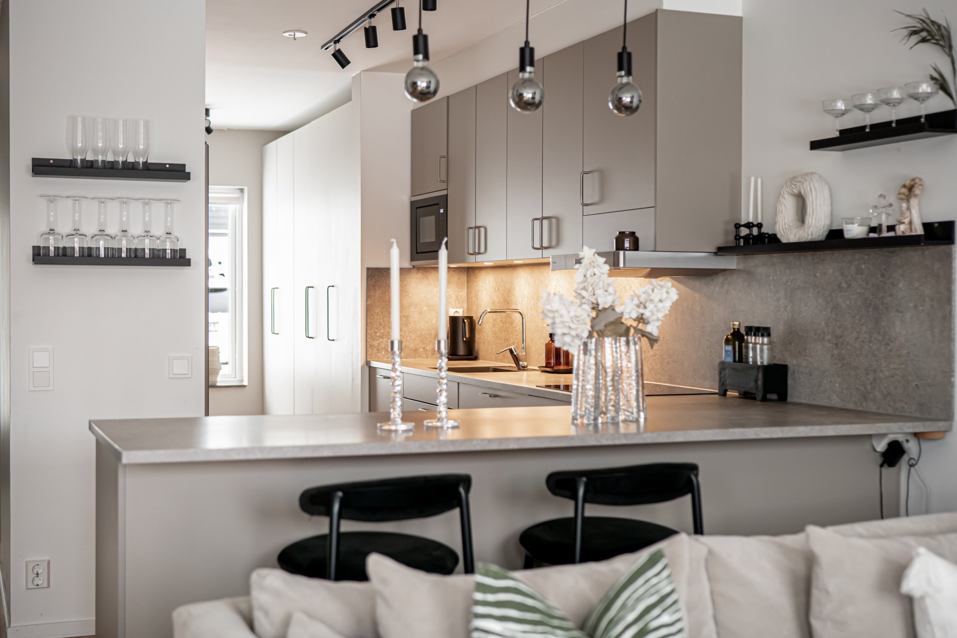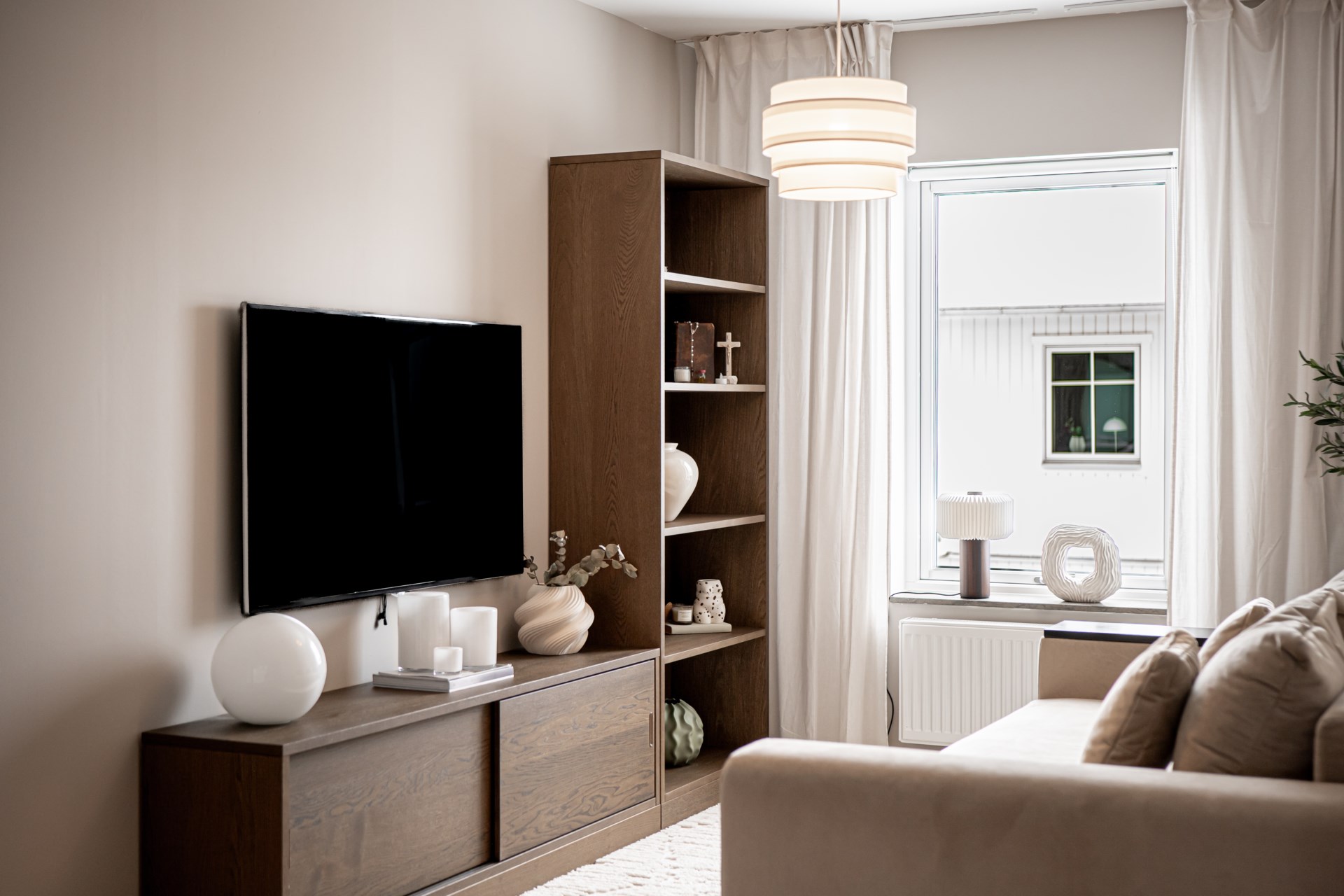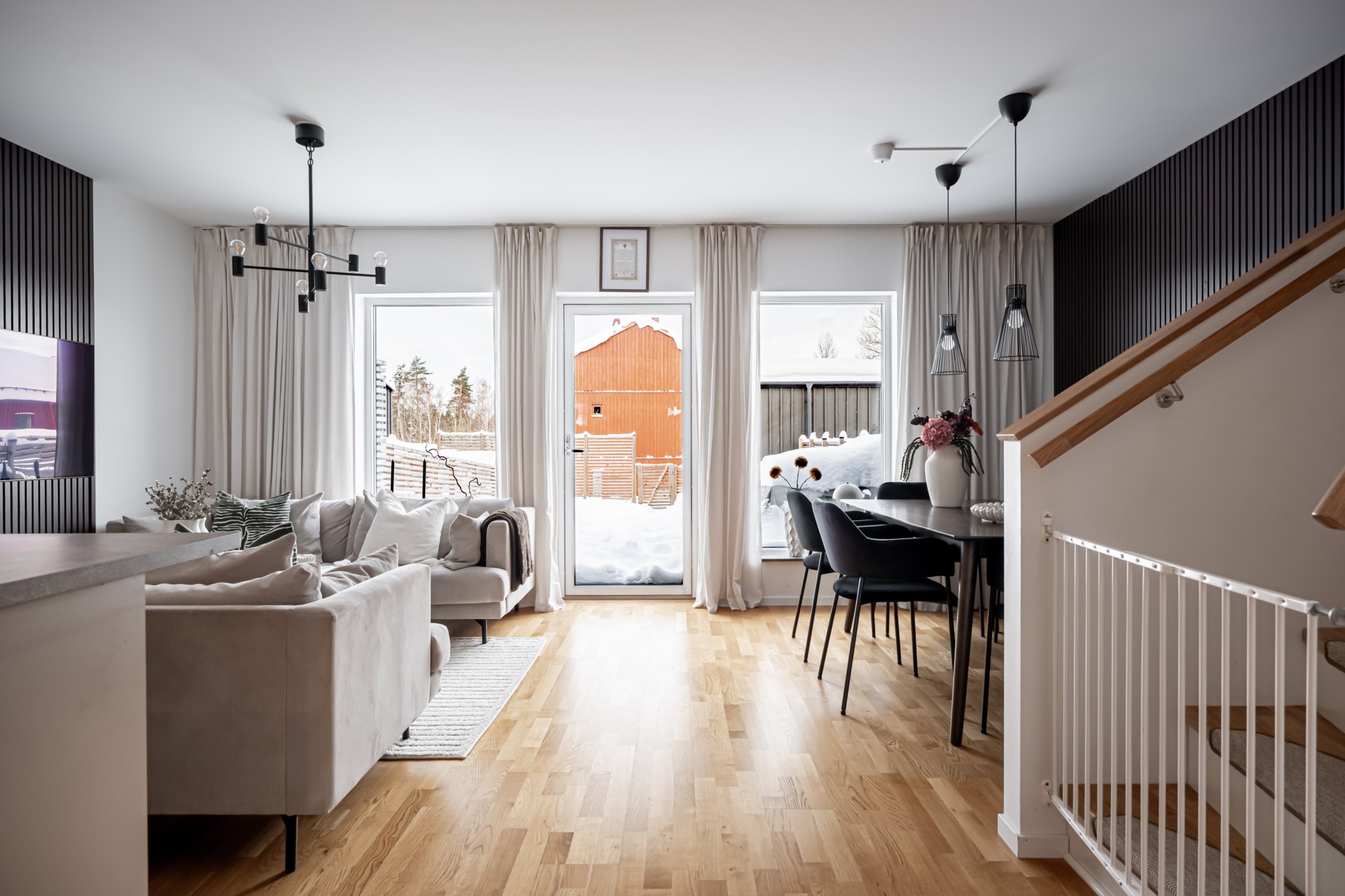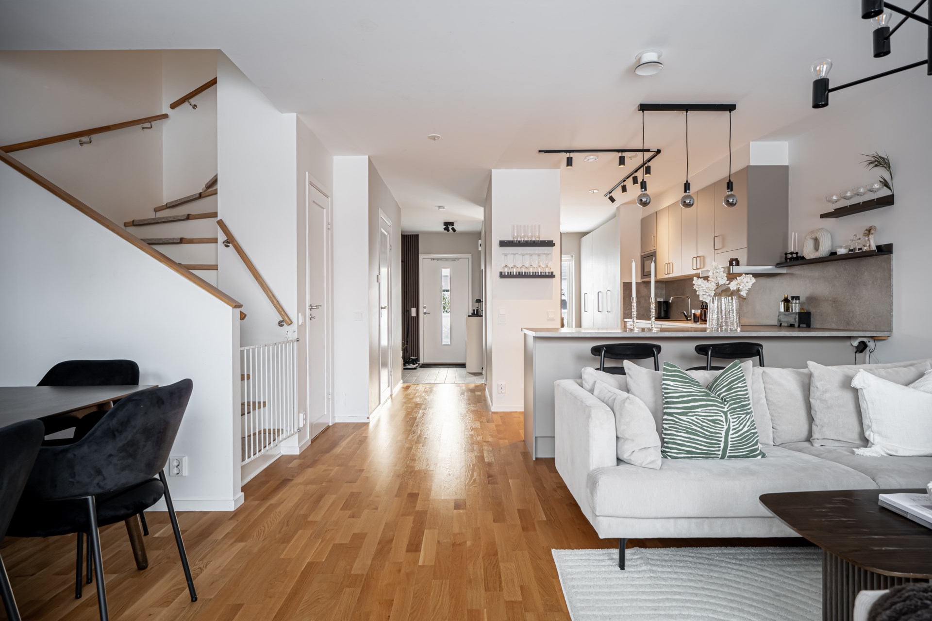 Vidare in i bostaden öppnar kök och vardagsrum upp sig med en fin och naturlig koppling mellan rummen. Färgvalen samspelar harmoniskt och skapar en enhetlig och trivsam känsla genom hela entréplanet. Vardagsrummet bjuder på ett härligt ljusinsläpp från stora fönster mot trädgården och erbjuder gott om plats för både soffgrupp och matbord.