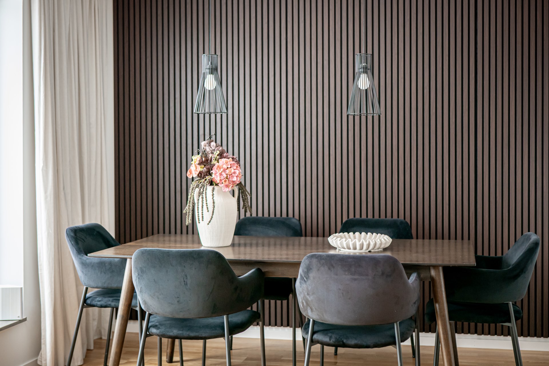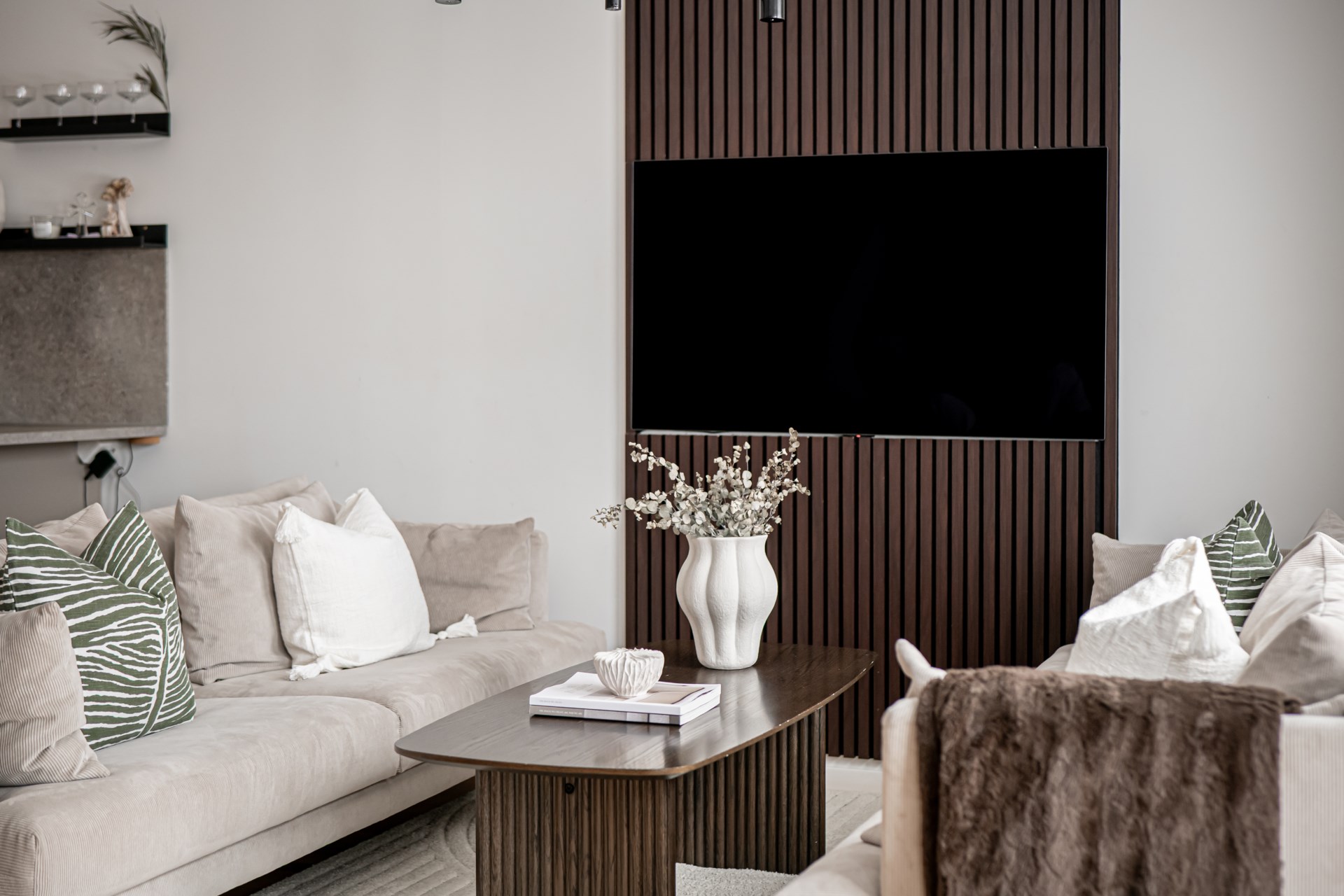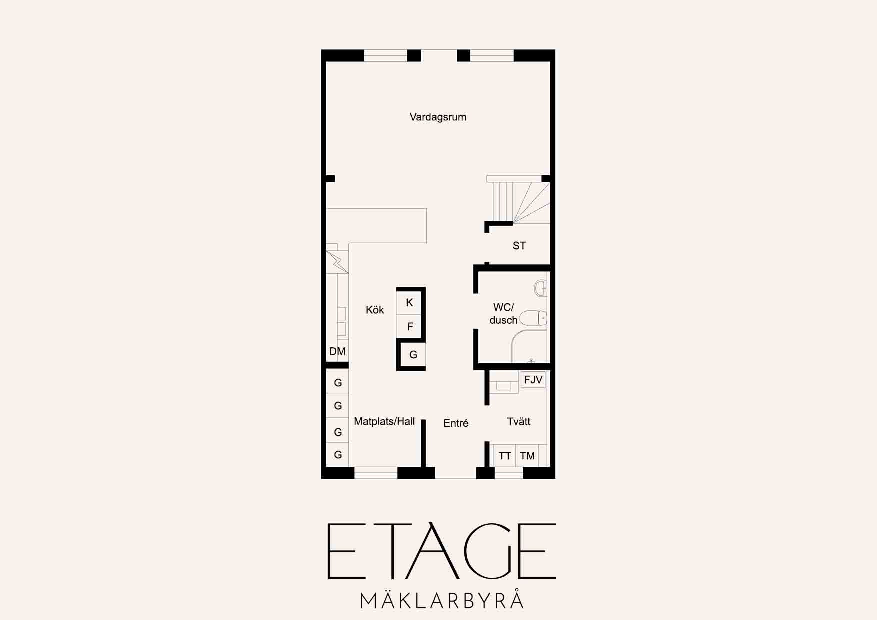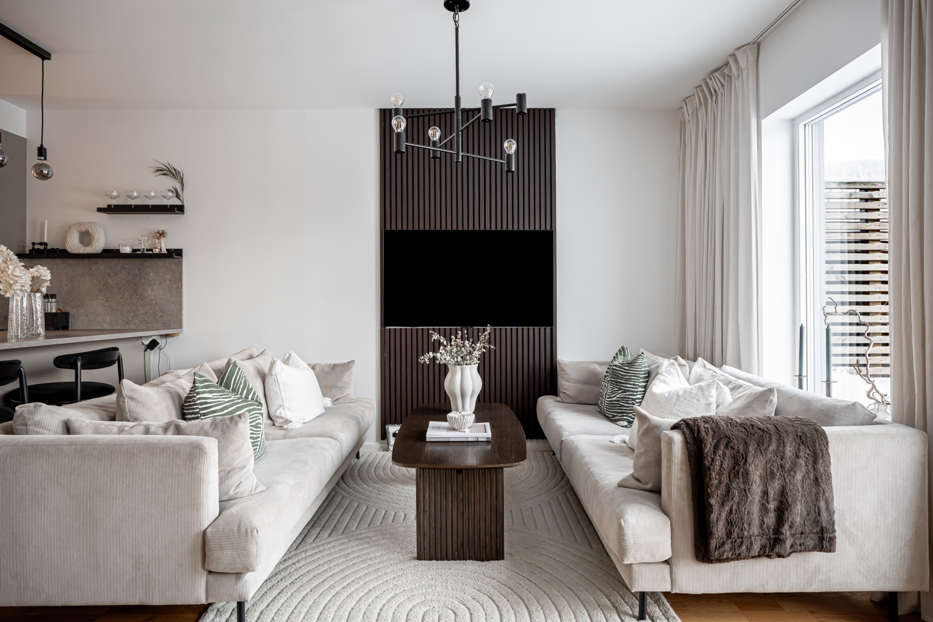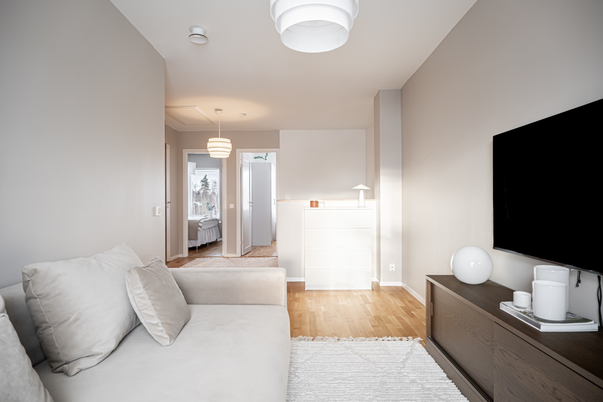 Vidare in i bostaden öppnar kök och vardagsrum upp sig med en fin och naturlig koppling mellan rummen. Färgvalen samspelar harmoniskt och skapar en enhetlig och trivsam känsla genom hela entréplanet. Vardagsrummet bjuder på ett härligt ljusinsläpp från stora fönster mot trädgården och erbjuder gott om plats för både soffgrupp och matbord.