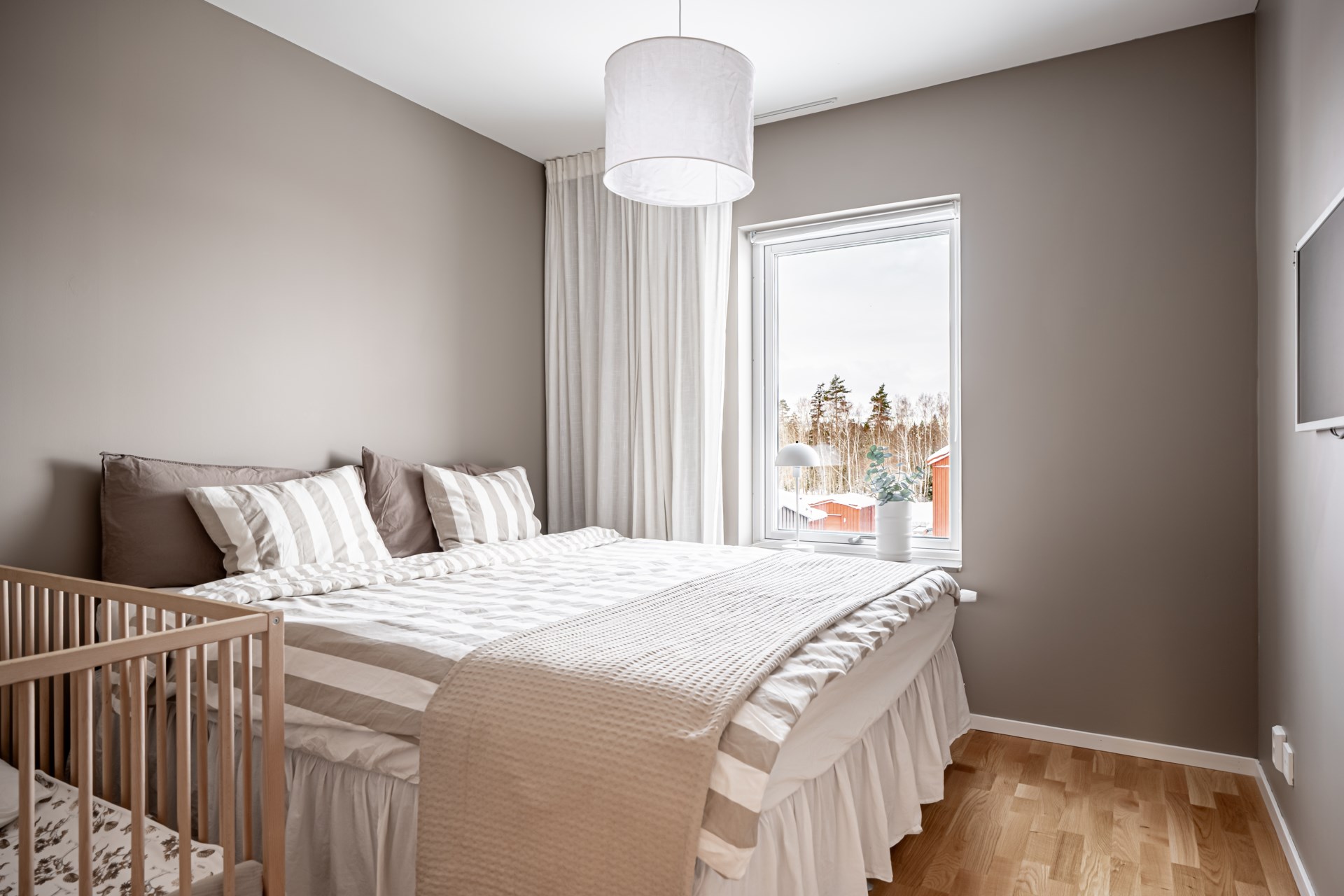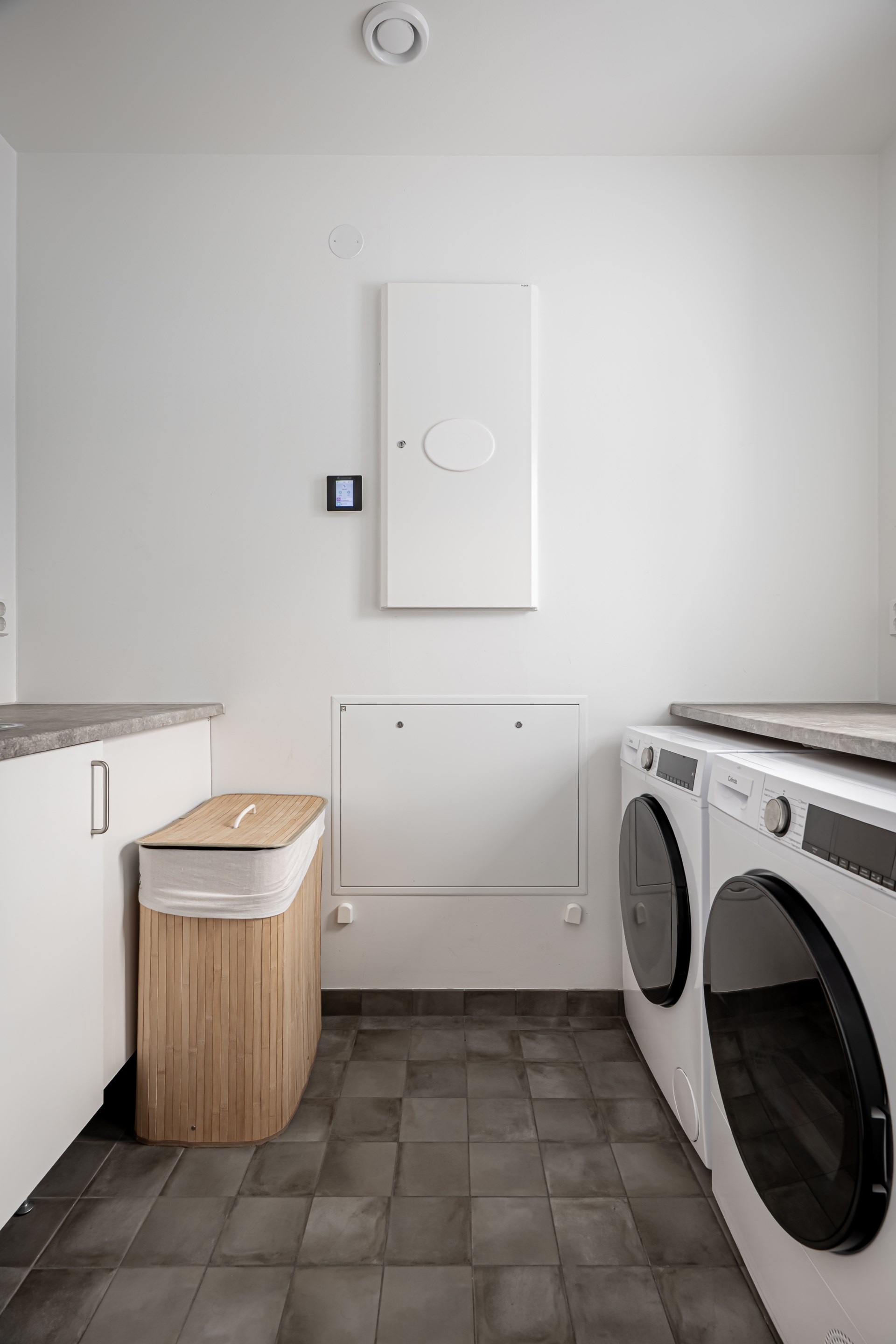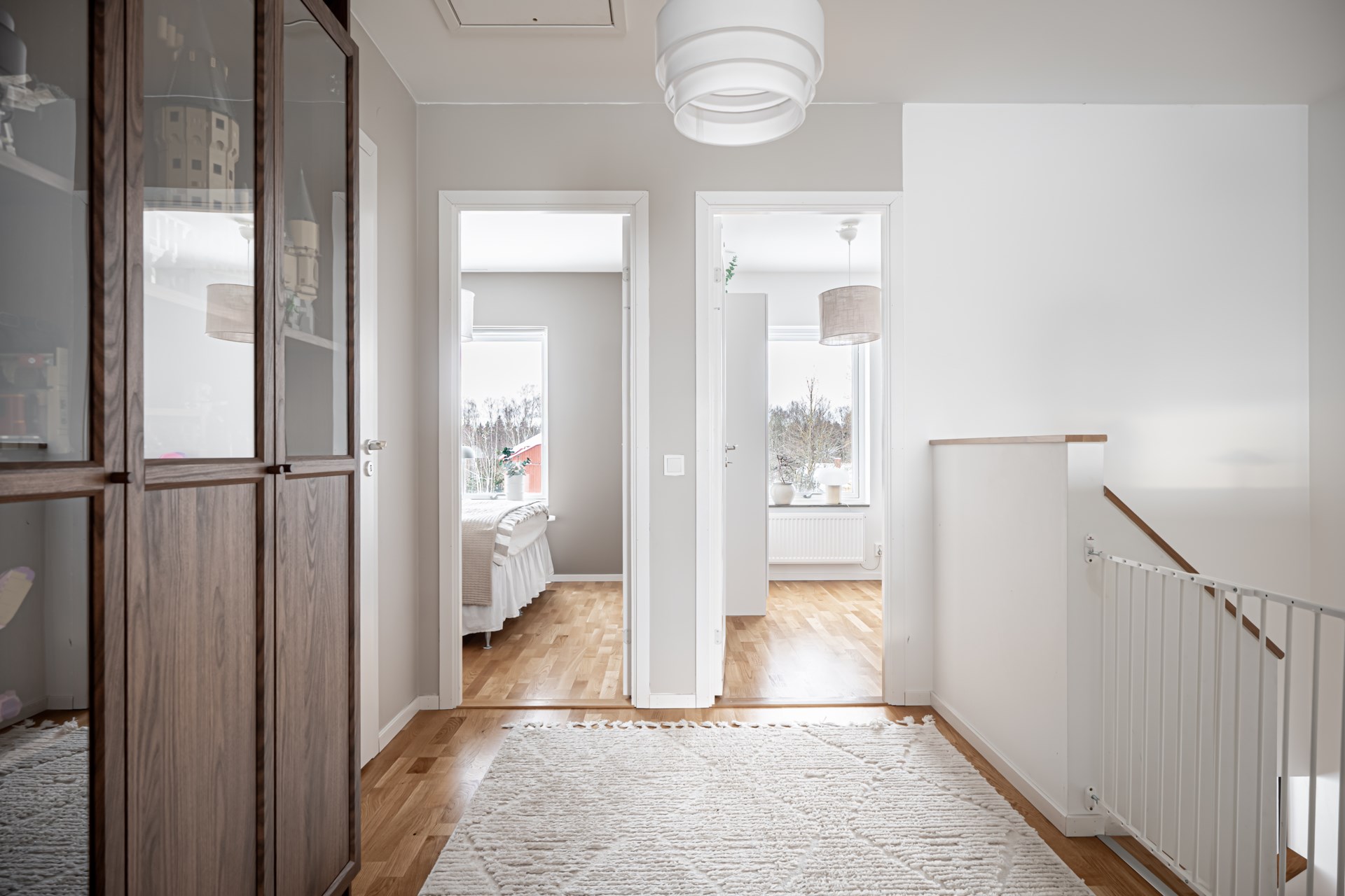 En trappa upp väntar den mer privata delen av hemmet med ett trivsamt allrum, perfekt som familjens samlingsplats, TV-rum eller lekhörna. Här finns även tre sovrum i bra storlek. Det största sovrummet har plats för dubbelsäng och erbjuder dessutom en praktisk klädkammare, medan de övriga två lämpar sig utmärkt som barnrum, gästrum eller hemmakontor. - Tvättstuga: Ljus tvättstuga med bra bänkyta. I tvättstugan har ni tvättmaskin, torktumlare och tvättho.