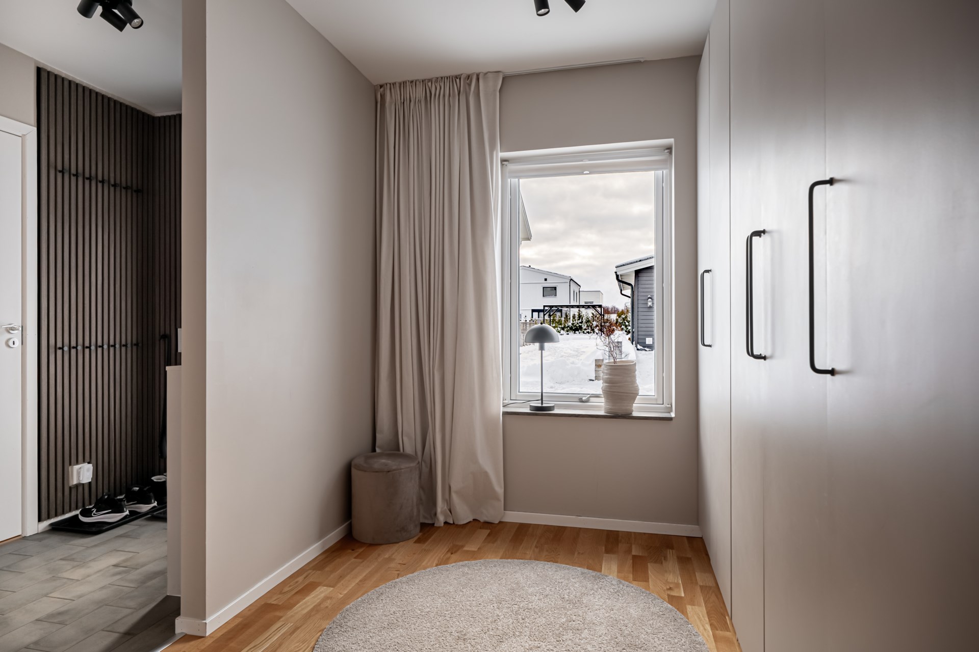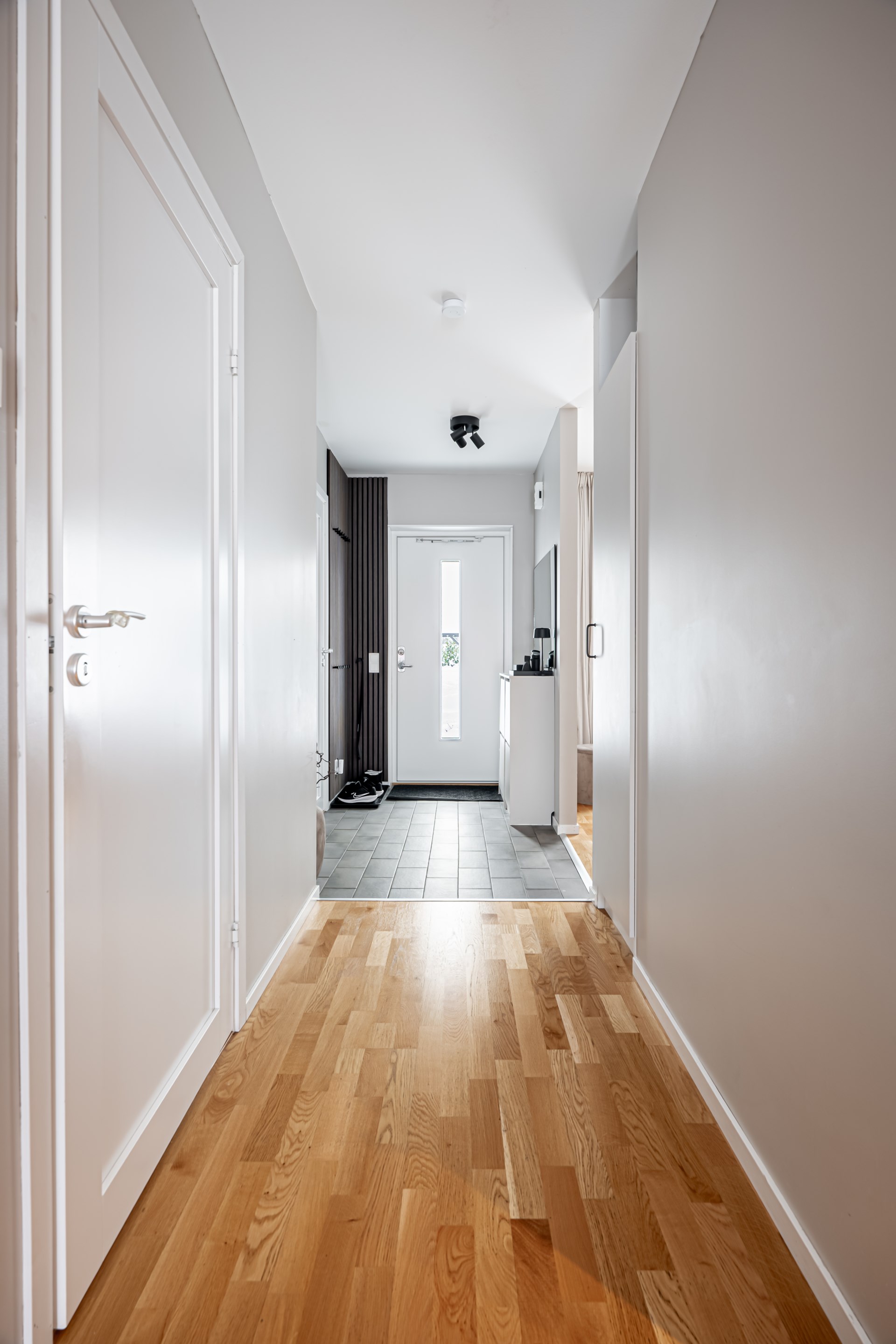 På vänster sida om hallen finns ett flexibelt utrymme som idag nyttjas som en extra hall med garderober längs ena väggen. Här finns även möjlighet att skapa en matplats, en arbetsplats eller en mysig hörna, ett utrymme som enkelt anpassas efter behov och livsstil.