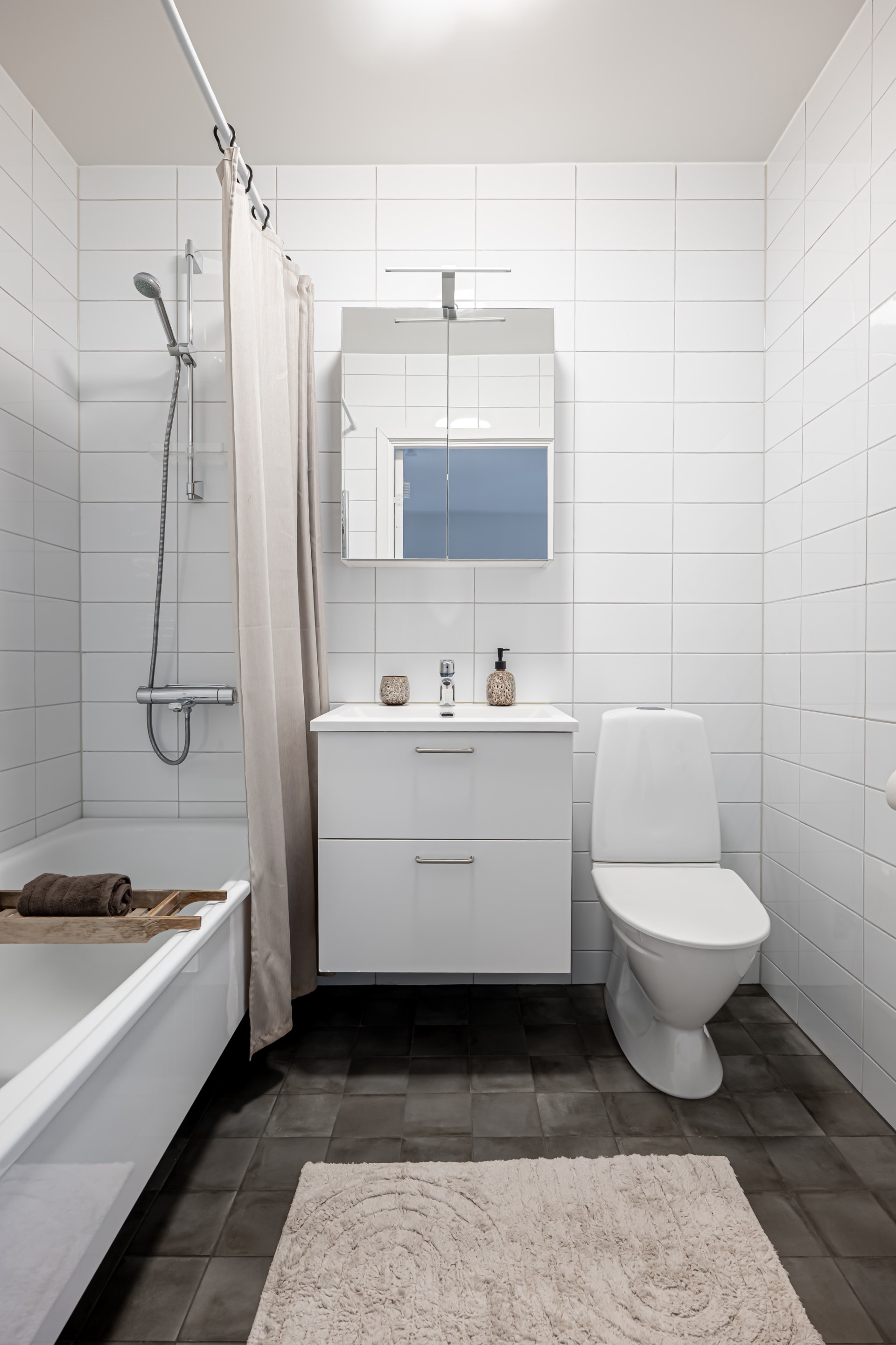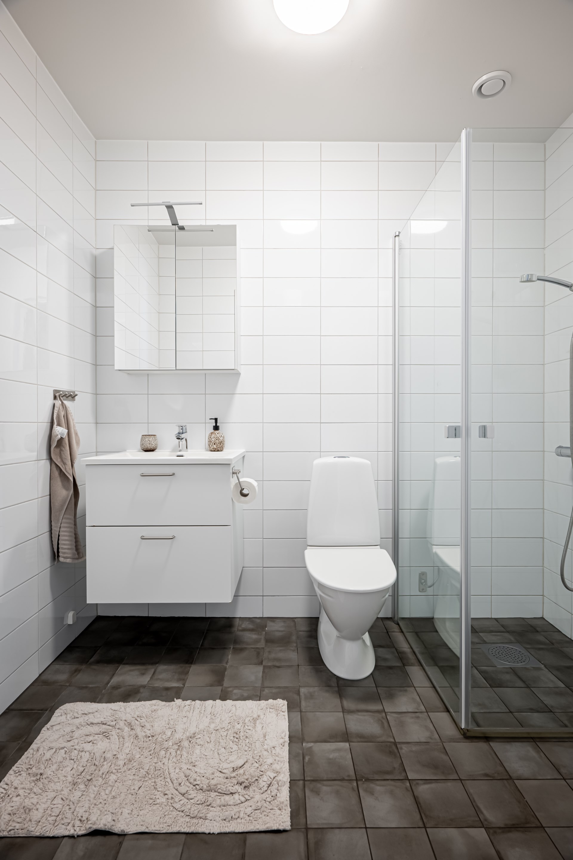 - Badrum: Badrum med ljust kaklade väggar och ett mörkare klinkergolv. I badrummet har ni toalett, kommod, spegelskåp och en dusch.