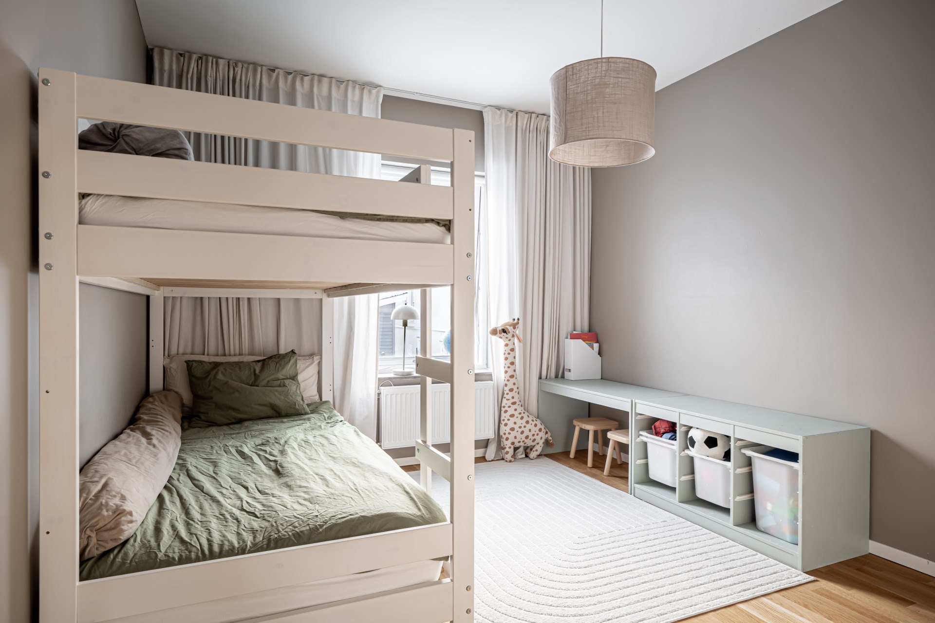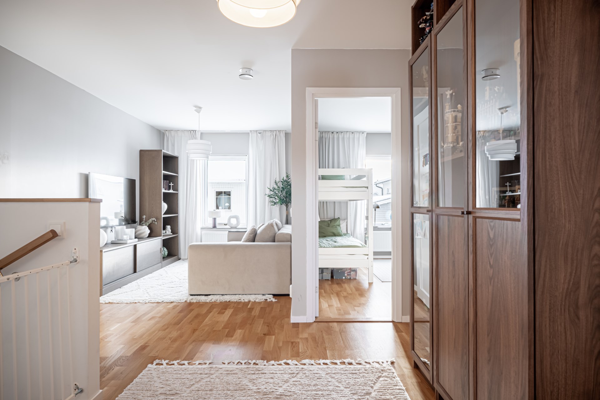 En trappa upp möts du av ett trivsamt allrum som blir en naturlig samlingsplats för familjen, perfekt som TV-rum, lekhörna eller lugn läshörna. Här finns även tre rogivande sovrum i bra storlek som ger gott om plats för både familjeliv och hemmakontor.