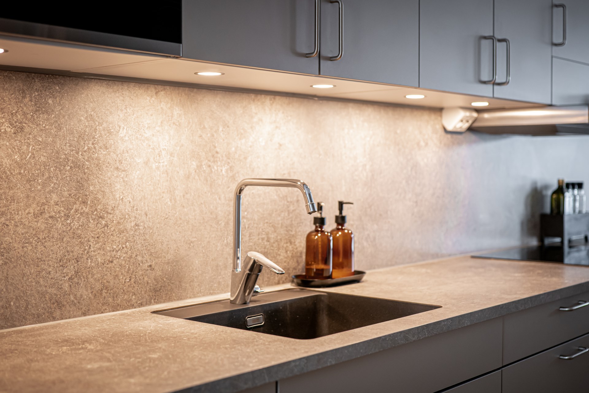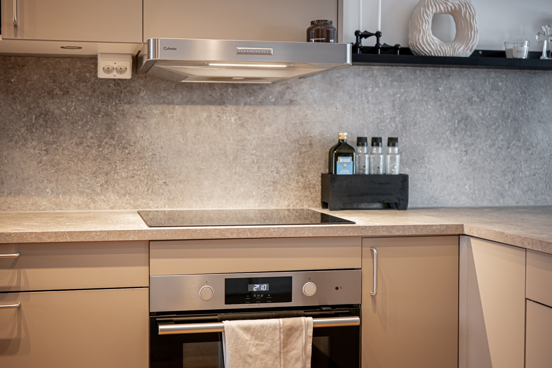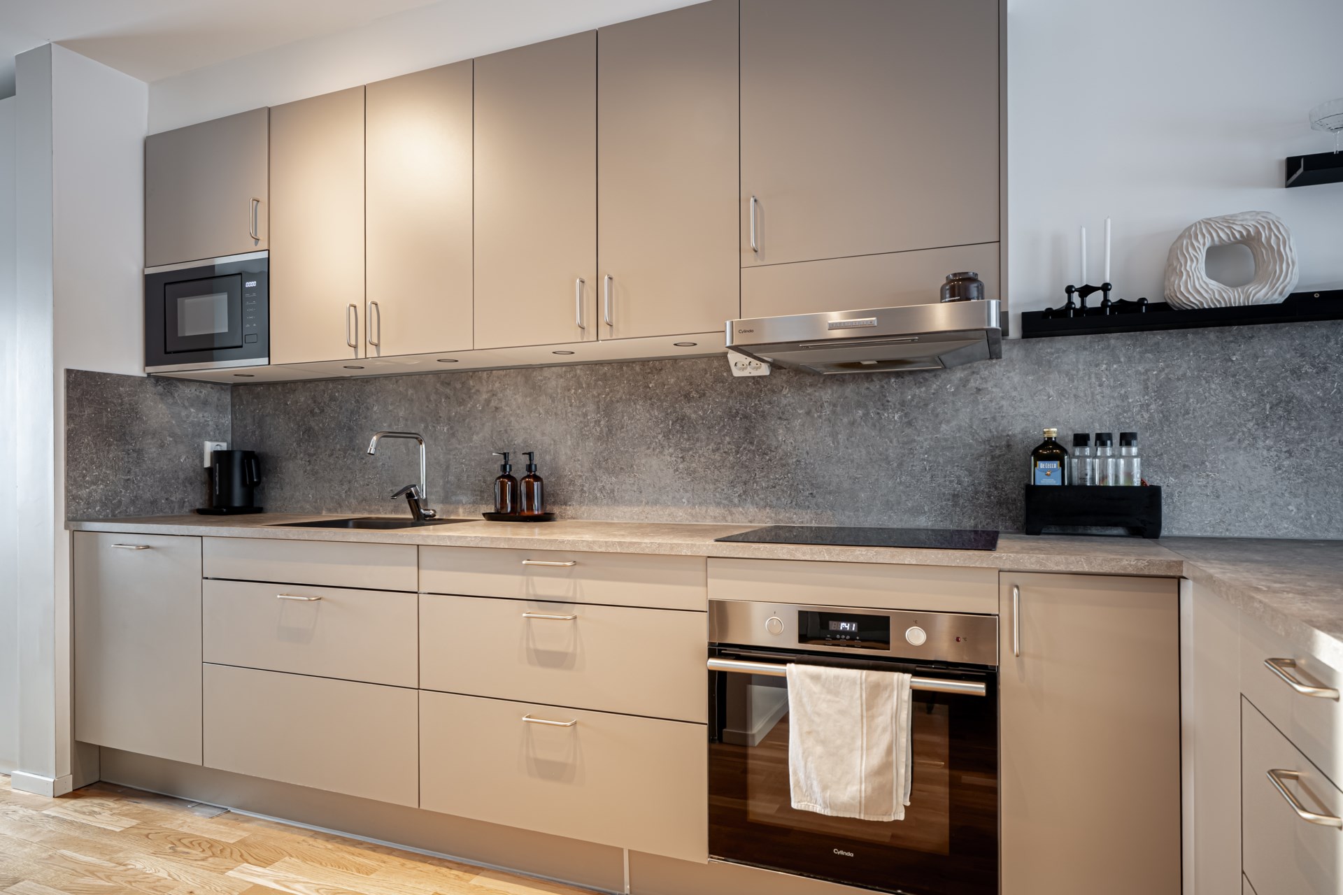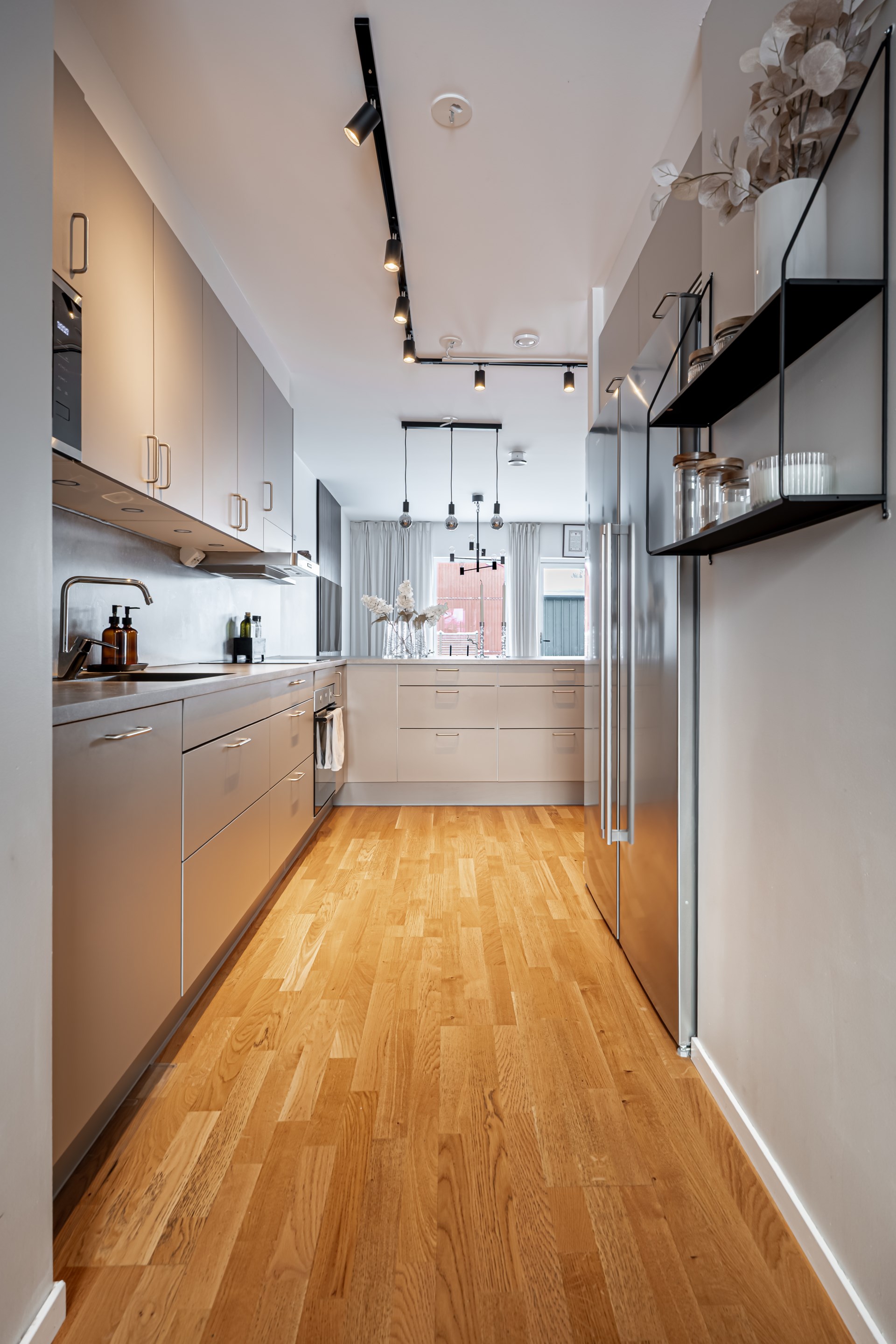 - Kök: Modernt och fint kök med släta luckor. Köket har en bra bänkyta tack vare utformningen mot vardagsrummet. Köket är utrustat med spishäll, ugn, fläkt, inbyggd micro, integrerad diskmaskin samt kyl och frys i fullhöjd.