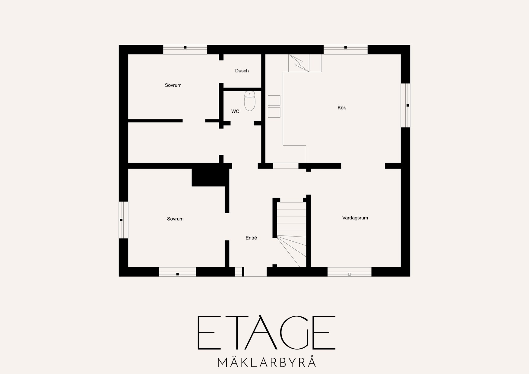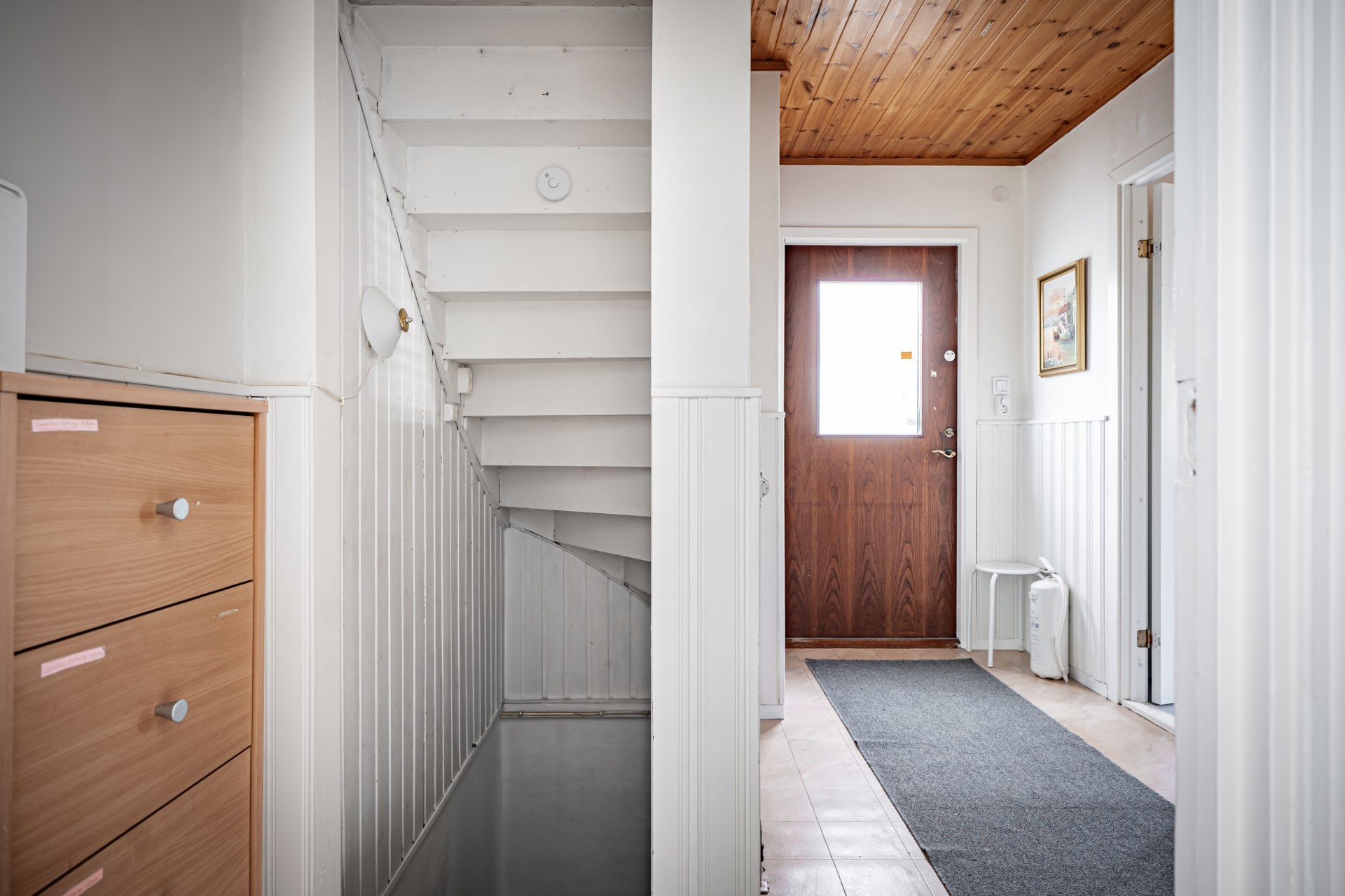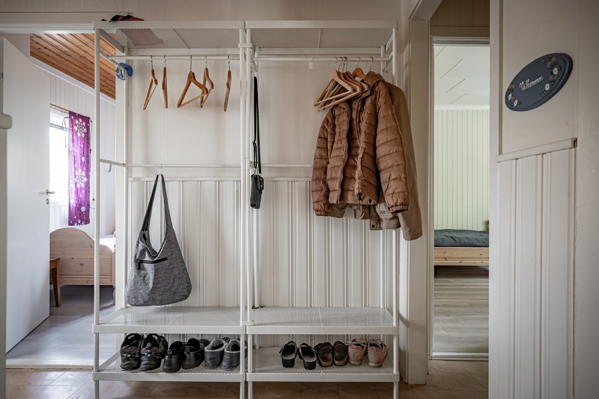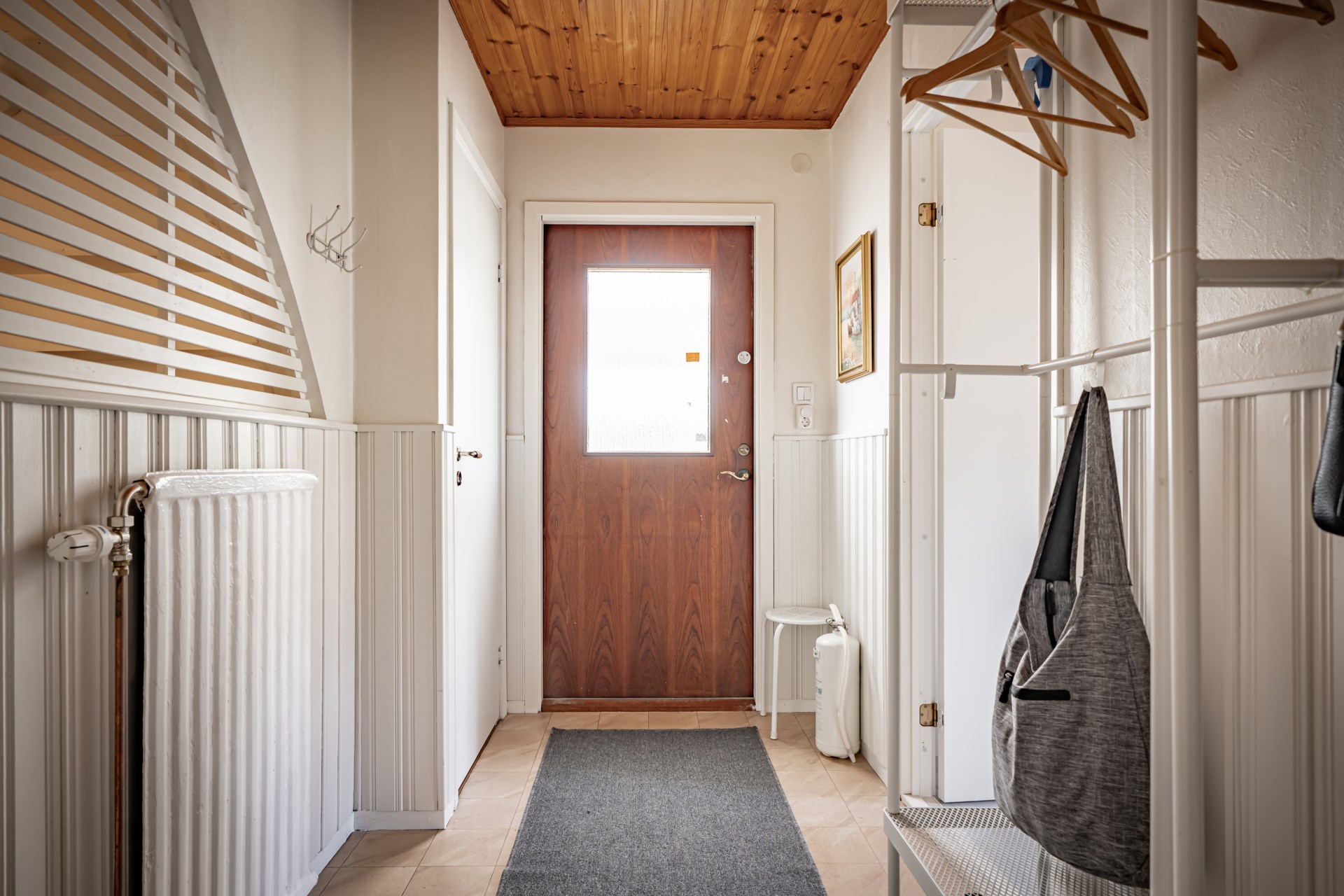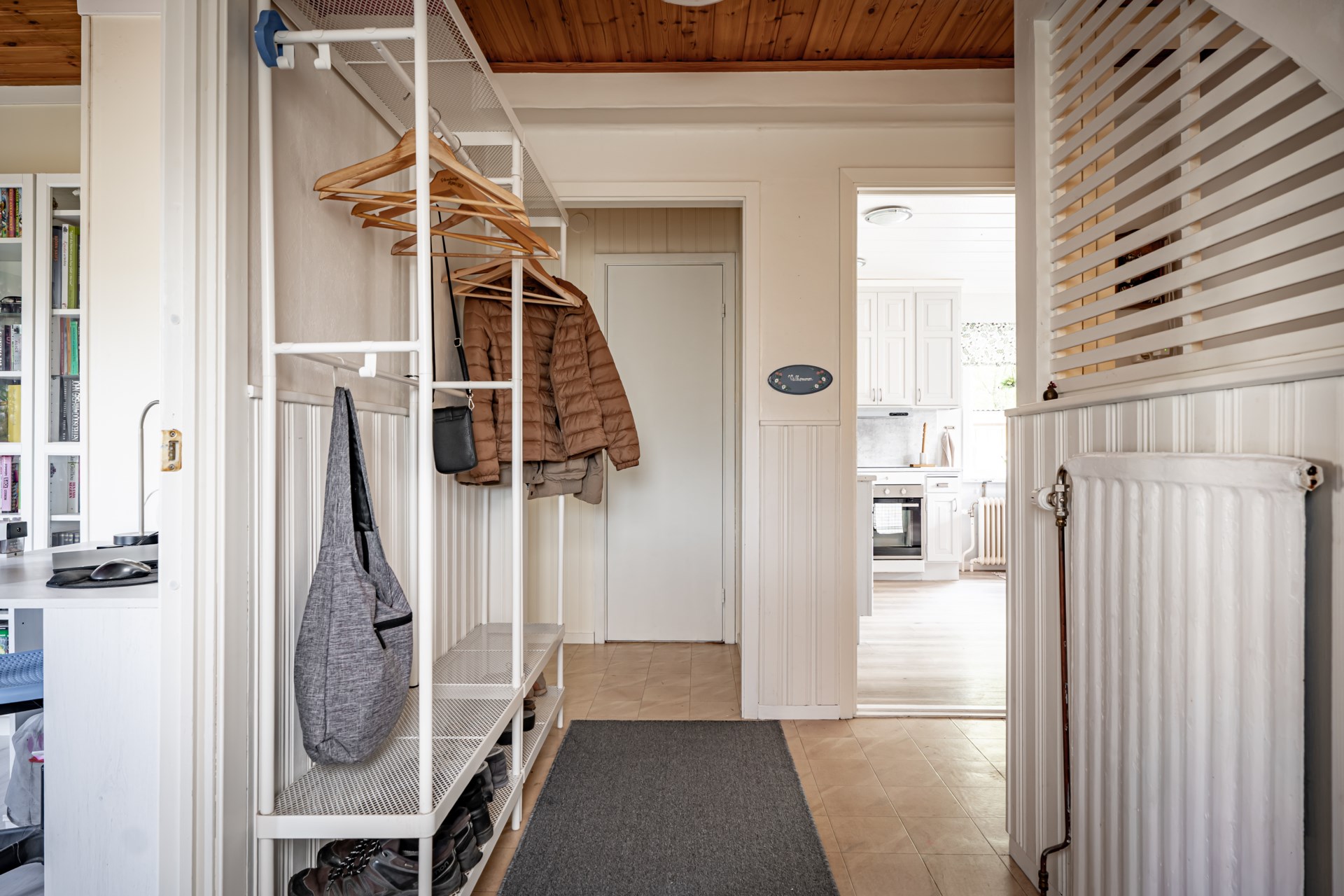 - Allmän beskrivning: Välkomna in i en praktisk hall med klinker på golvet och ljusa väggar. På vänster sida om hallen har ni husets två första sovrum, båda i bra storlek och med plats för dubbelsäng. Från det ena sovrummet når ni ett duschrum. Rakt fram från hallen har ni en gäst-WC. På andra sidan entréplan finner ni kök och vardagsrum. Vardagsrummet är ljust och här har ni plats att möblera med soffa och tv-möbel.